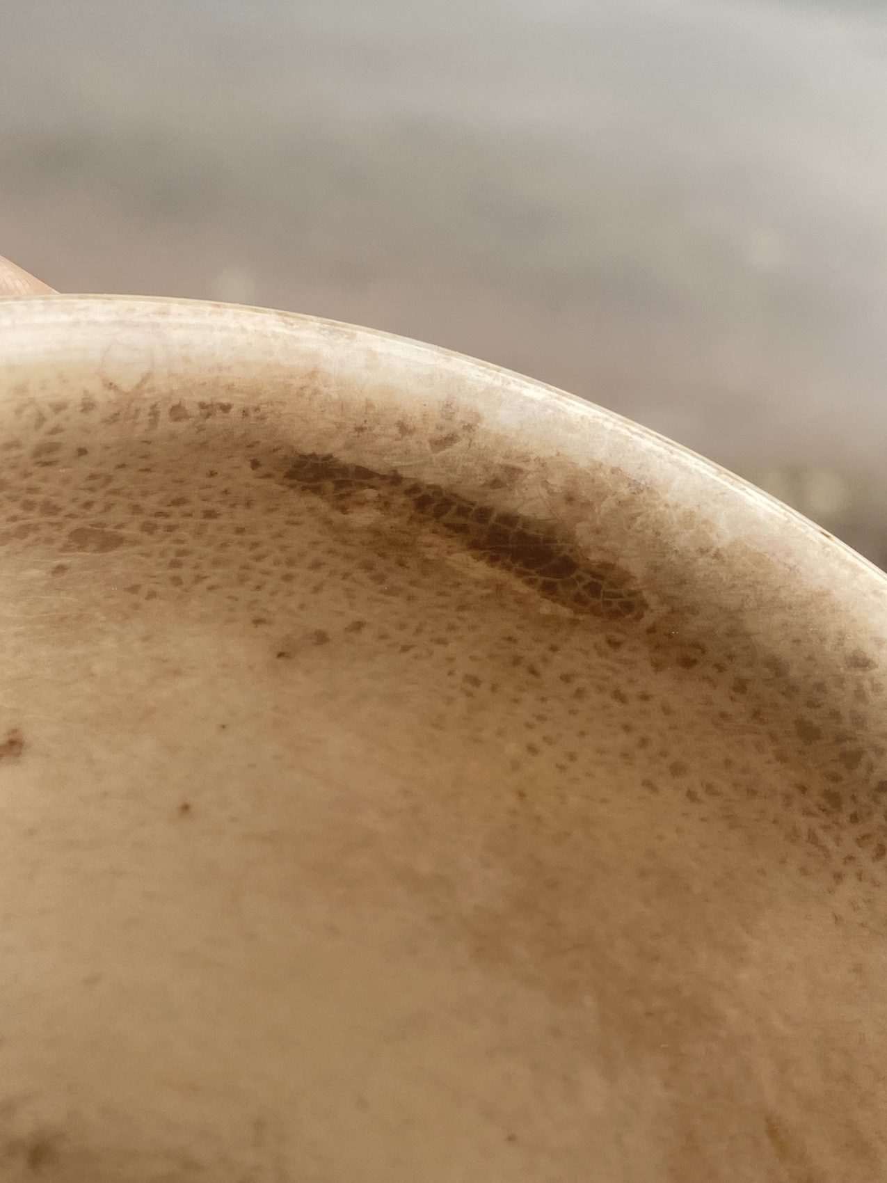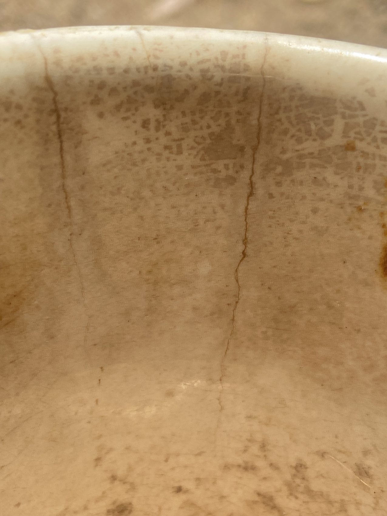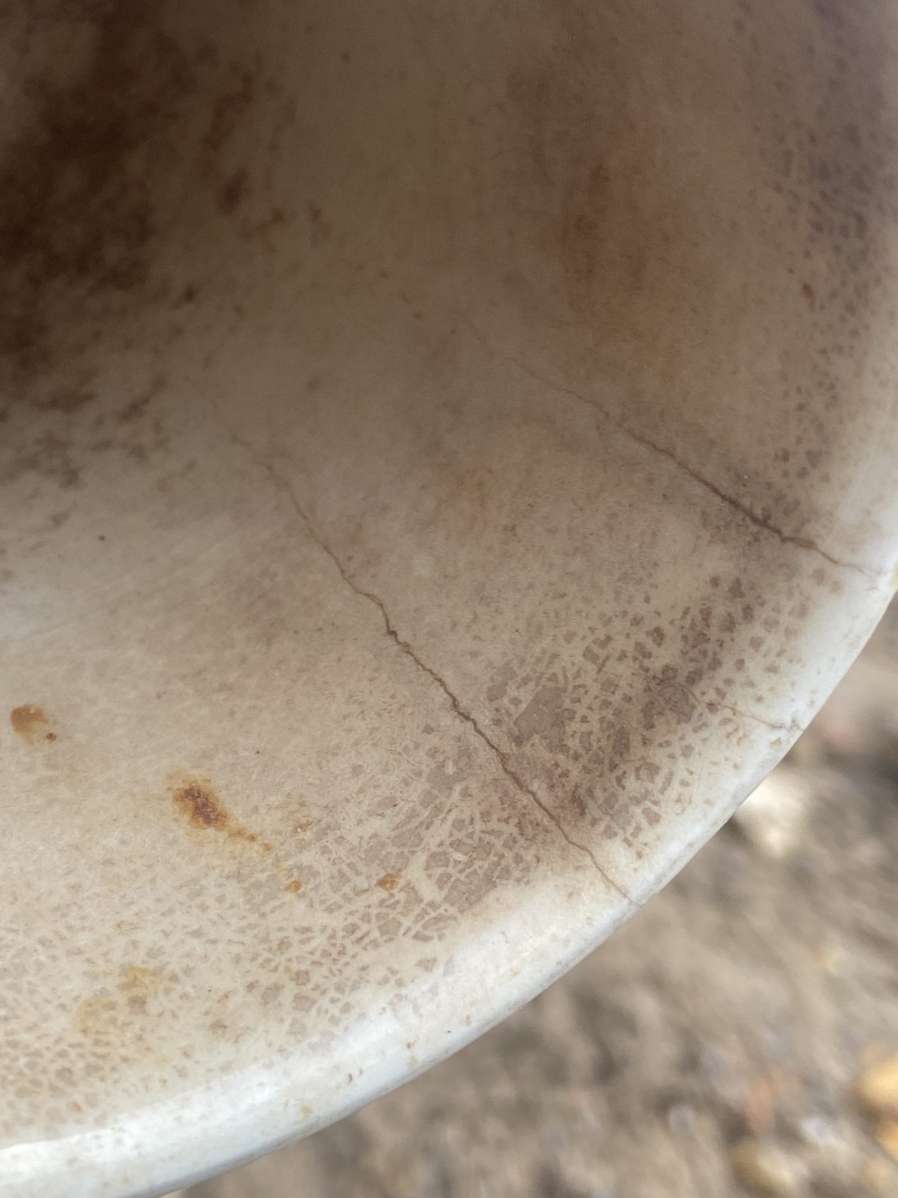 Il présente une patine intérieure et extérieure ainsi qu’un cheveu d’environ 6 cm partant du bord.