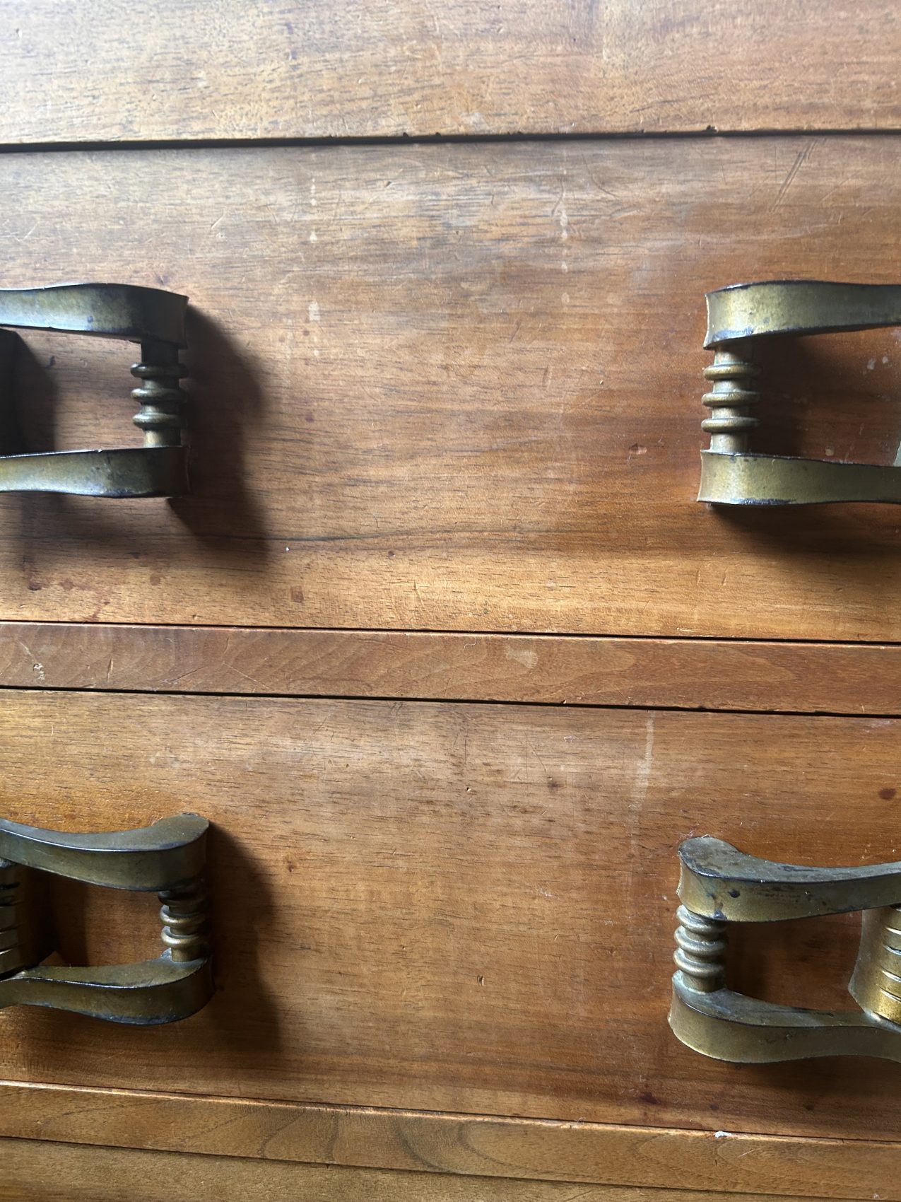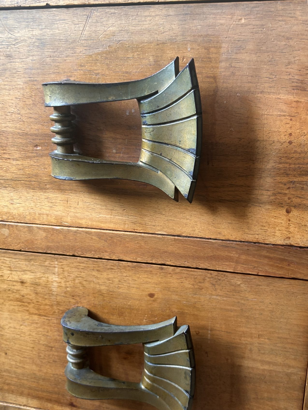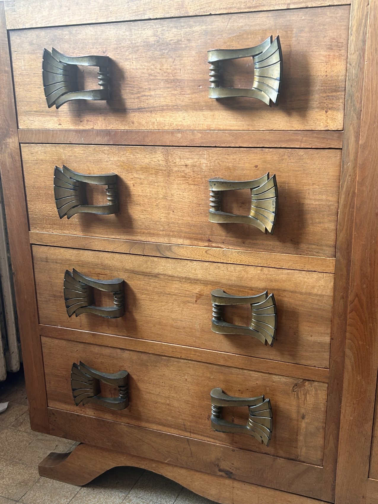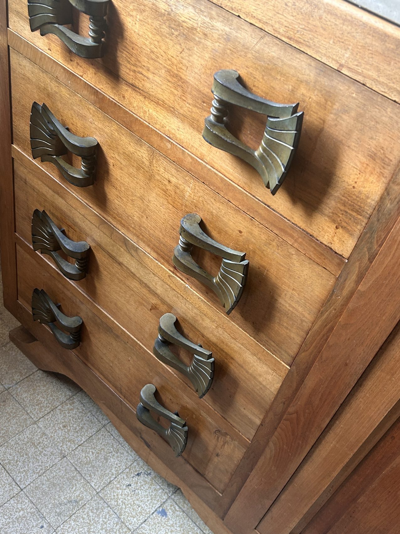 - D’une commode 4 tiroirs aux façades en noyer, équipées de poignées en bakélite (l’ancêtre du plastique, très utilisé dans les années 30 pour son côté moderne et innovant).