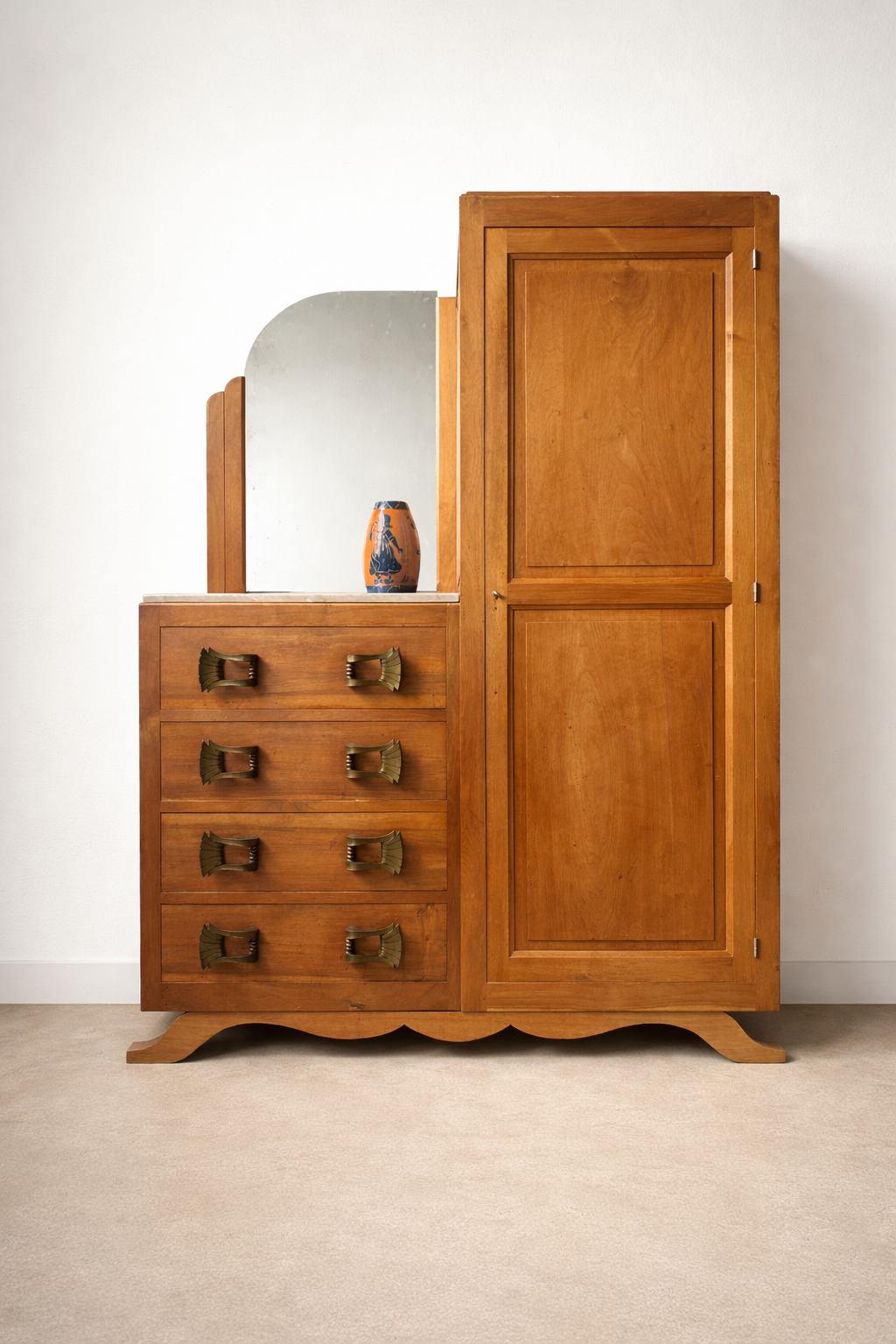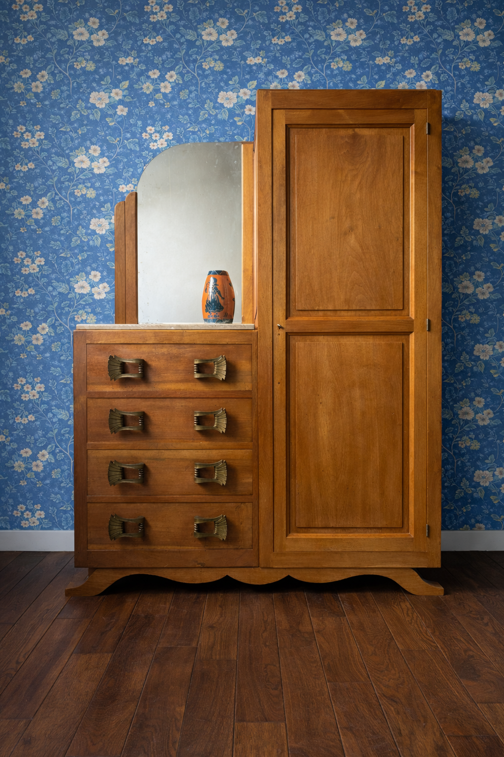 Voici une armoire asymétrique époque art déco en noyer, composée d’une partie commode à 4 tiroirs et d’une partie penderie. Un meuble intelligent, élégant et terriblement décoratif.