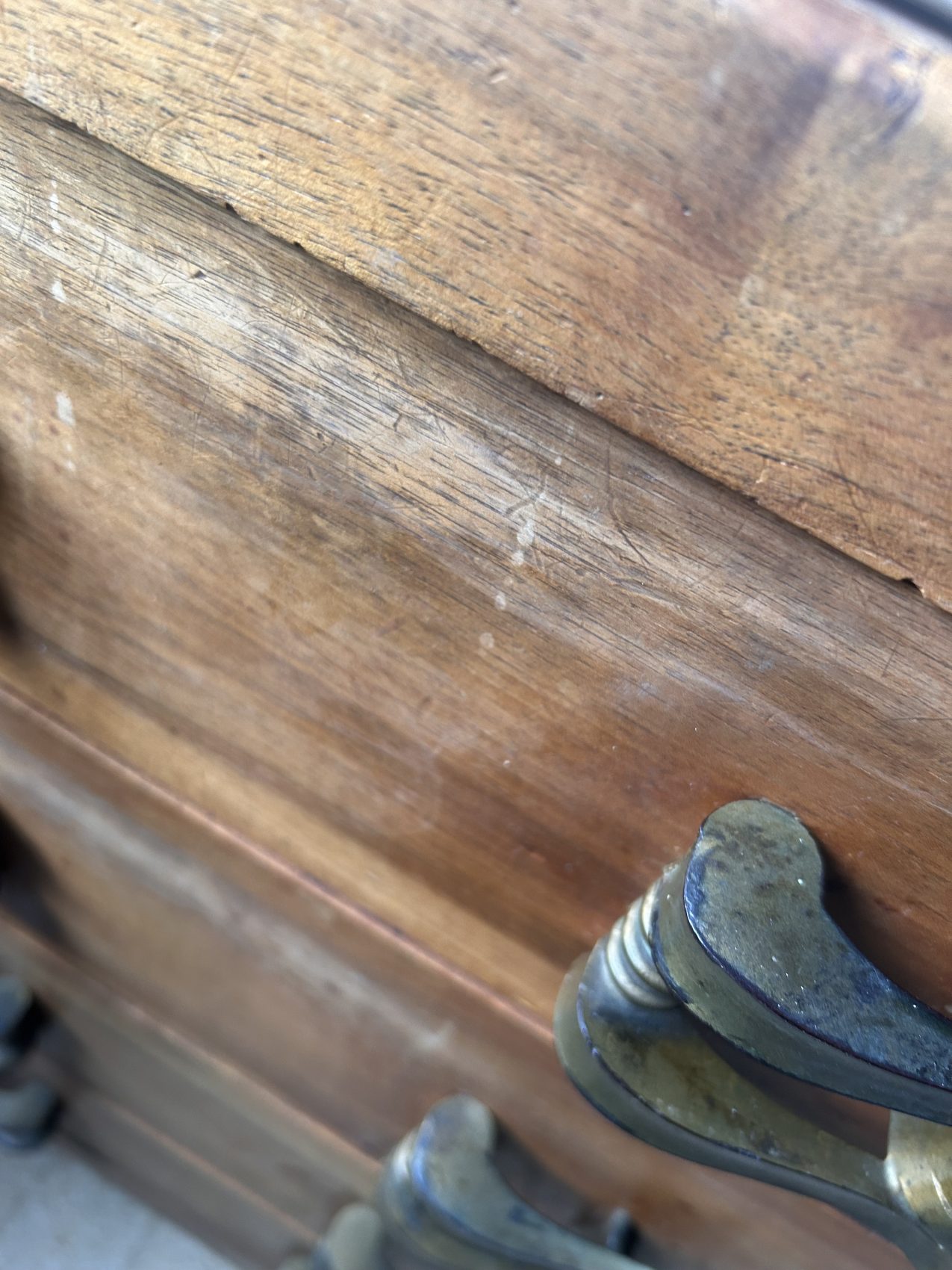 - Quelques traces du temps sont visibles, notamment de légères variations sur le vernis, normales pour un meuble de cette époque.