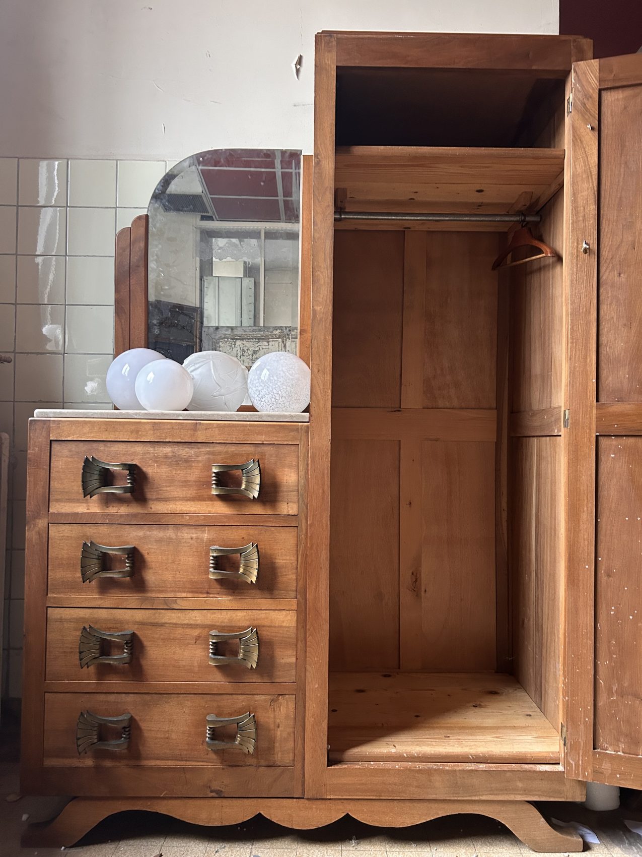 C’est un meuble rare, un peu atypique et clairement apprécié et recherché.Les armoires asymétriques art déco en noyer ne courent pas les rues.Je la vois parfaitement dans une entrée, dans une chambre ou même dans un espace boutique. Elle structure une pièce immédiatement.