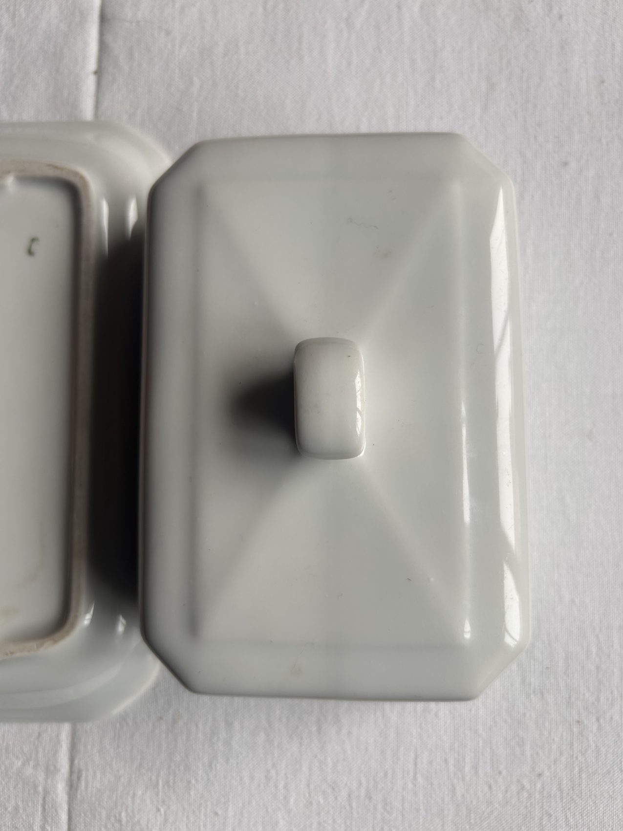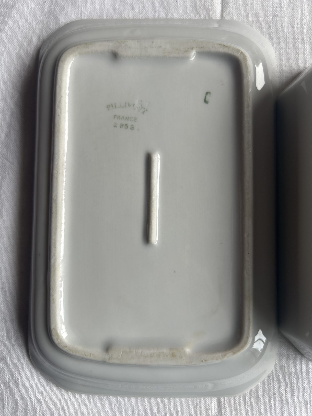C’est un beurrier ancien de la maison Pillivuyt, une référence française dans l’univers de la céramique culinaire. Une pièce à la fois utile et décorative, qui trouve naturellement sa place sur une table du quotidien comme sur une table de fête.
