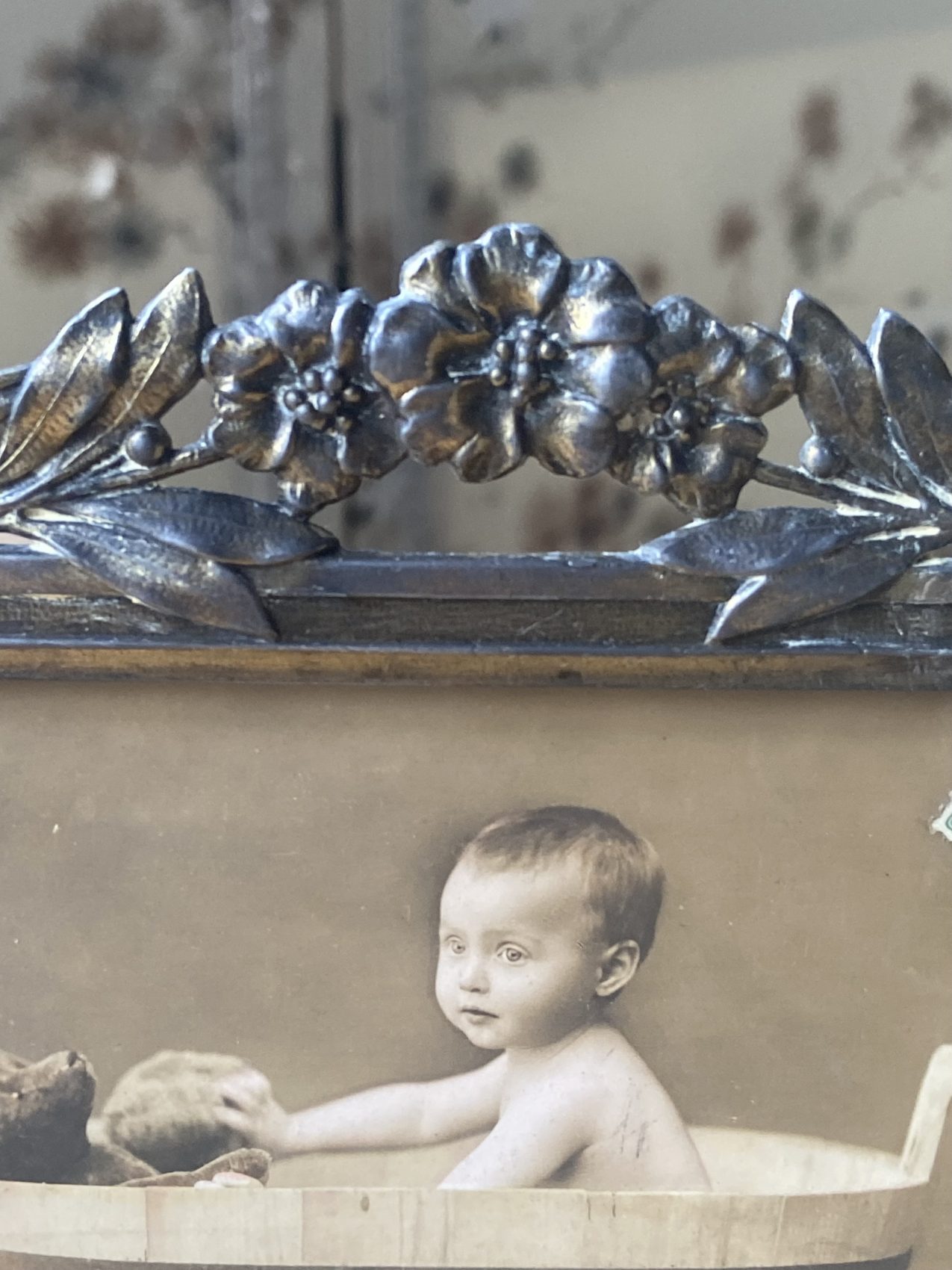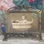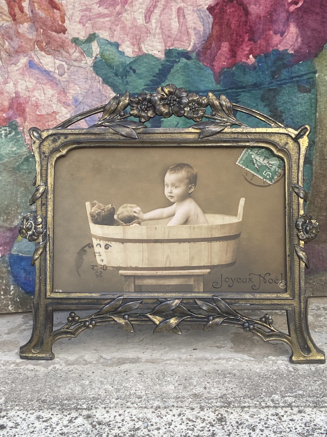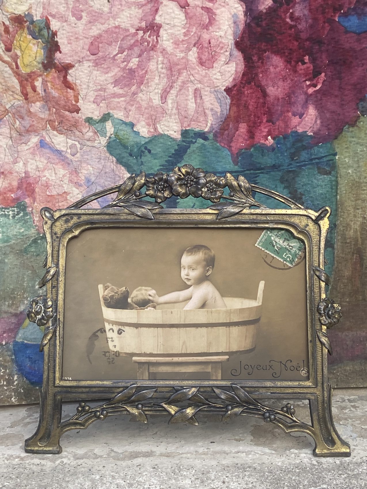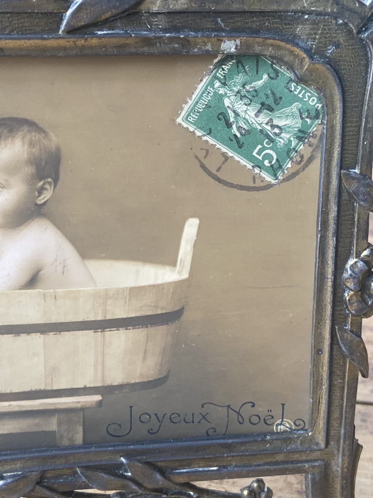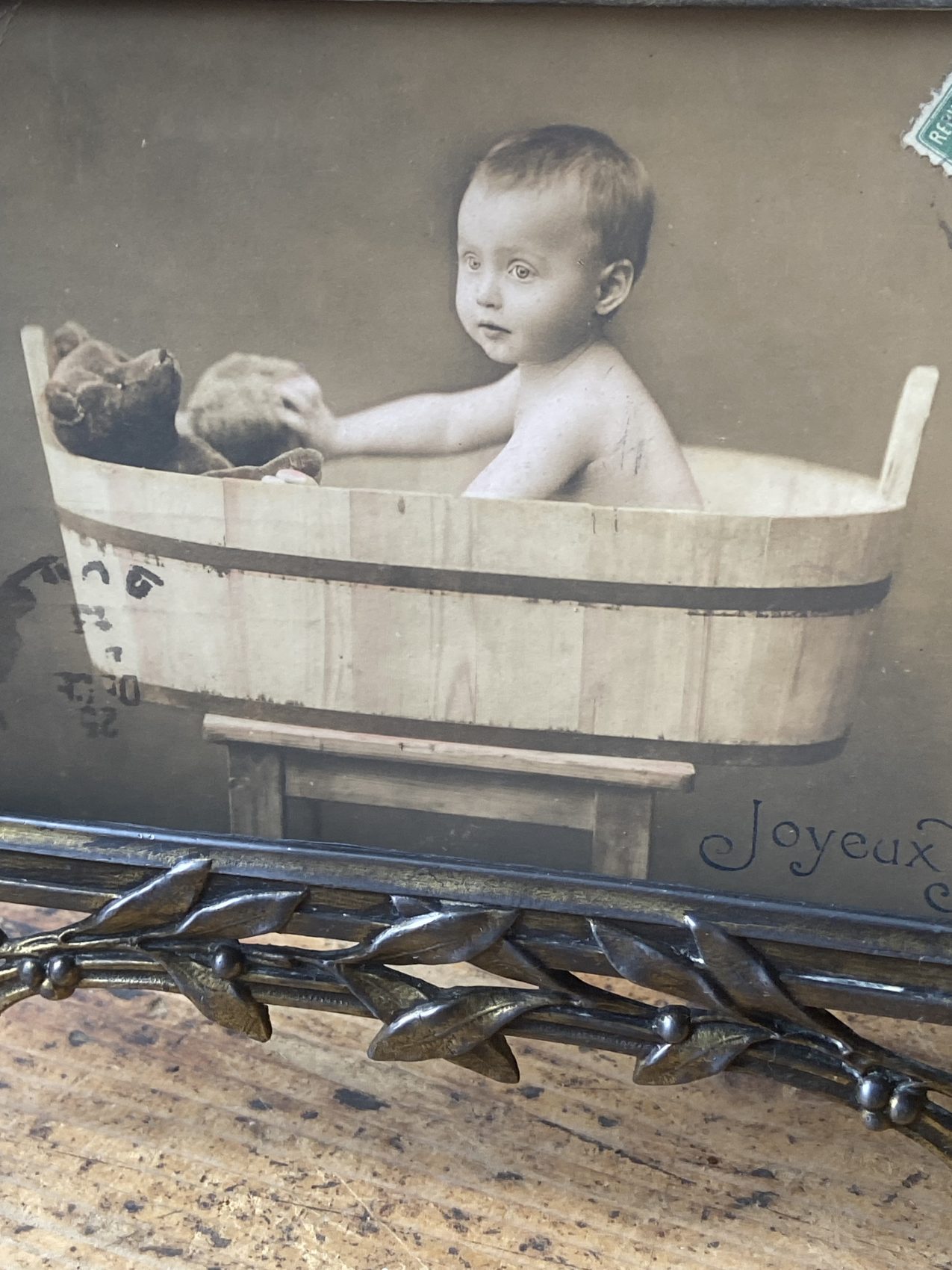 Un objet de curiosité et de charme ! Ce cadre ancien en métal travaillé accueille une photographie début 1900 représentant un enfant dans un baquet, accompagné de son ours en peluche. L’inscription Joyeux Noël et le timbre ancien complètent la scène avec poésie.