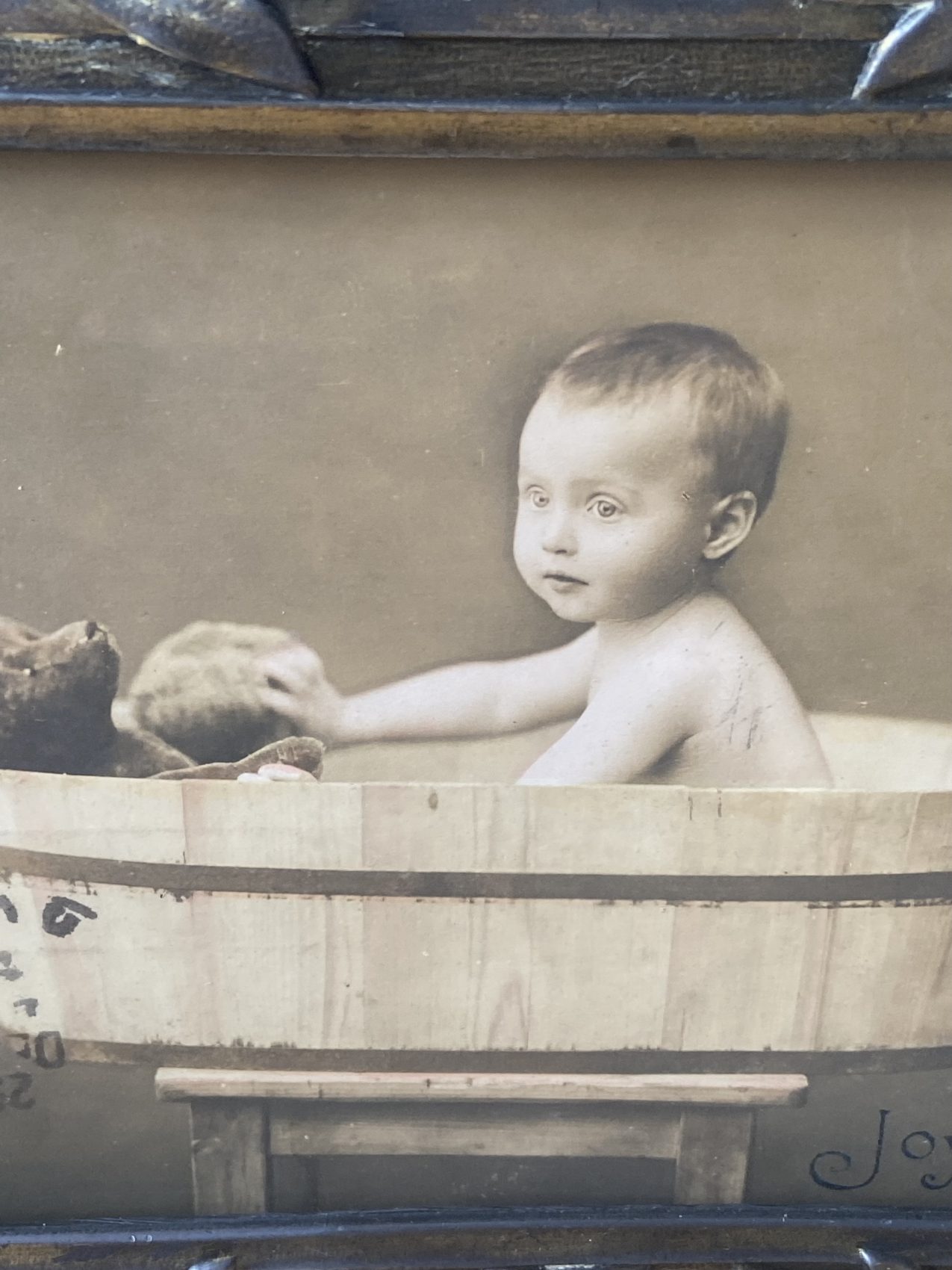 Cadre ancien photo enfant dans un baquet – Époque 1900