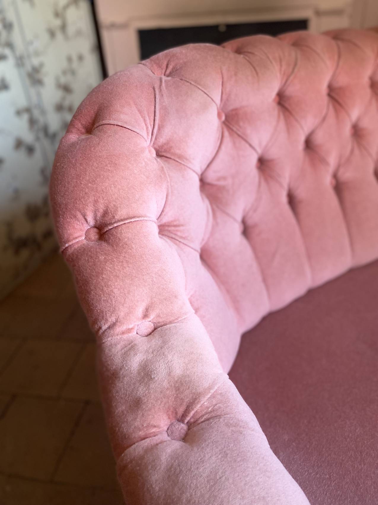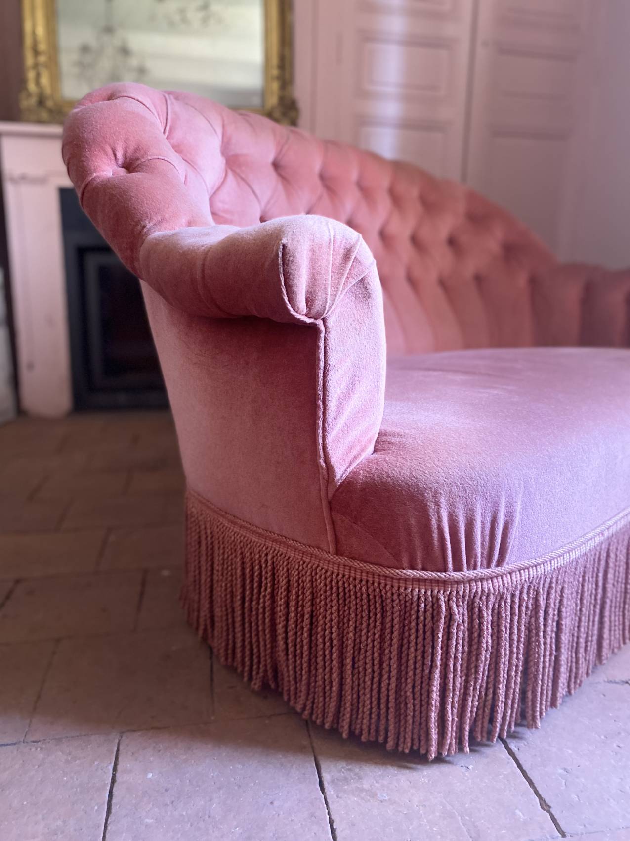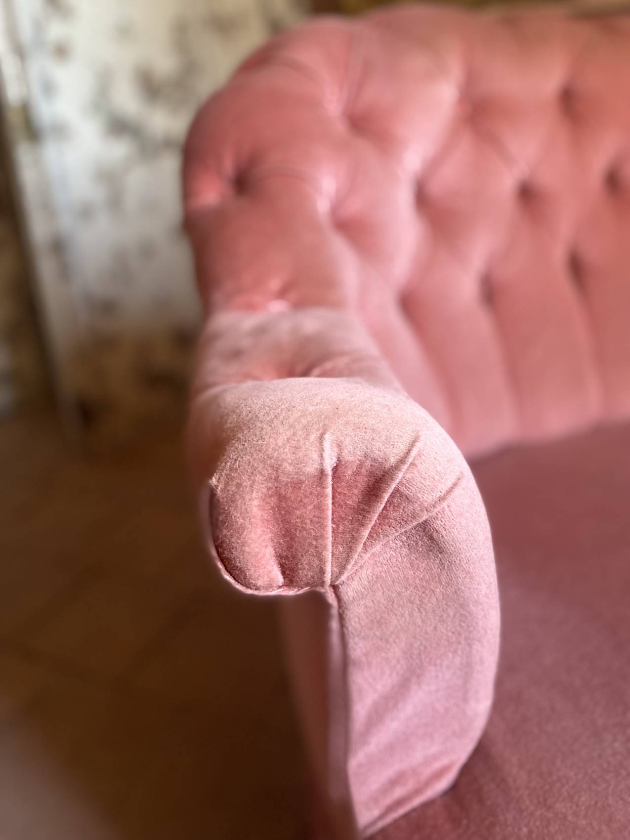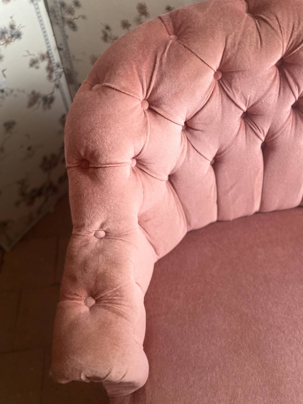 Le velours rose très légèrement patiné par le temps ( discret) lui donne une allure douce, romantique et résolument chic.
