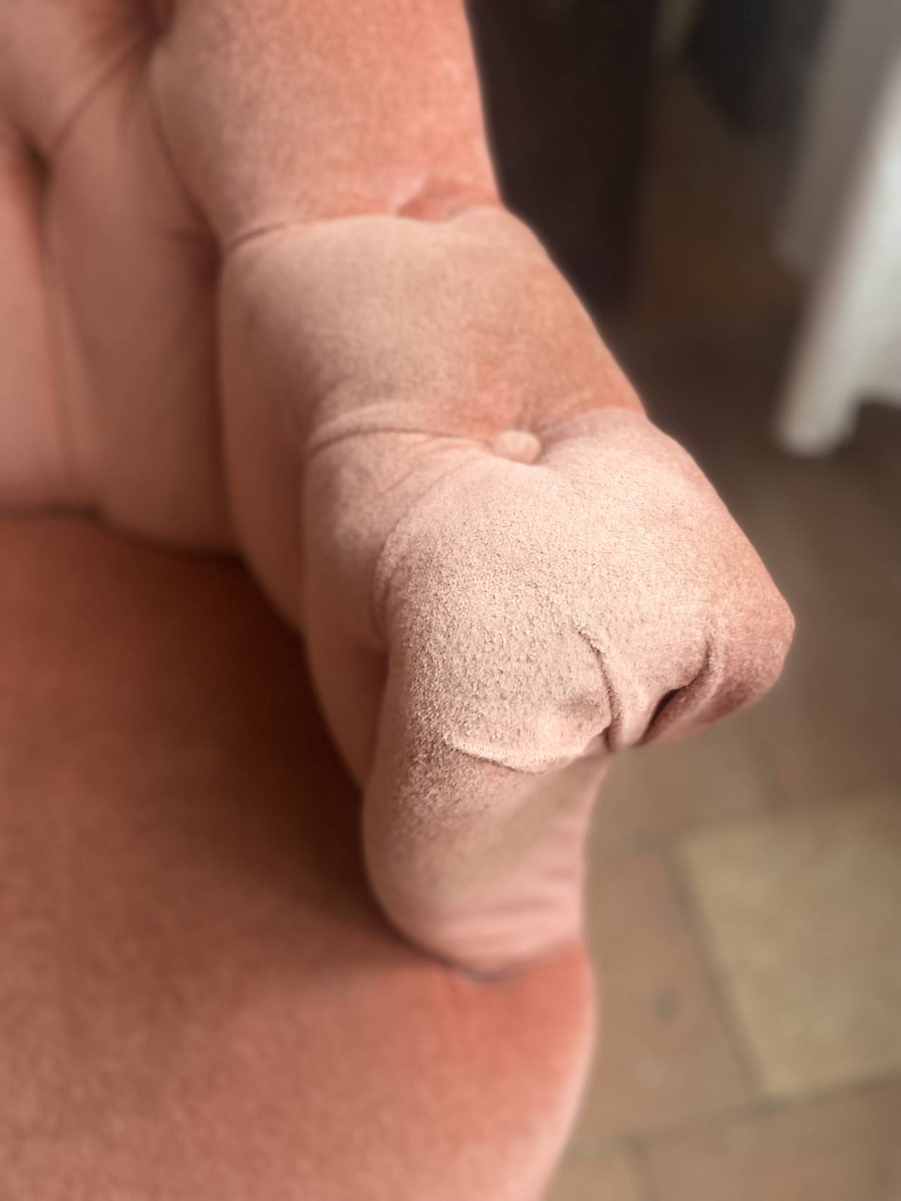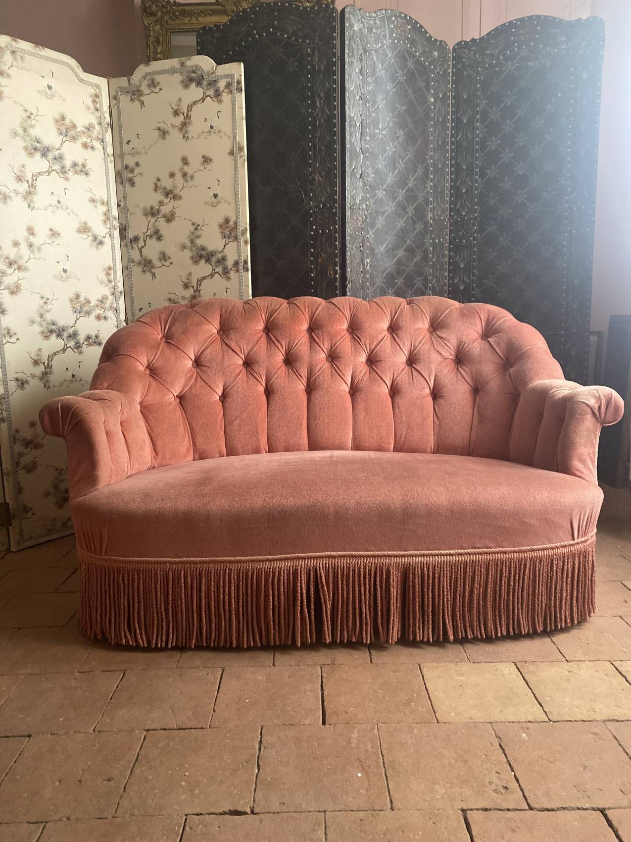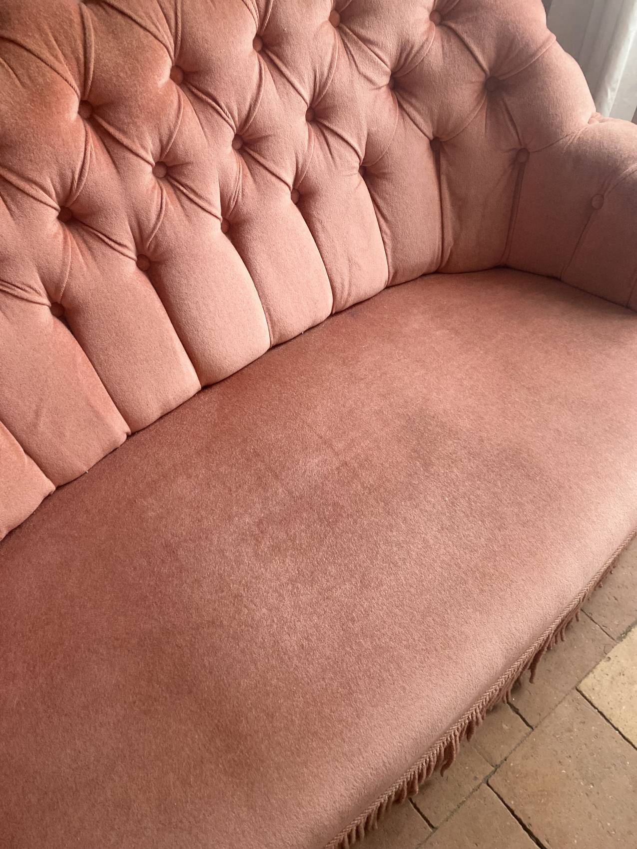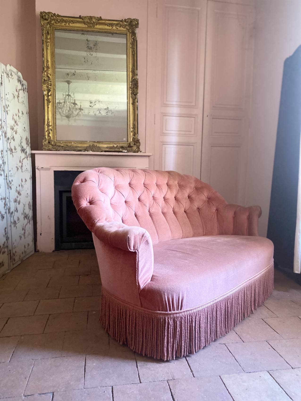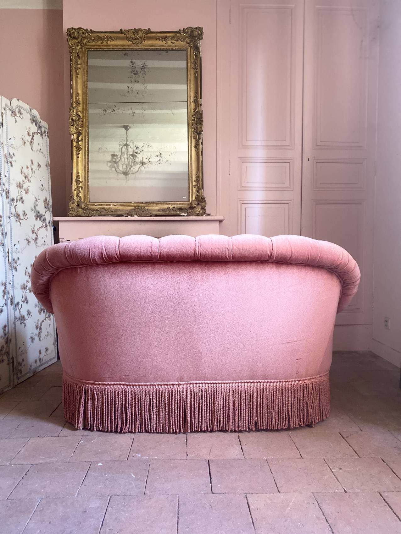 Le velours rose très légèrement patiné par le temps ( discret) lui donne une allure douce, romantique et résolument chic.