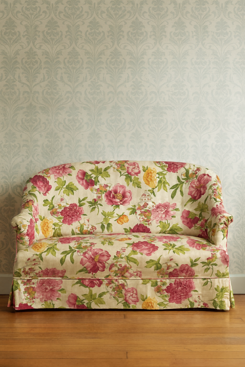 Ce canapé a tout pour plaire : la douceur d’un imprimé floral, le clin d’œil à la Chine ancienne et la silhouette intemporelle du canapé crapaud