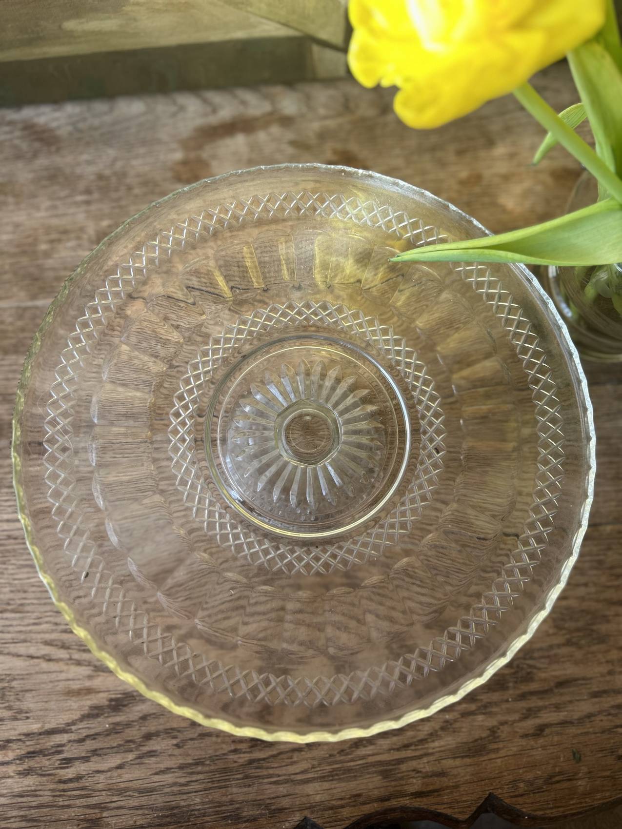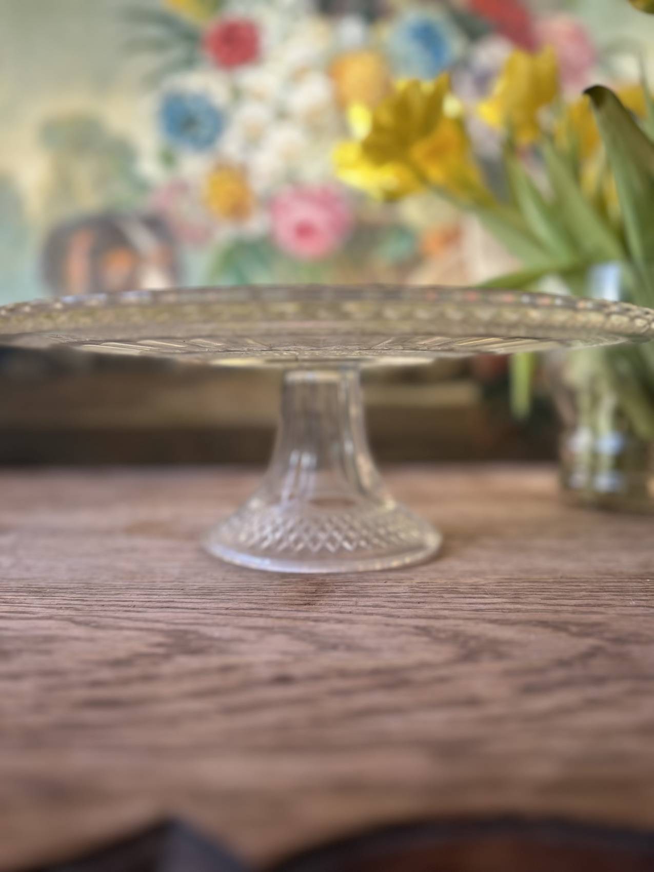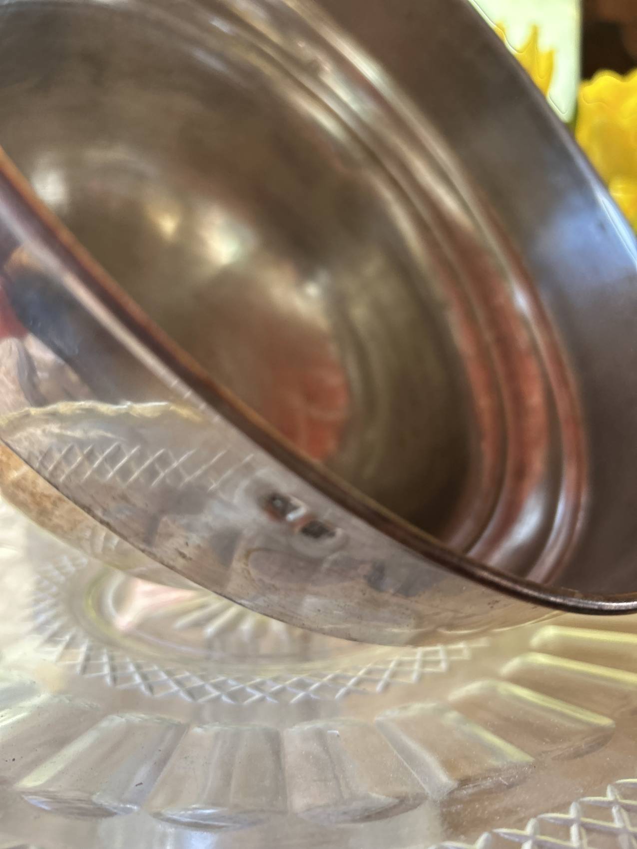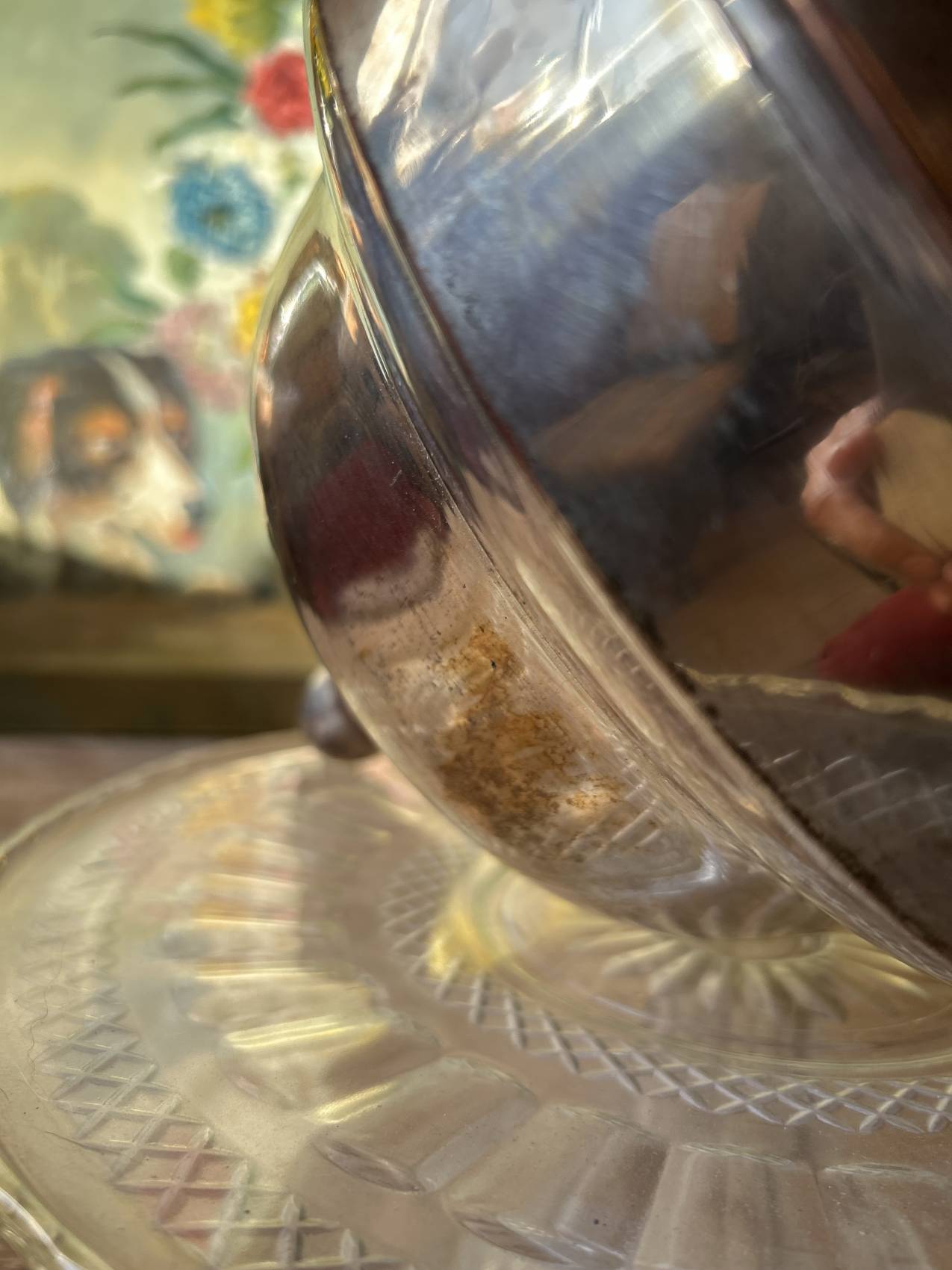 Grande cloche ancienne en métal argenté – diamètre 30 cm avec son plateau en verre sur piédouche