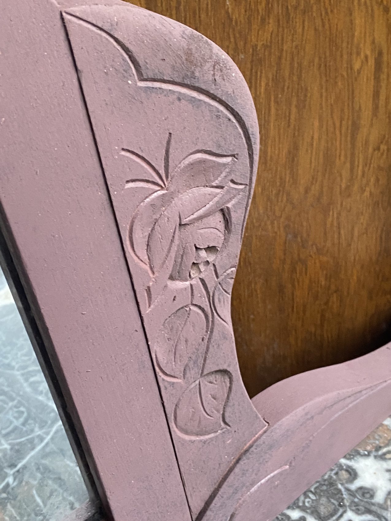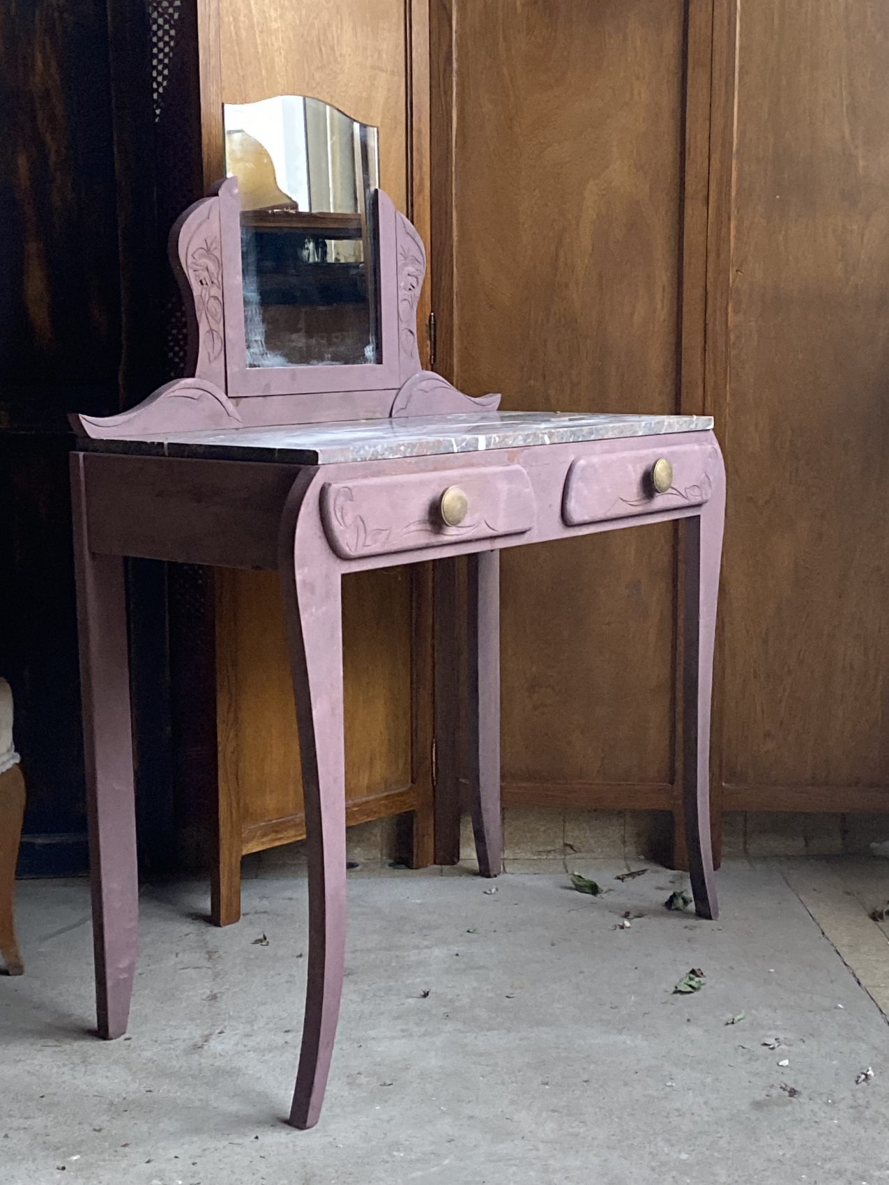 Coiffeuse Art Déco en chêne patine vieux rose à l’ancienne