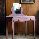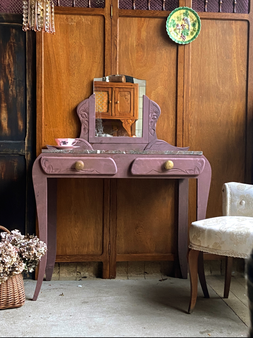 Coiffeuse Art Déco en chêne patine vieux rose à l’ancienne charme intemporel