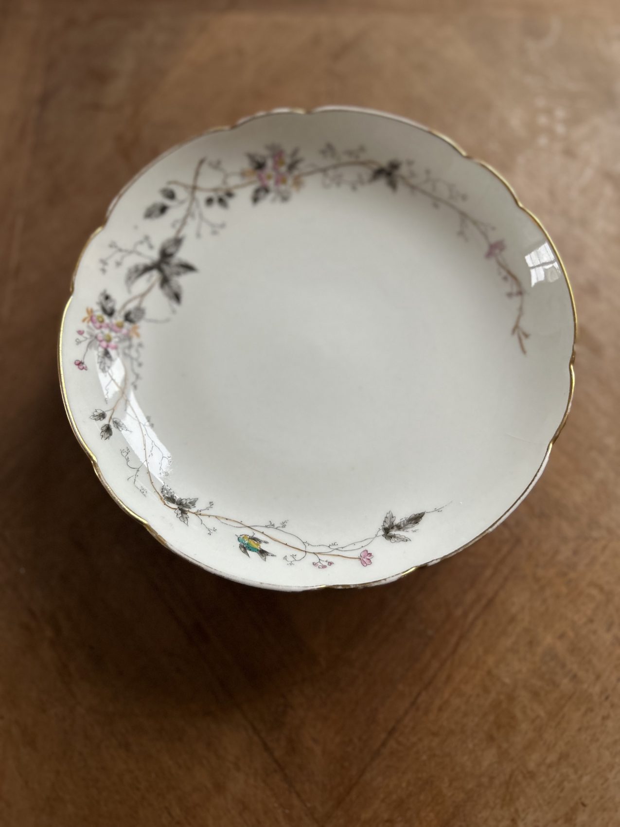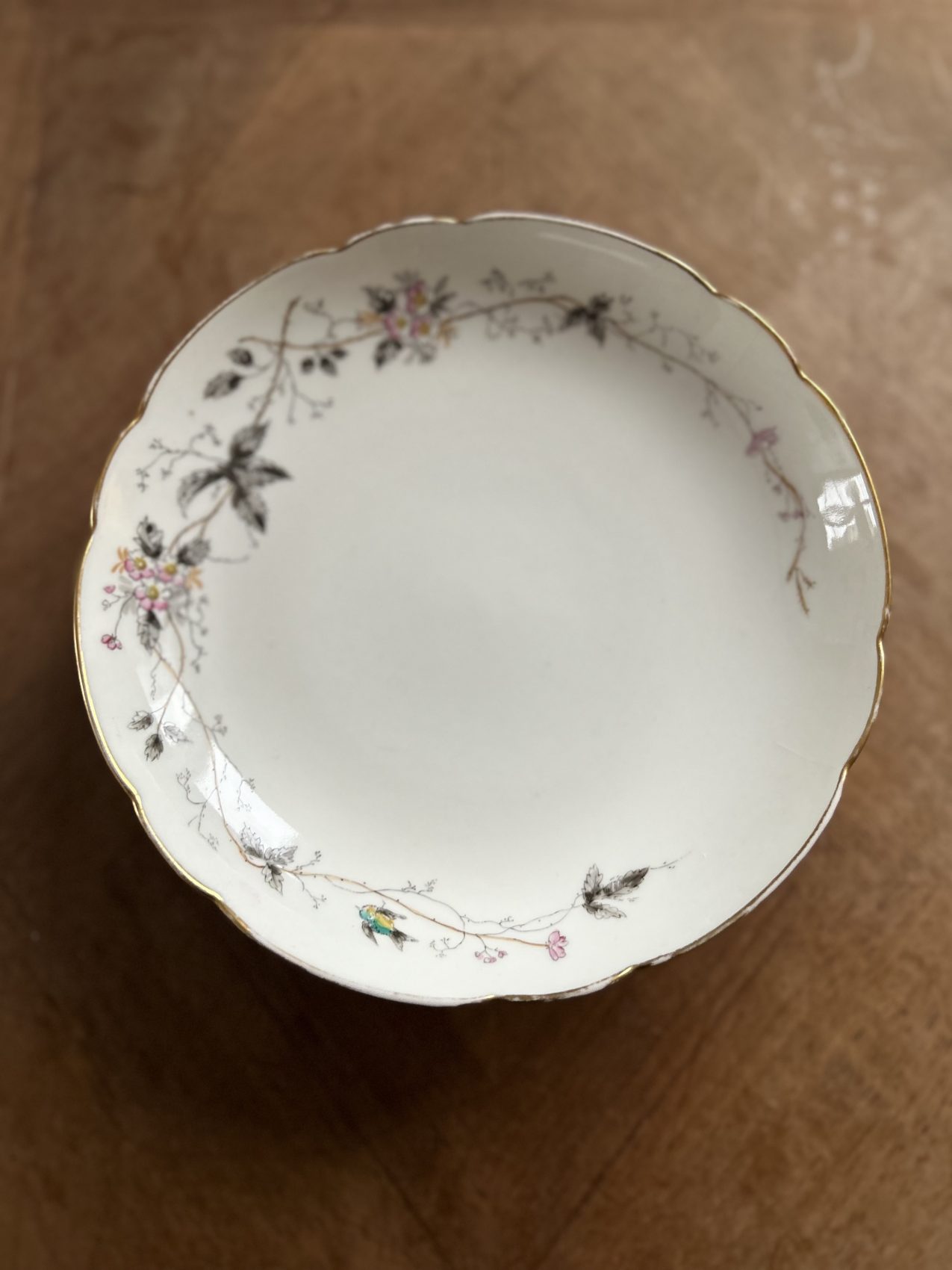 Compotier sur pied en porcelaine époque 1900 – Motifs d’aubépine et liseré or