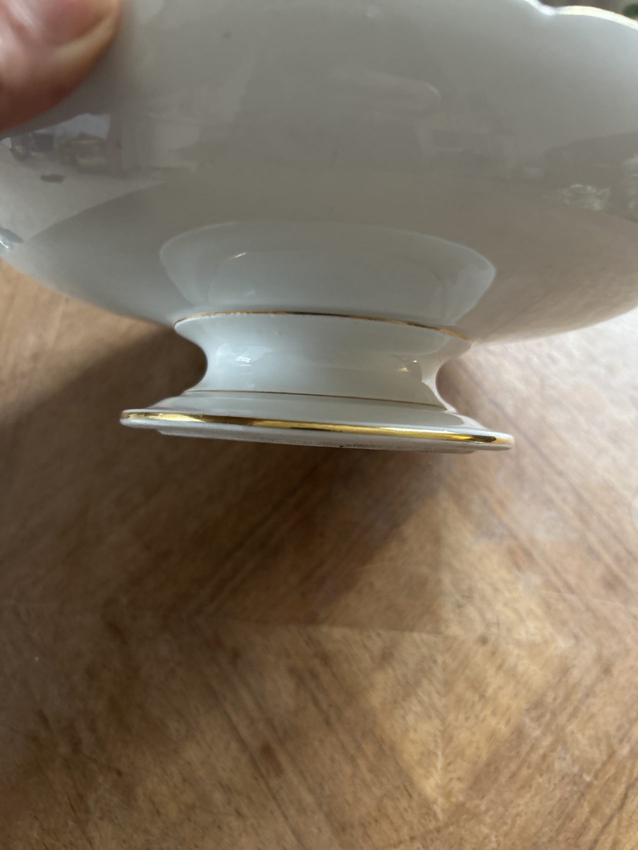 Ce compotier sur pied en porcelaine, typique de l’époque 1900, séduit par ses motifs d’aubépine délicatement fleuris et son liseré or qui capte la lumière avec élégance.