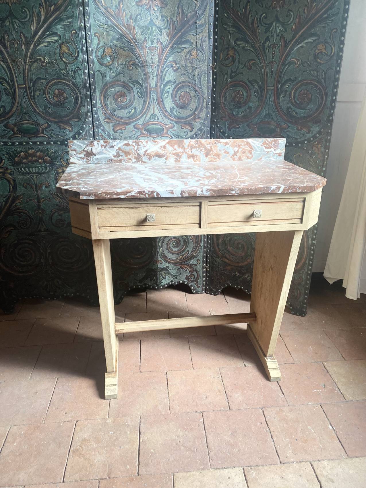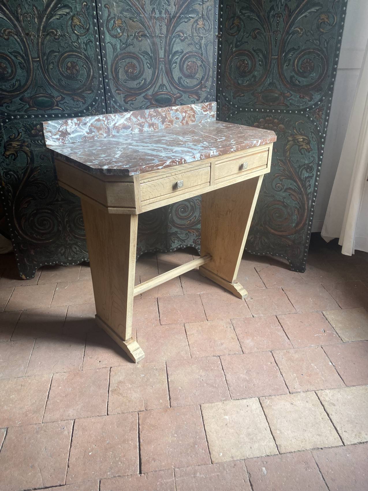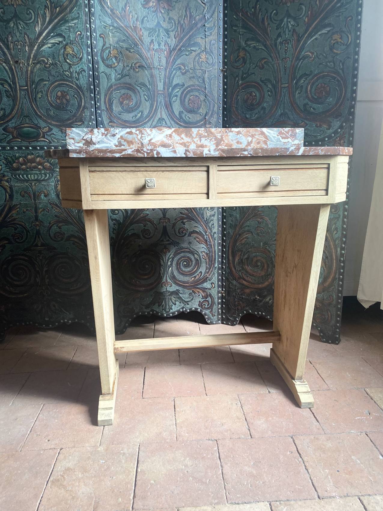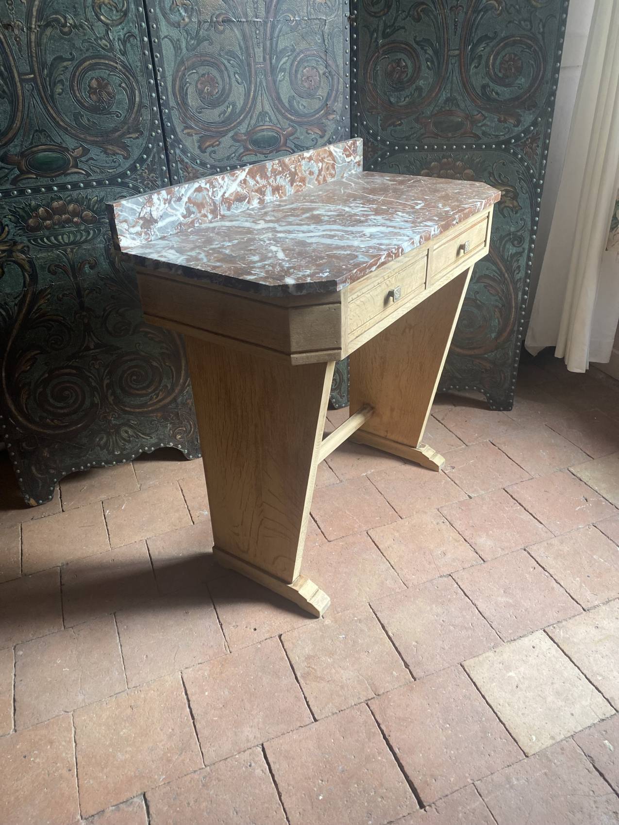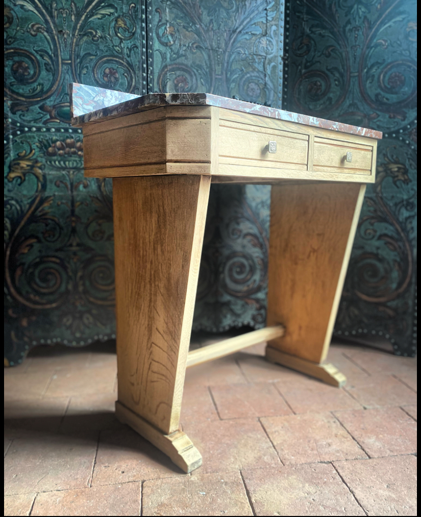 Cette console Art Déco en chêne massif avec son plateau en marbre est bien plus qu’un meuble : c’est un héritage à transmettre.