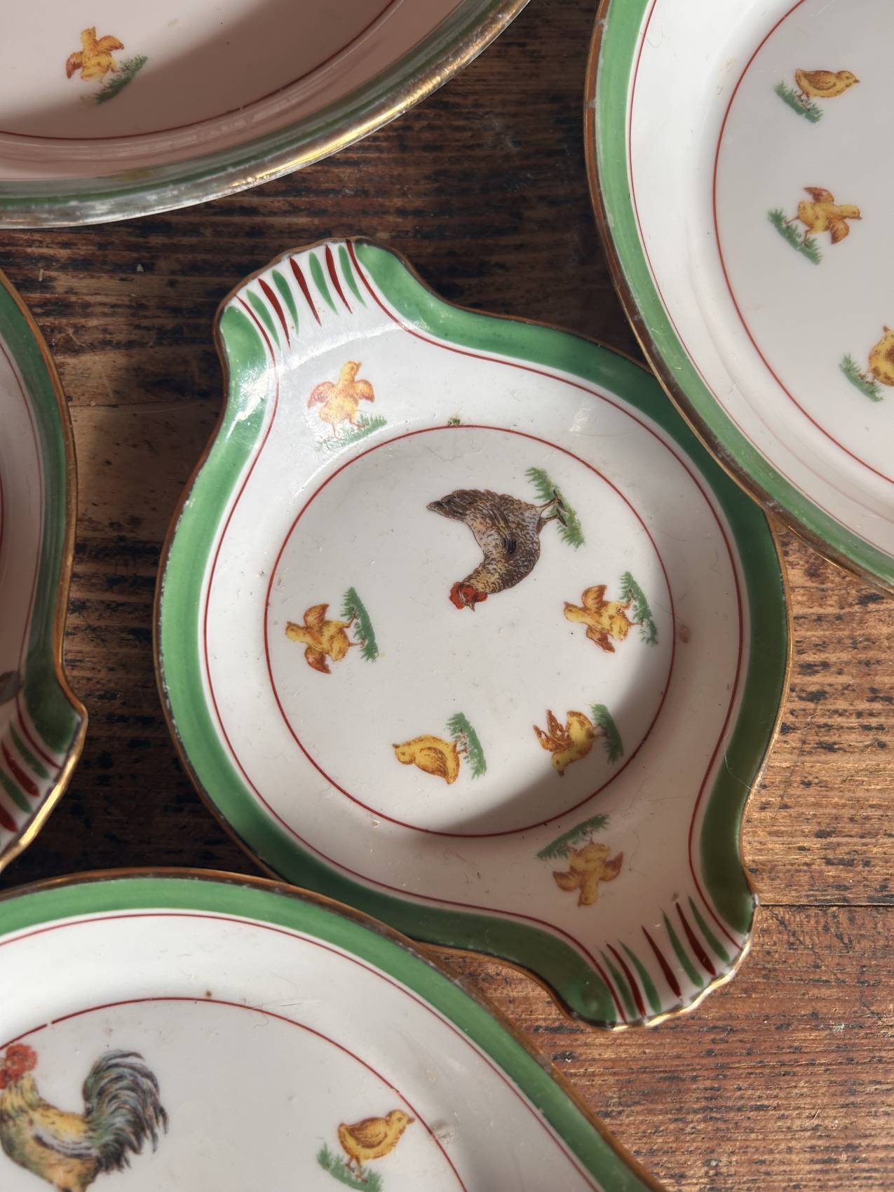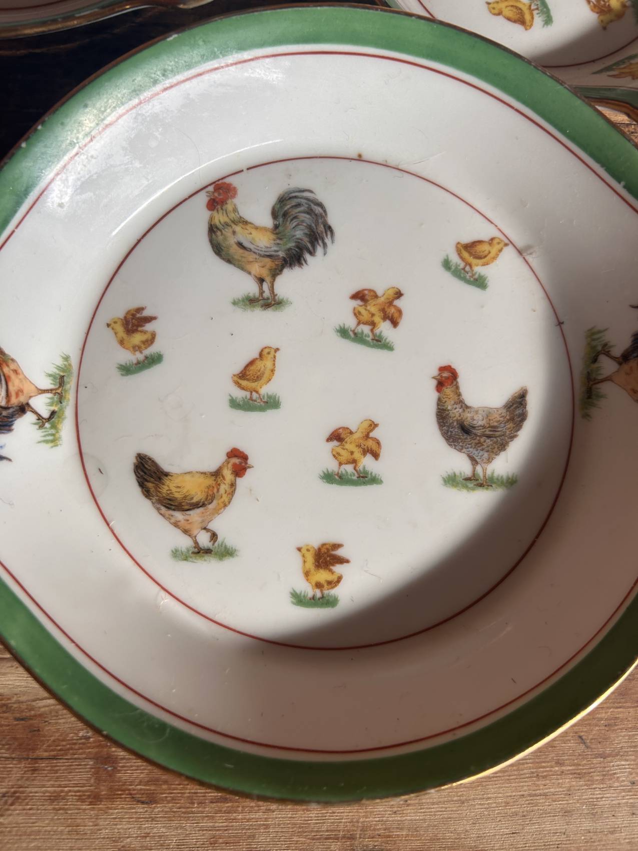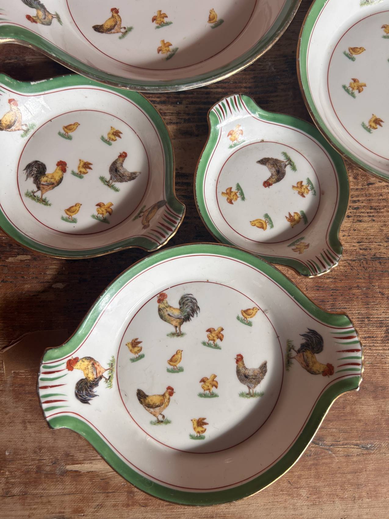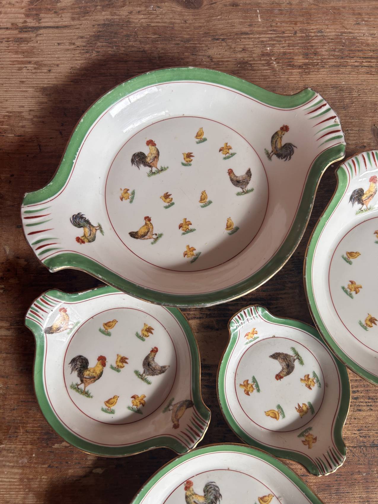 Ensemble de 5 plats anciens en porcelaine décor poussins et poules – époque 1900 ADOPTÉ