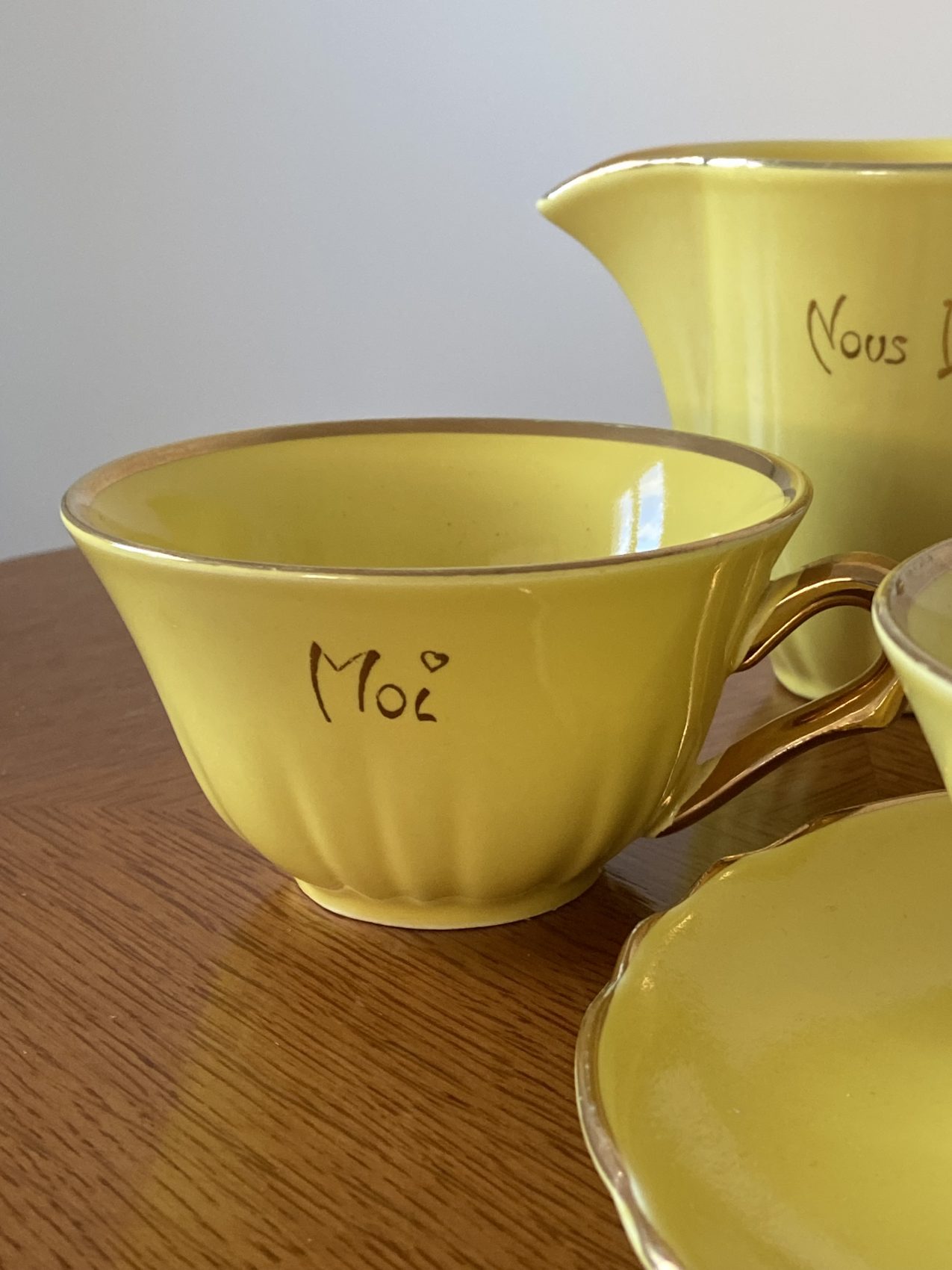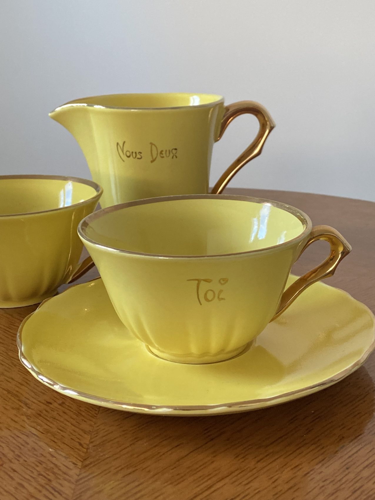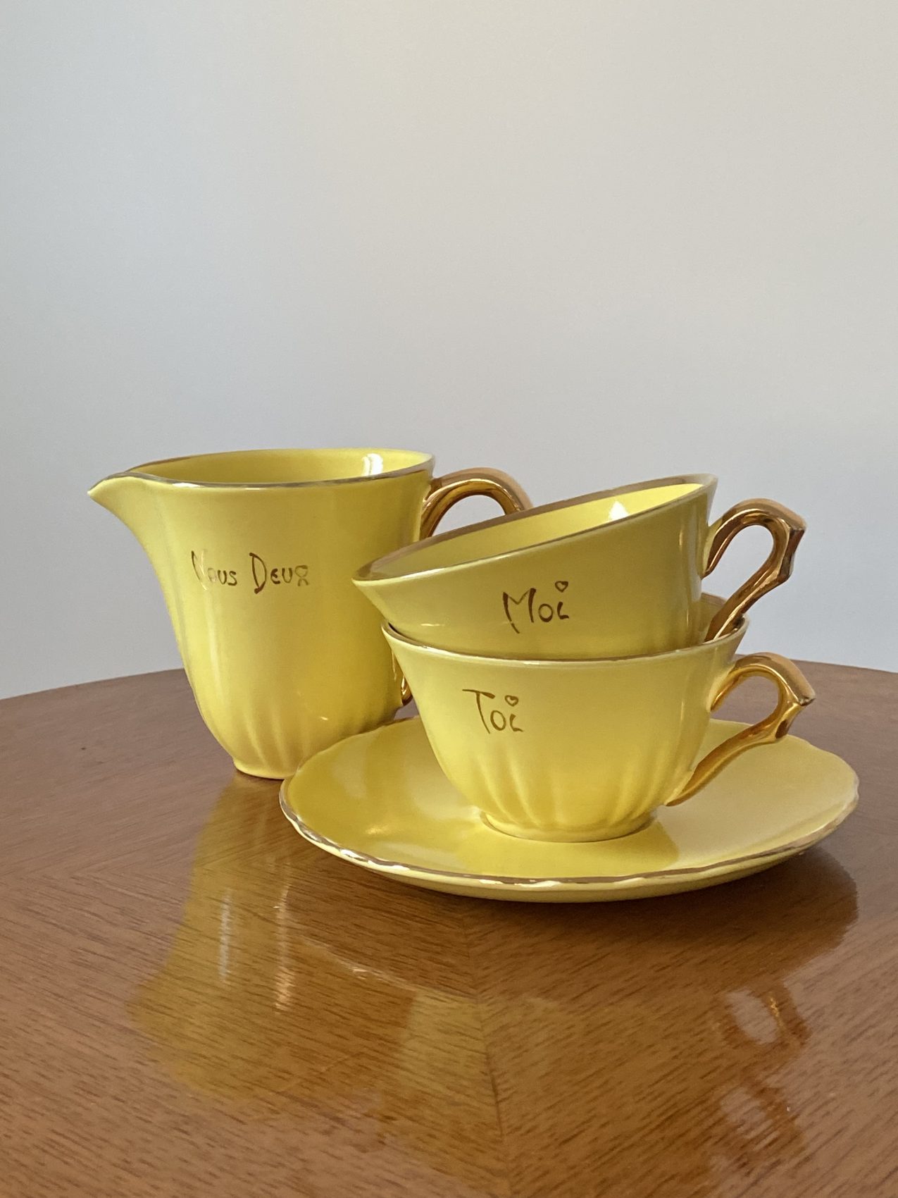 Ce modèle “Toi et moi”, avec son jaune plein de gaité et son style tres vintage, est une pépite à la fois sentimentale et décorative.