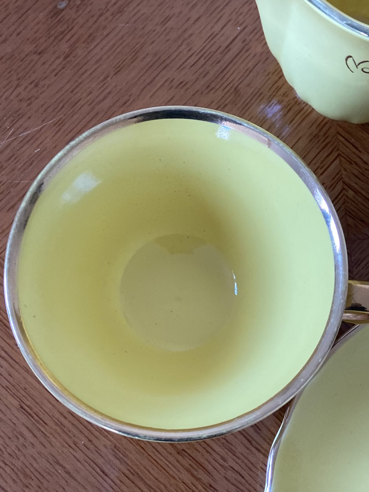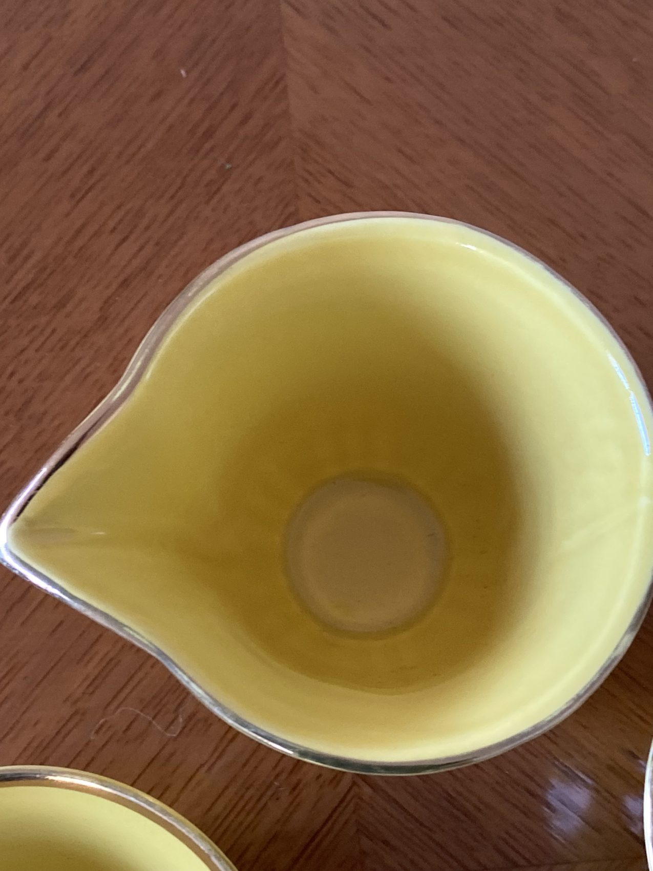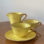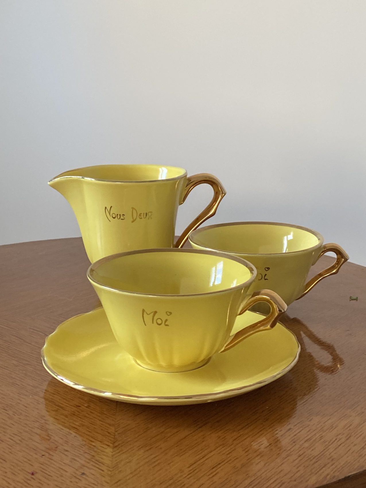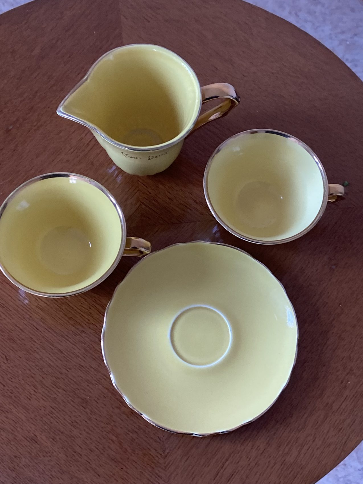 La faïence affiche un jaune canari lumineux, délicatement souligné d’un filet doré sur les contours. L’ensemble comprend deux tasses, un pot à lait et une seule soucoupe