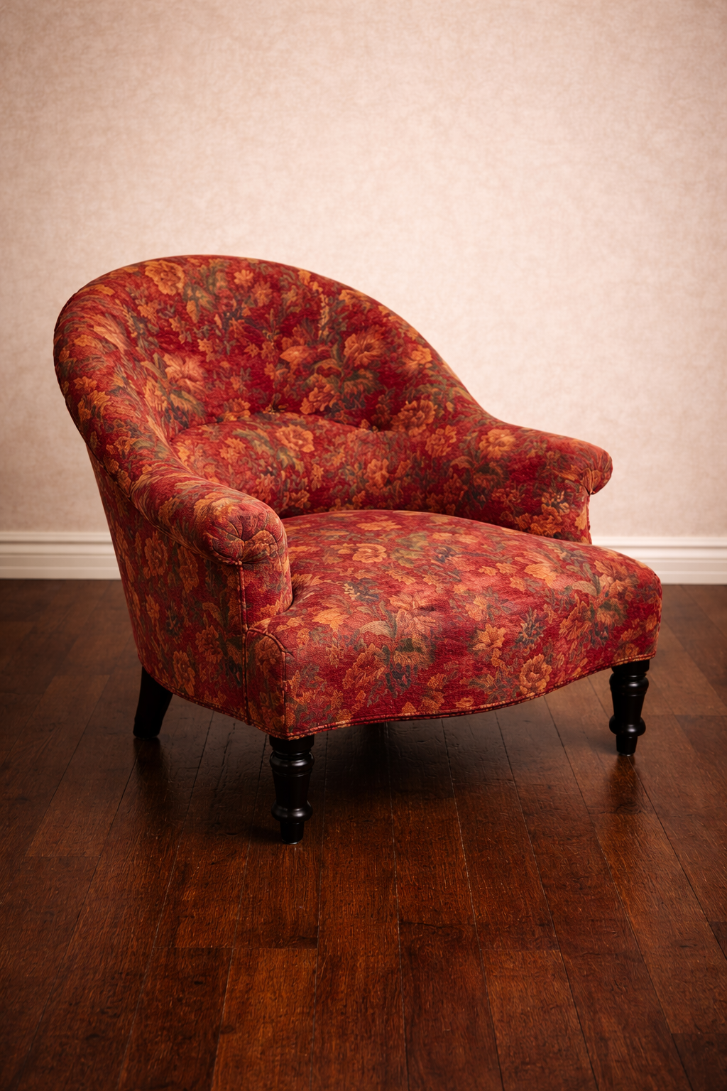 Le tissu fleuri rouge donne du relief et de la chaleur à ce fauteuil. Il attire l’œil sans en faire trop et met en valeur les lignes du siège. C’est une pièce qui trouve sa place aussi bien dans un salon ancien que dans un intérieur plus moderne, où elle apporte immédiatement du caractère.