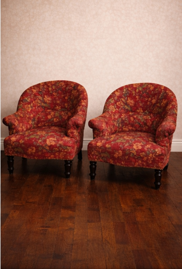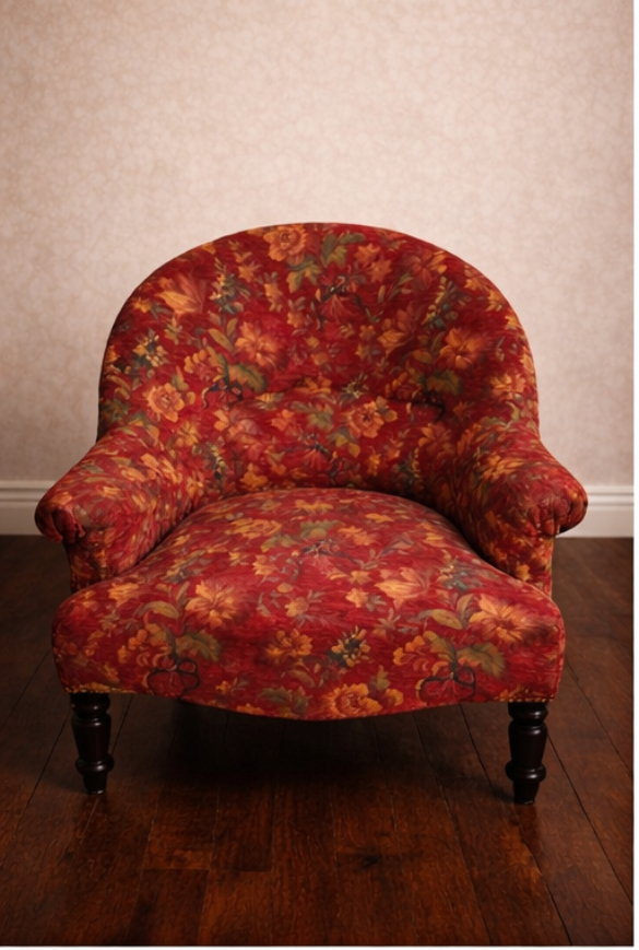 Peut-être est-ce sa forme arrondie, peut-être son tissu fleuri rouge, ou tout simplement cette impression de fauteuil qui a déjà vu passer bien des histoires. Il date de l’époque Napoléon III, il incarne parfaitement l’esprit de ces intérieurs où l’on aimait le confort autant que l’élégance.