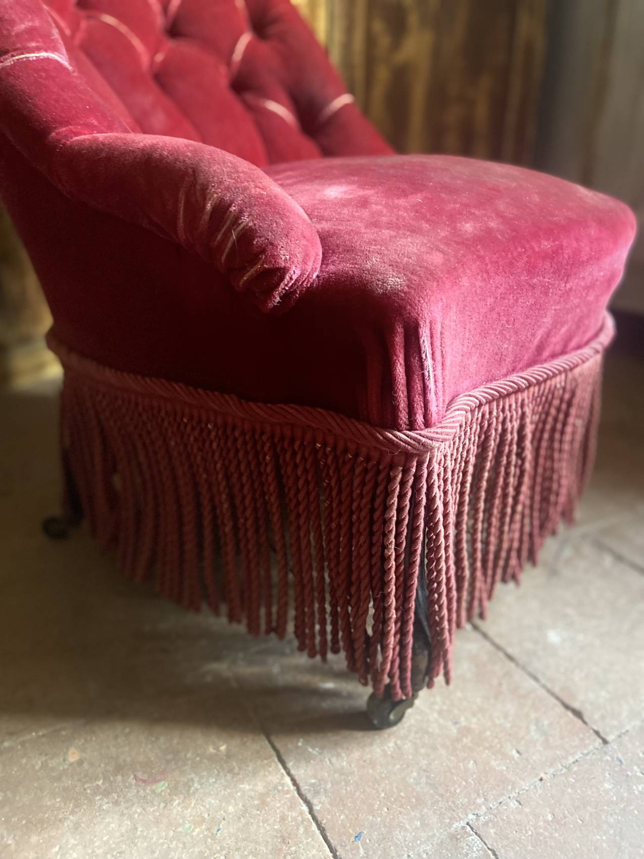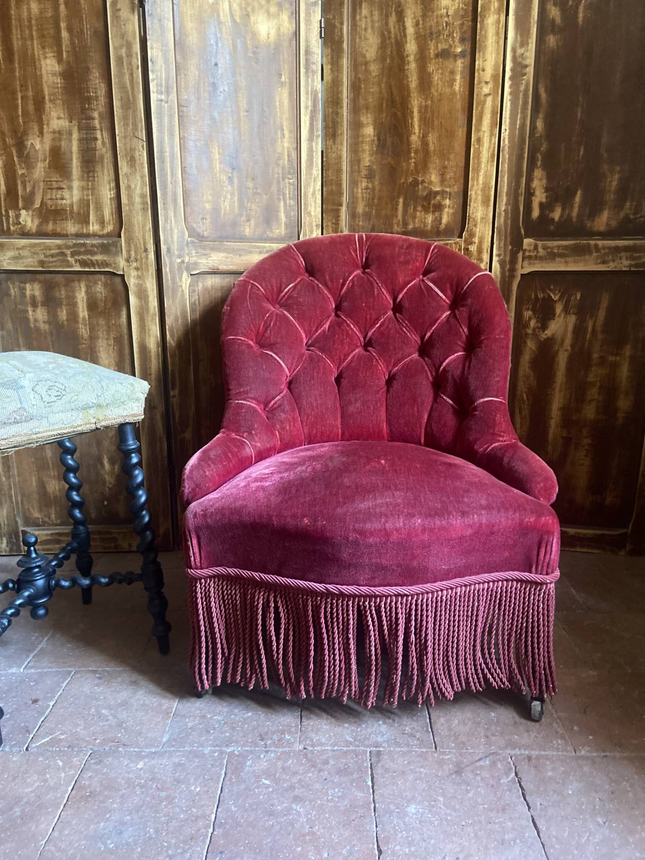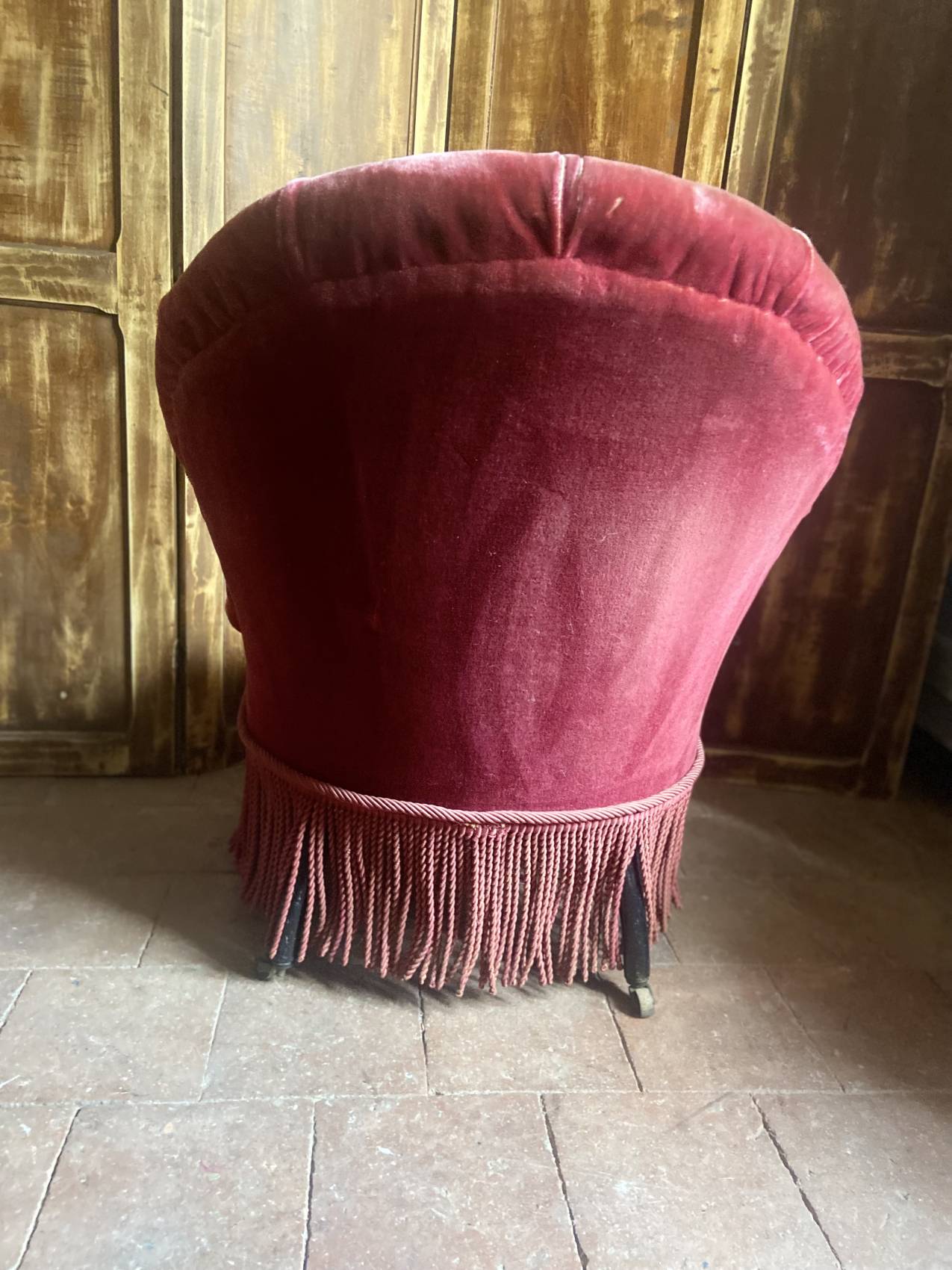 Fauteuil crapaud ancien en velours capitonné rouge Epoque Napoléon III