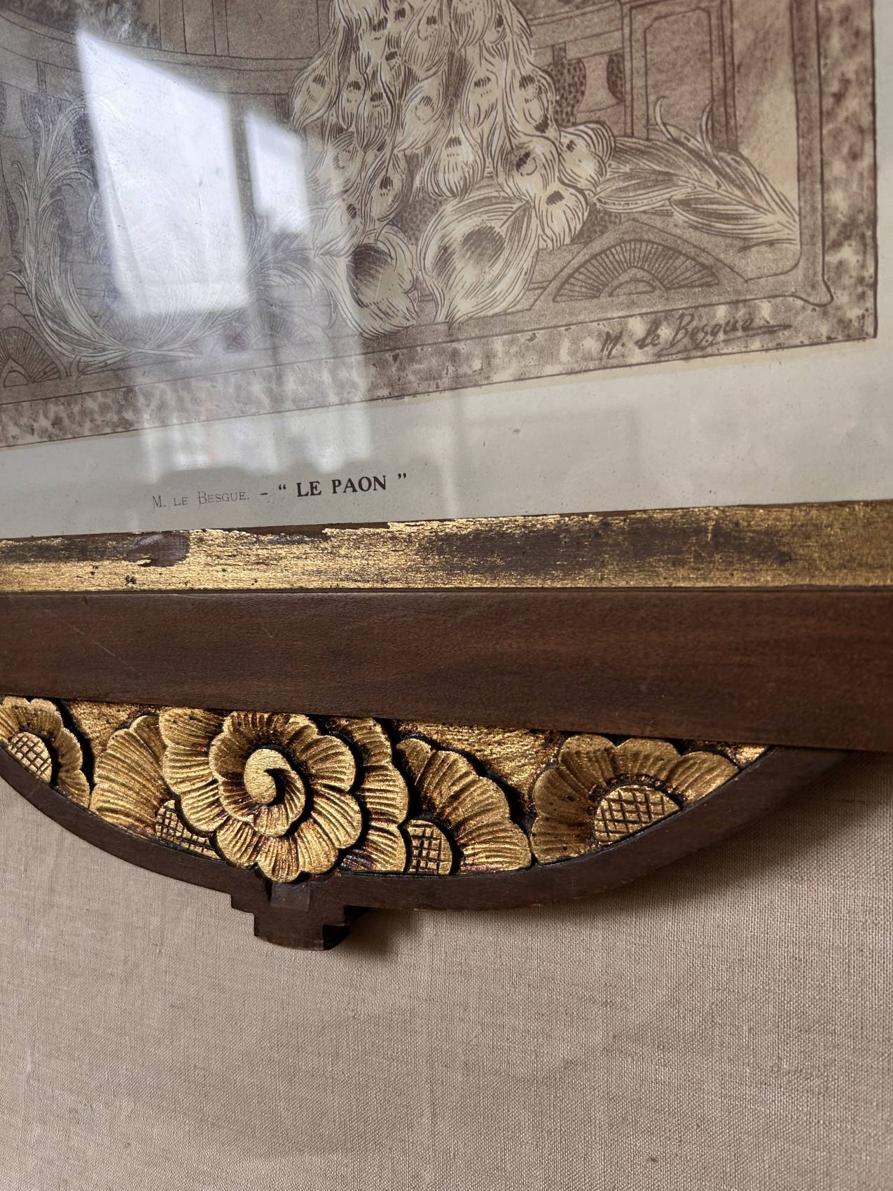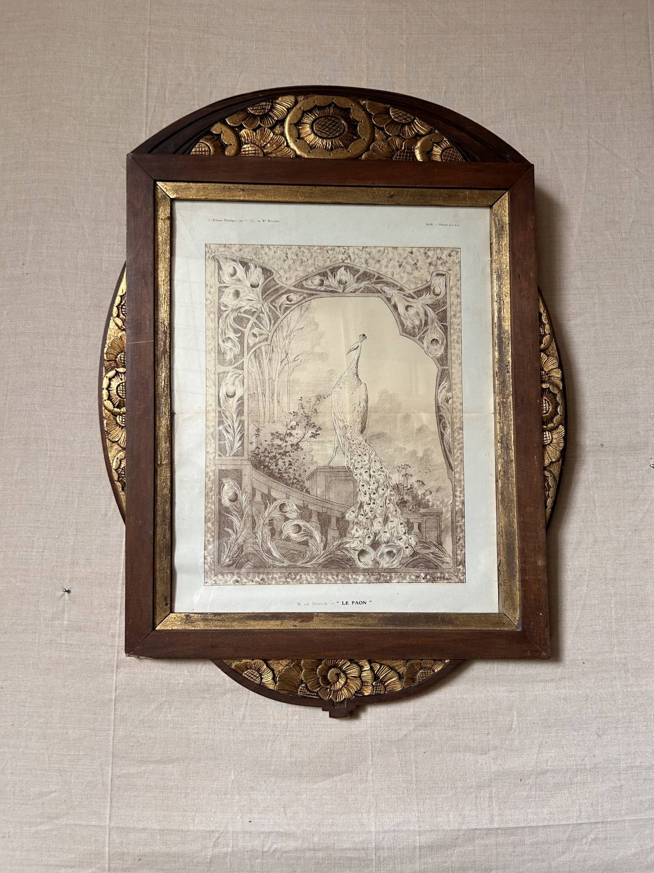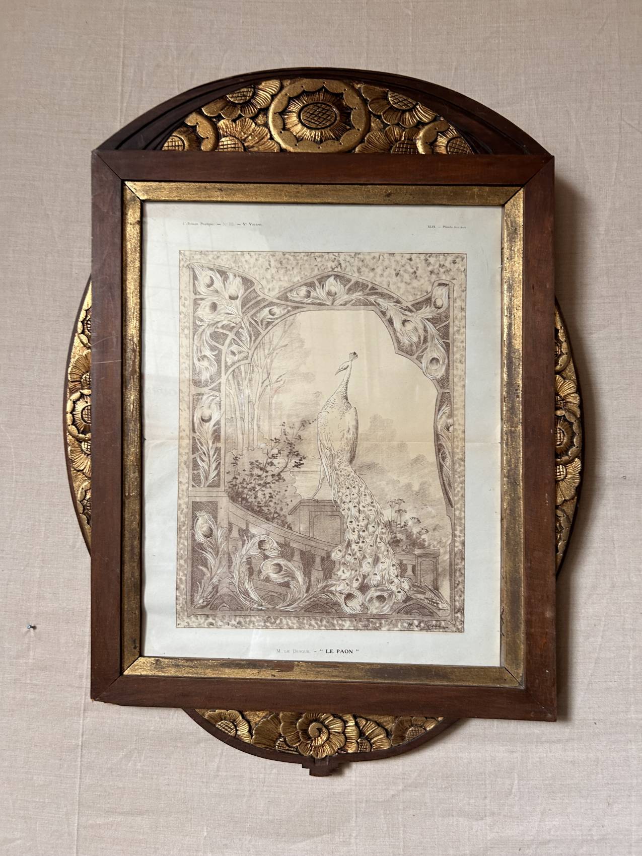 Ce grand cadre Art déco en bois avec dorure date de la première moitié du XXe siècle et accueille une gravure ancienne représentant un paon, protégée sous verre. L’ensemble forme un tableau très décoratif, élégant et plein de caractère.