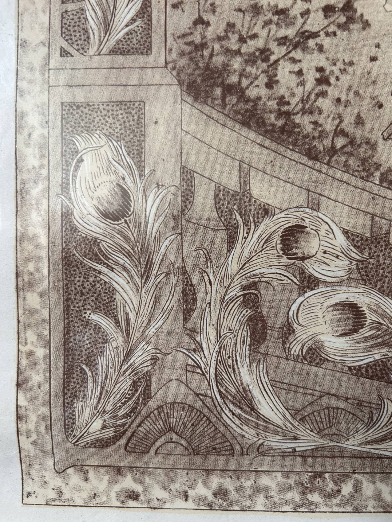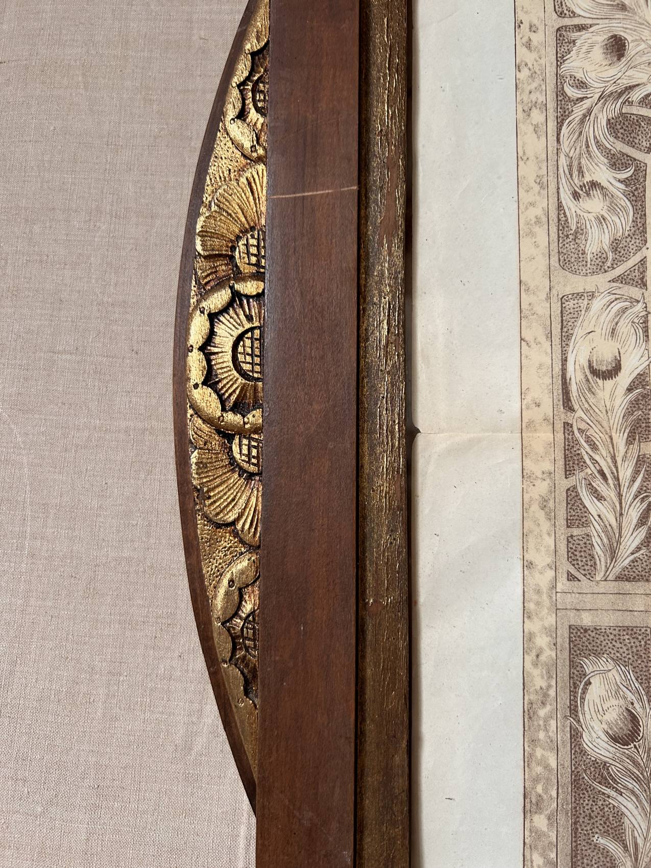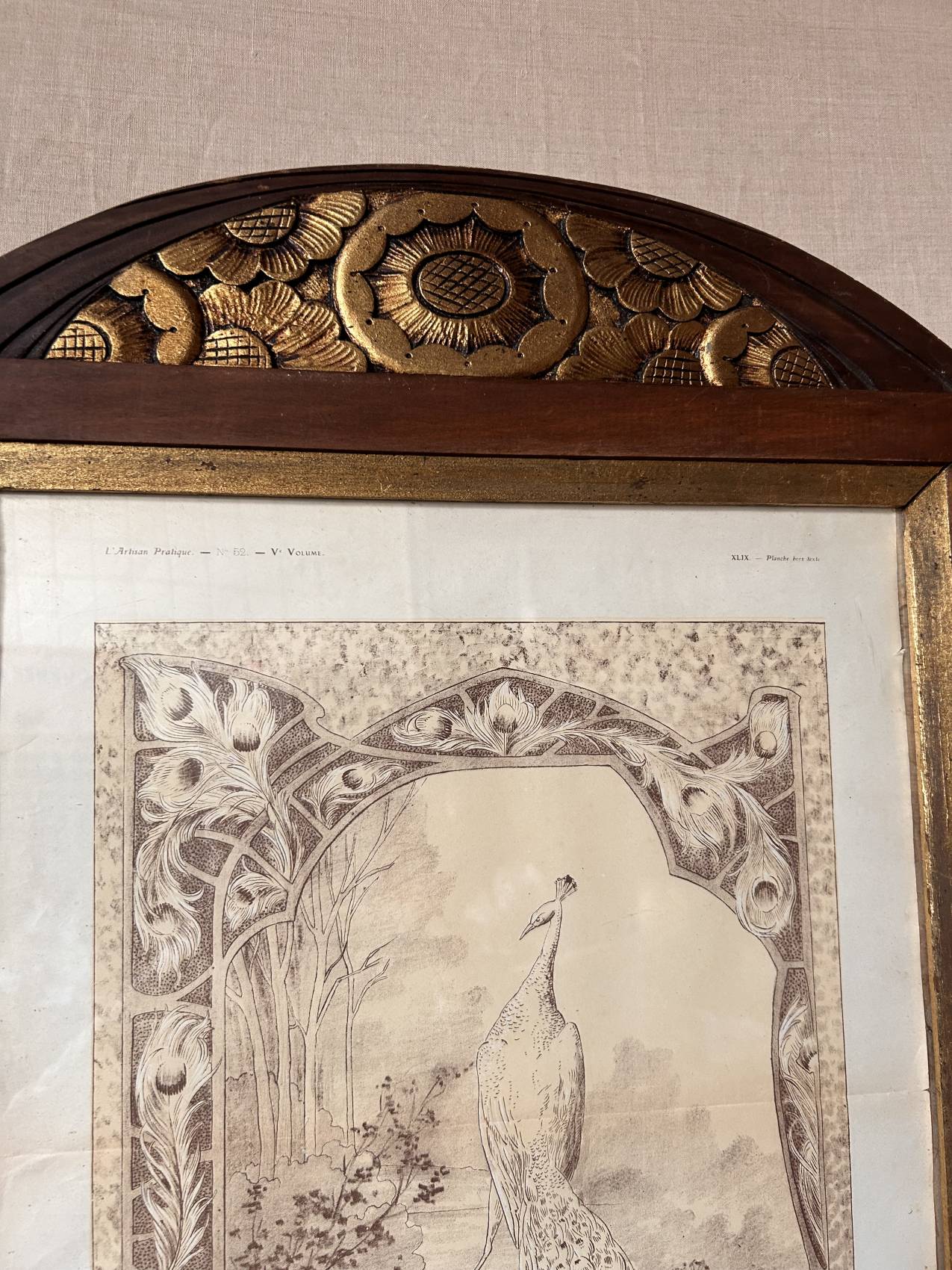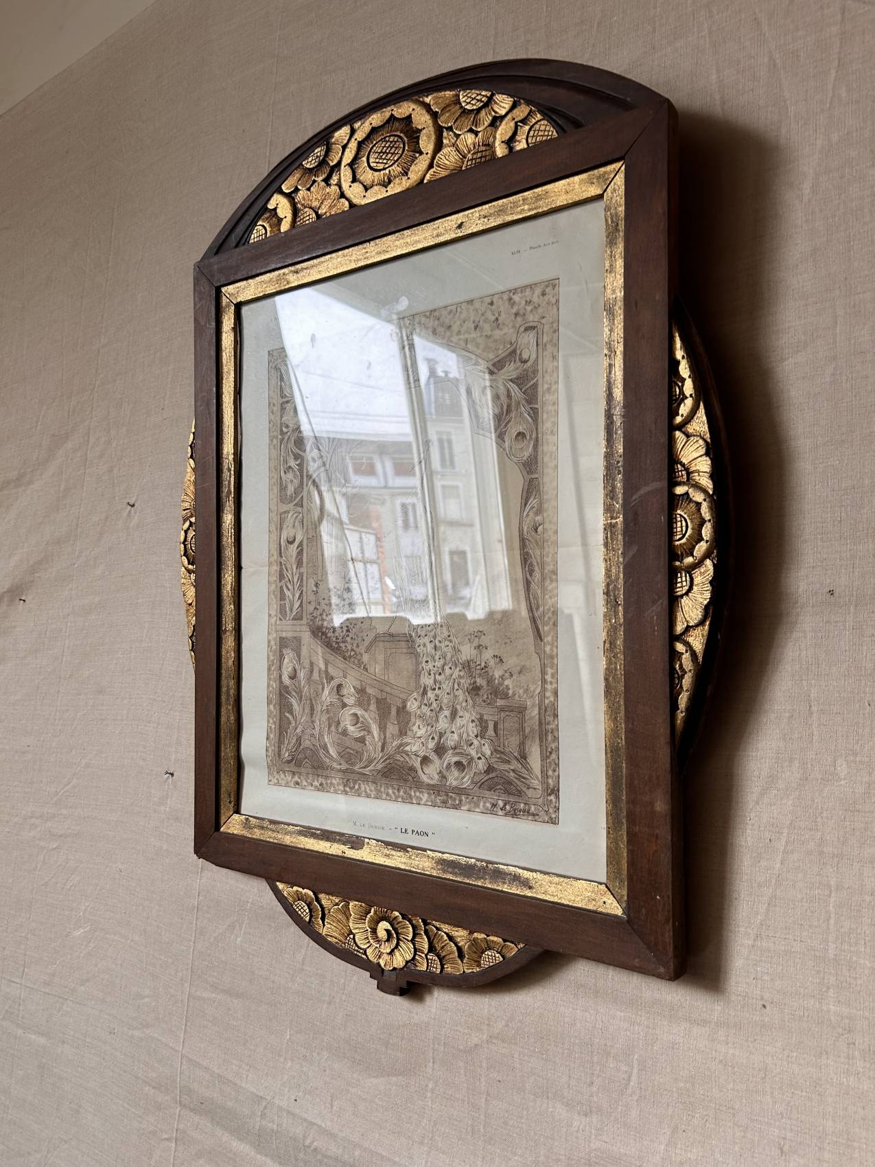 Ce grand cadre Art déco en bois avec dorure date de la première moitié du XXe siècle et accueille une gravure ancienne représentant un paon, protégée sous verre. L’ensemble forme un tableau très décoratif, élégant et plein de caractère.