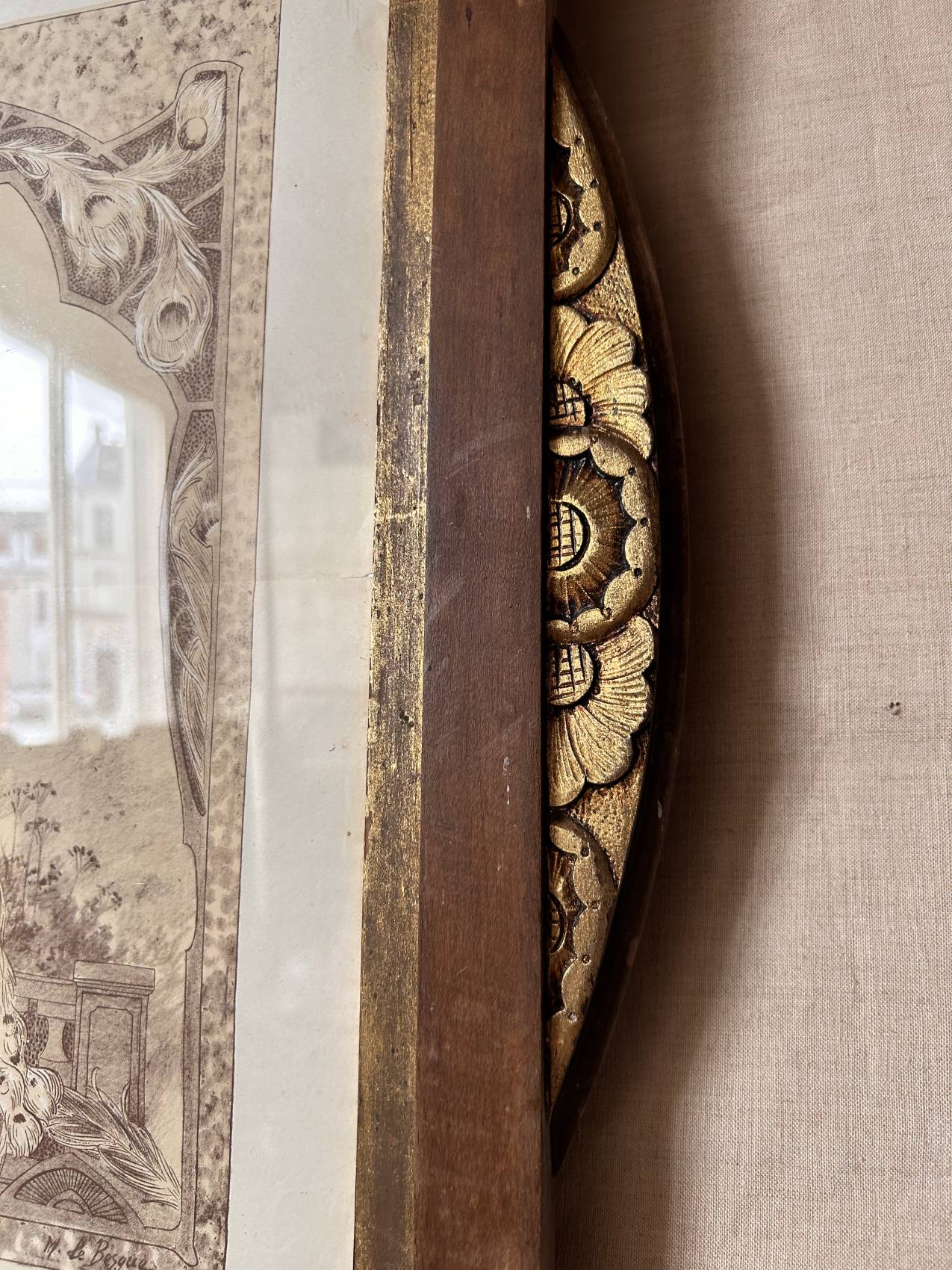Ce grand cadre ancien Art déco est réalisé en bois avec une dorure intérieure qui met en valeur la gravure.