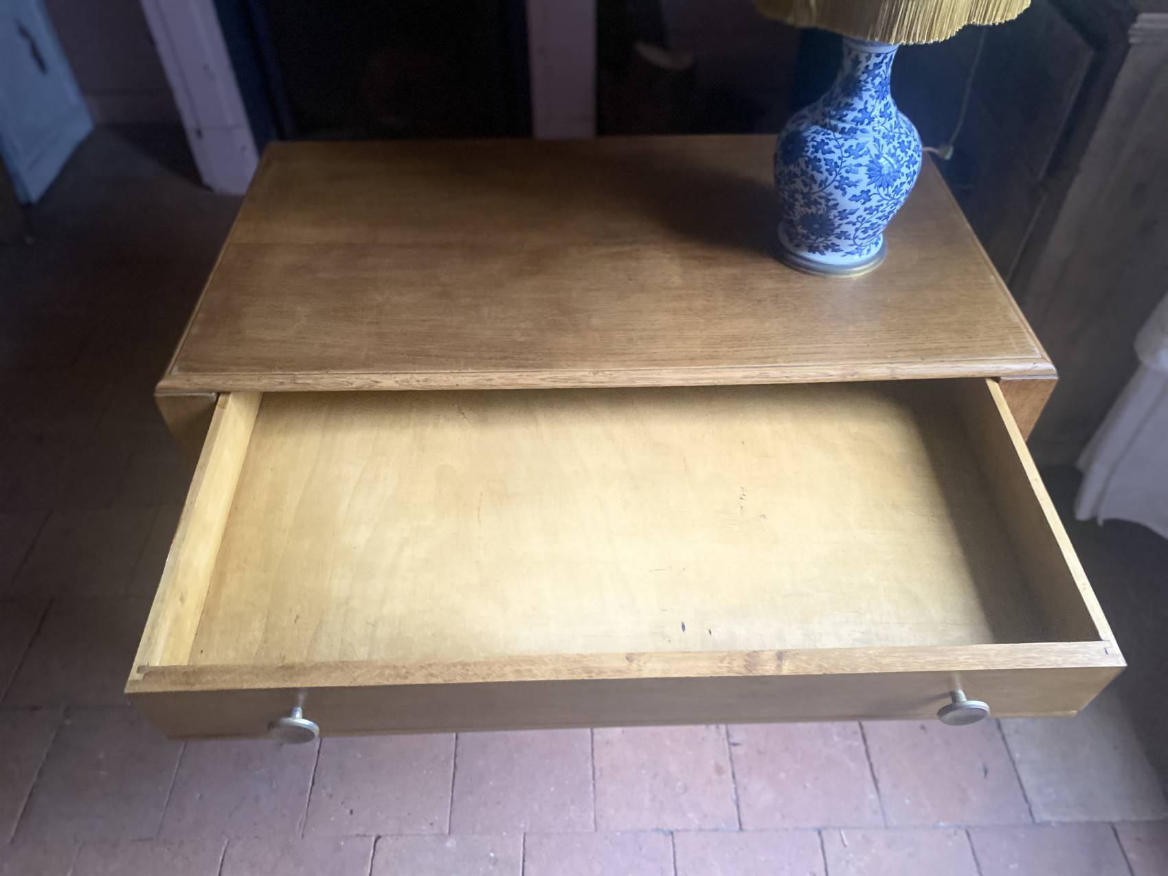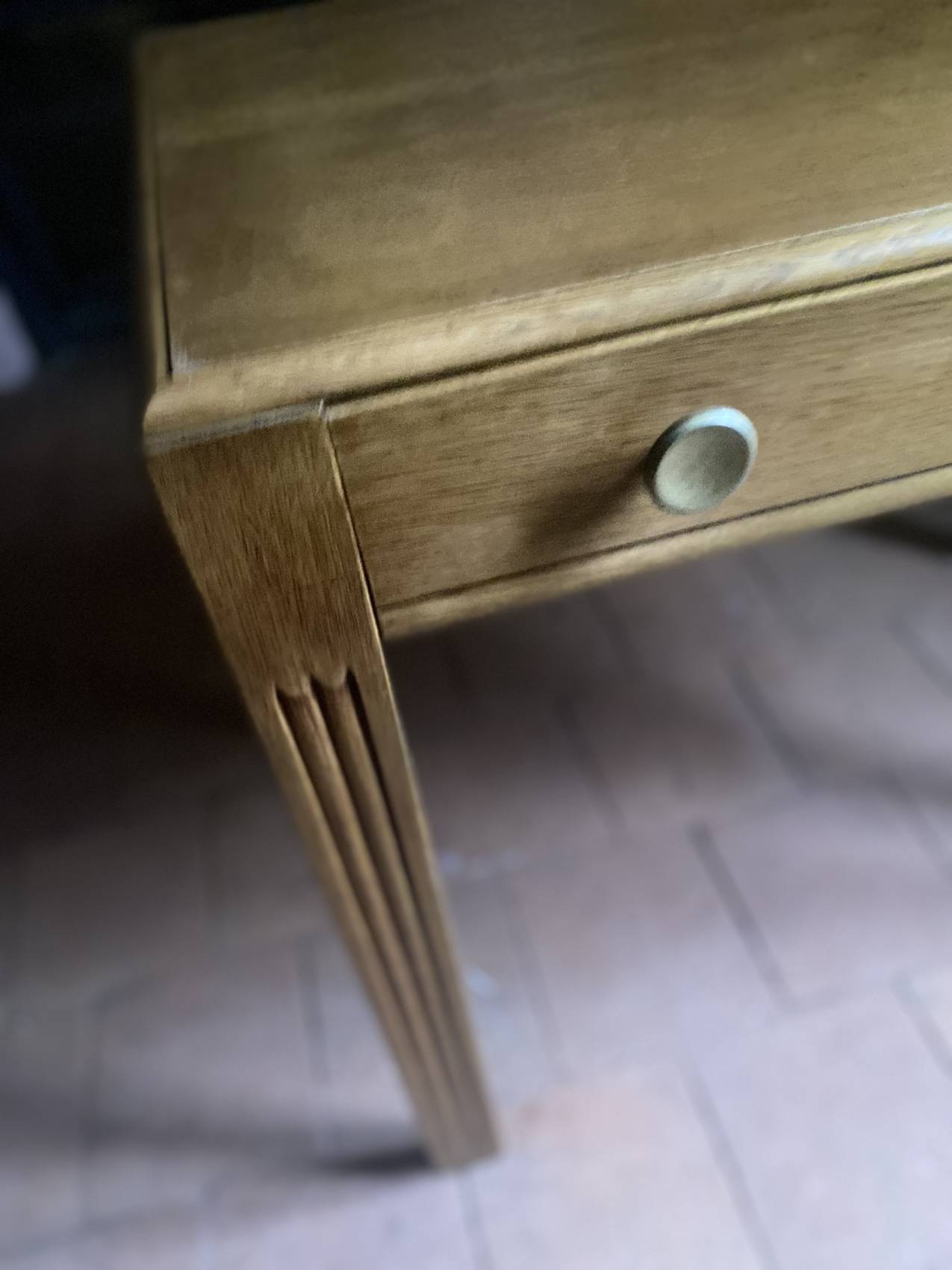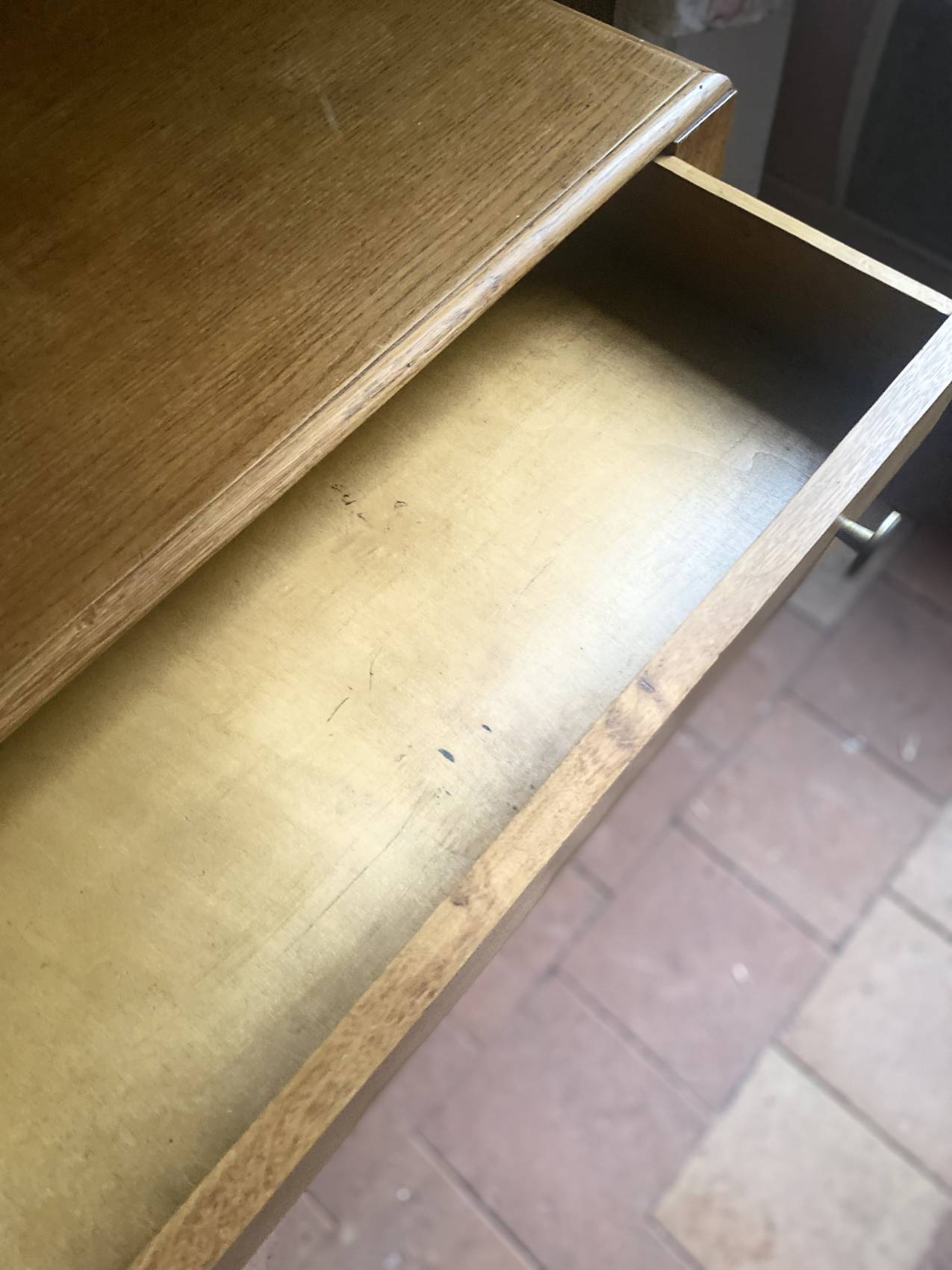 Dotée d’un grand tiroir occupant toute la largeur du plateau, elle offre un espace de rangement discret et pratique. Sa teinte claire en chêne blond et son état d’origine impeccable lui confèrent un charme authentique, tout en restant résolument contemporaine.