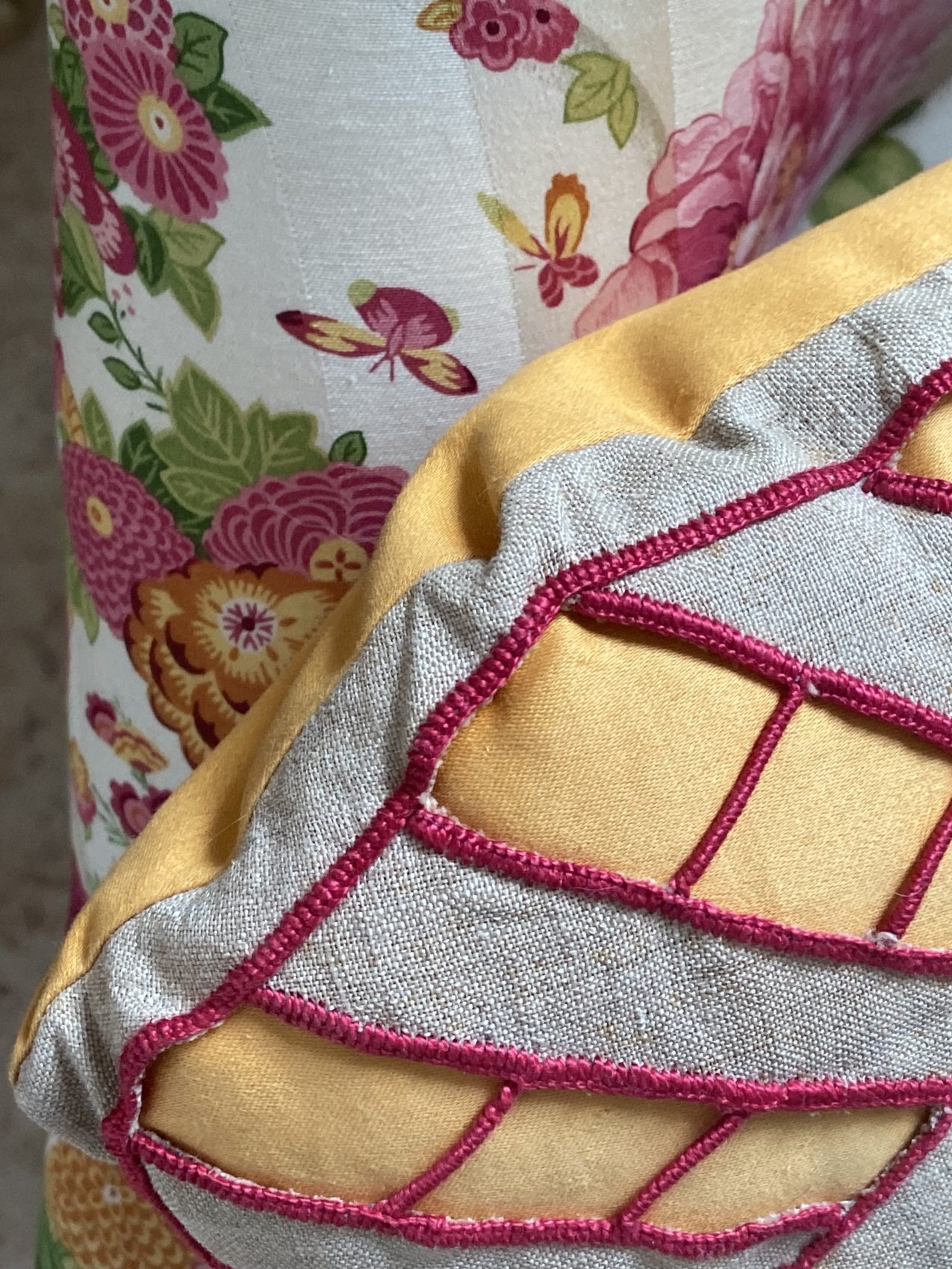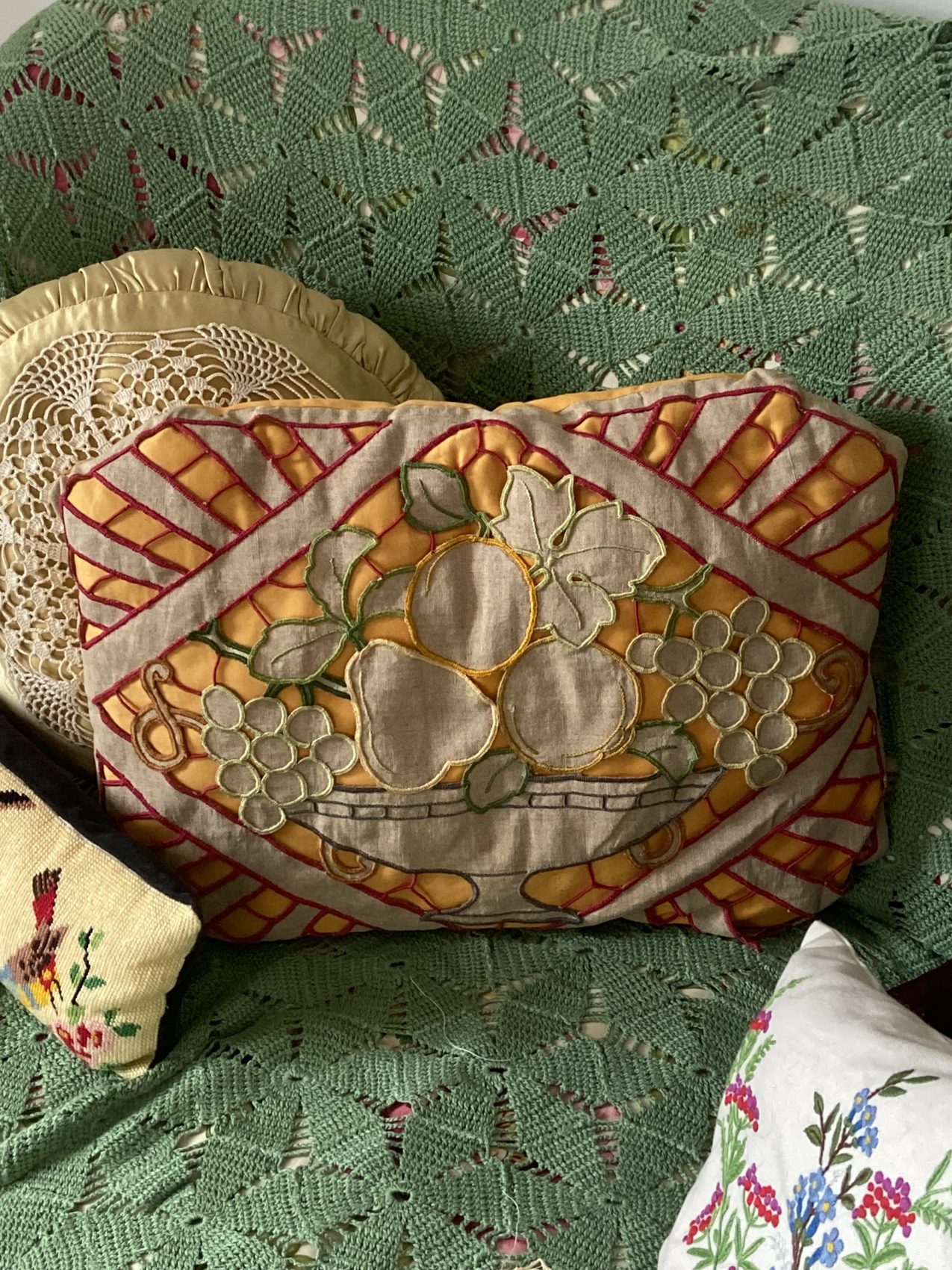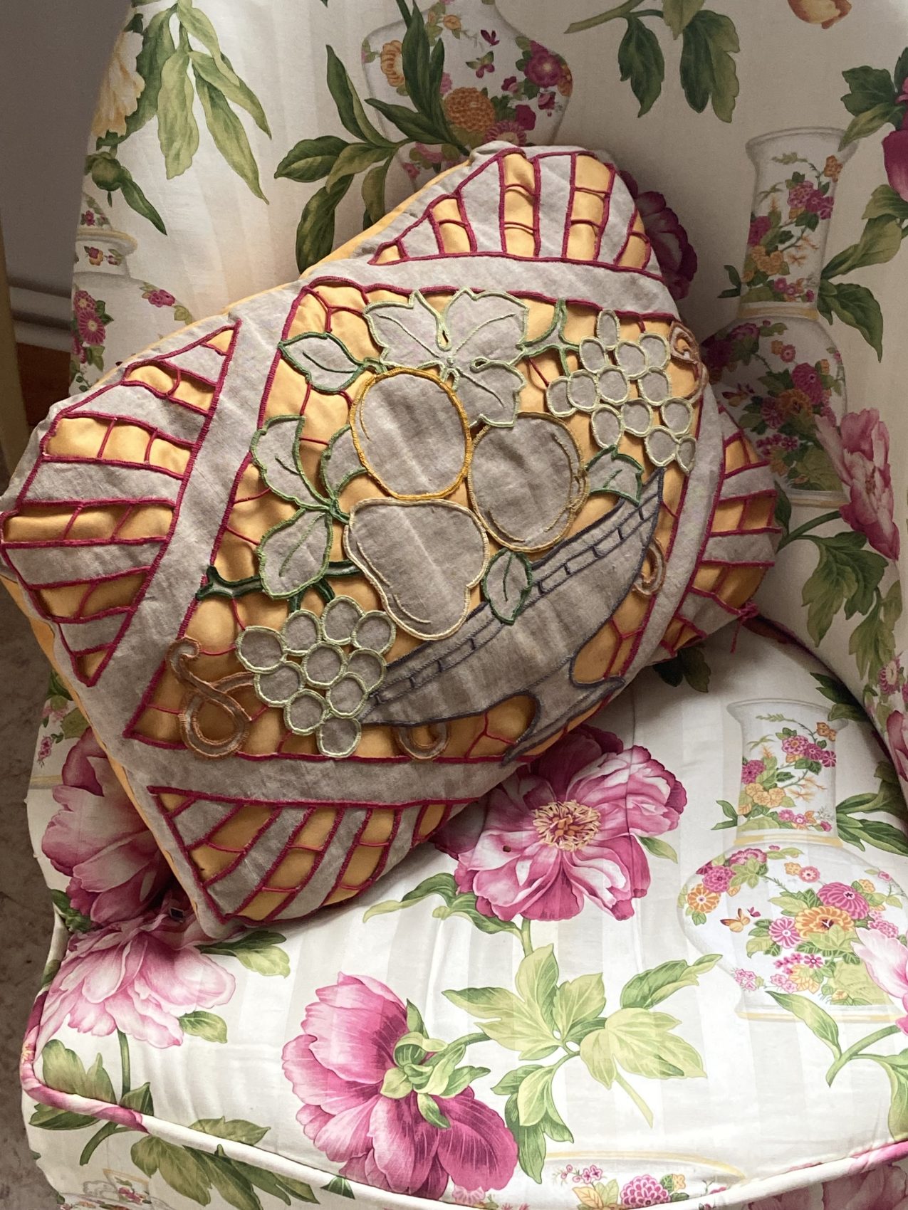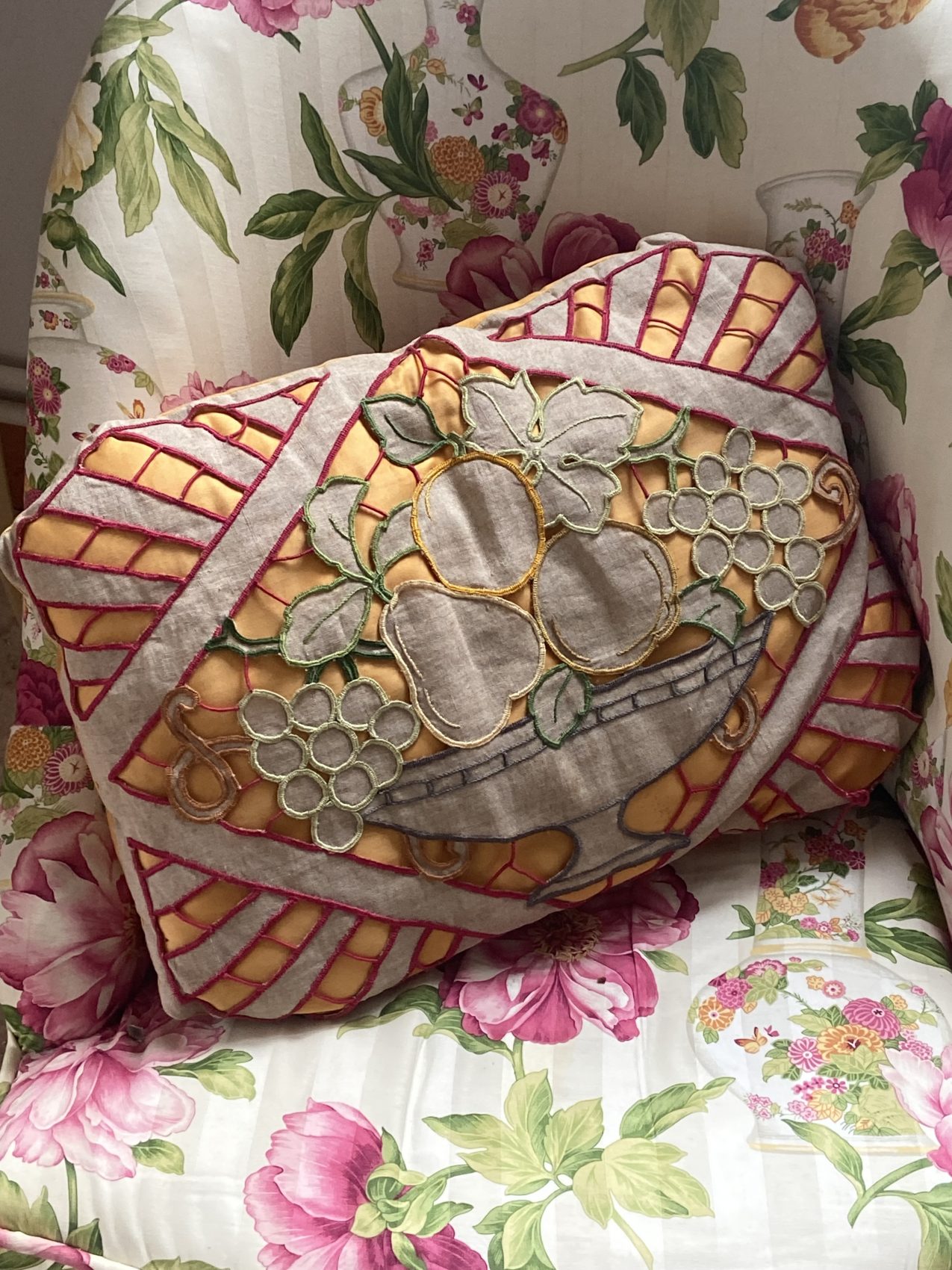 Ce type de coussin à motif fruité se plaçait souvent sur les canapés, méridiennes ou fauteuils de salon bourgeois, en écho aux tentures florales.