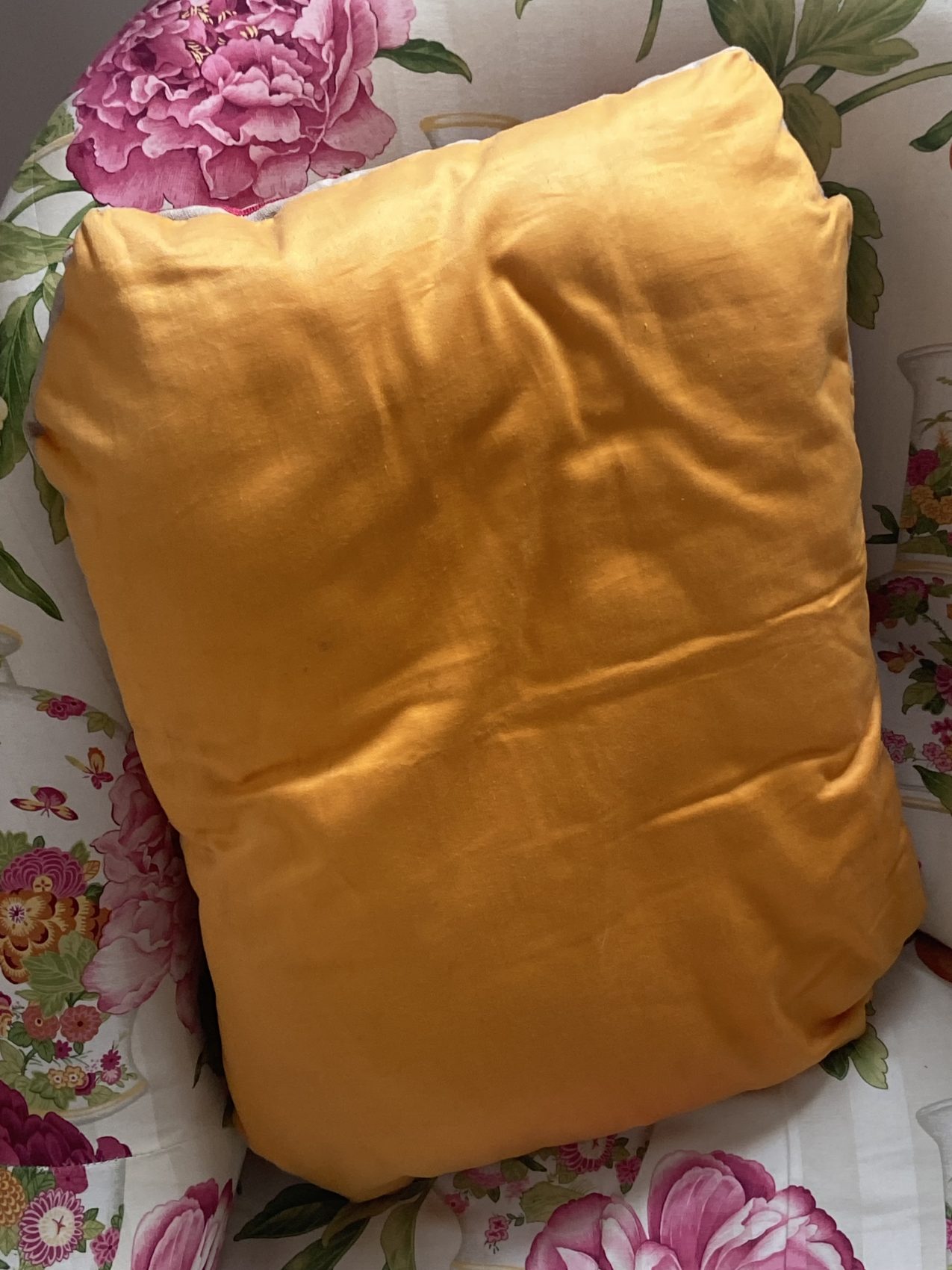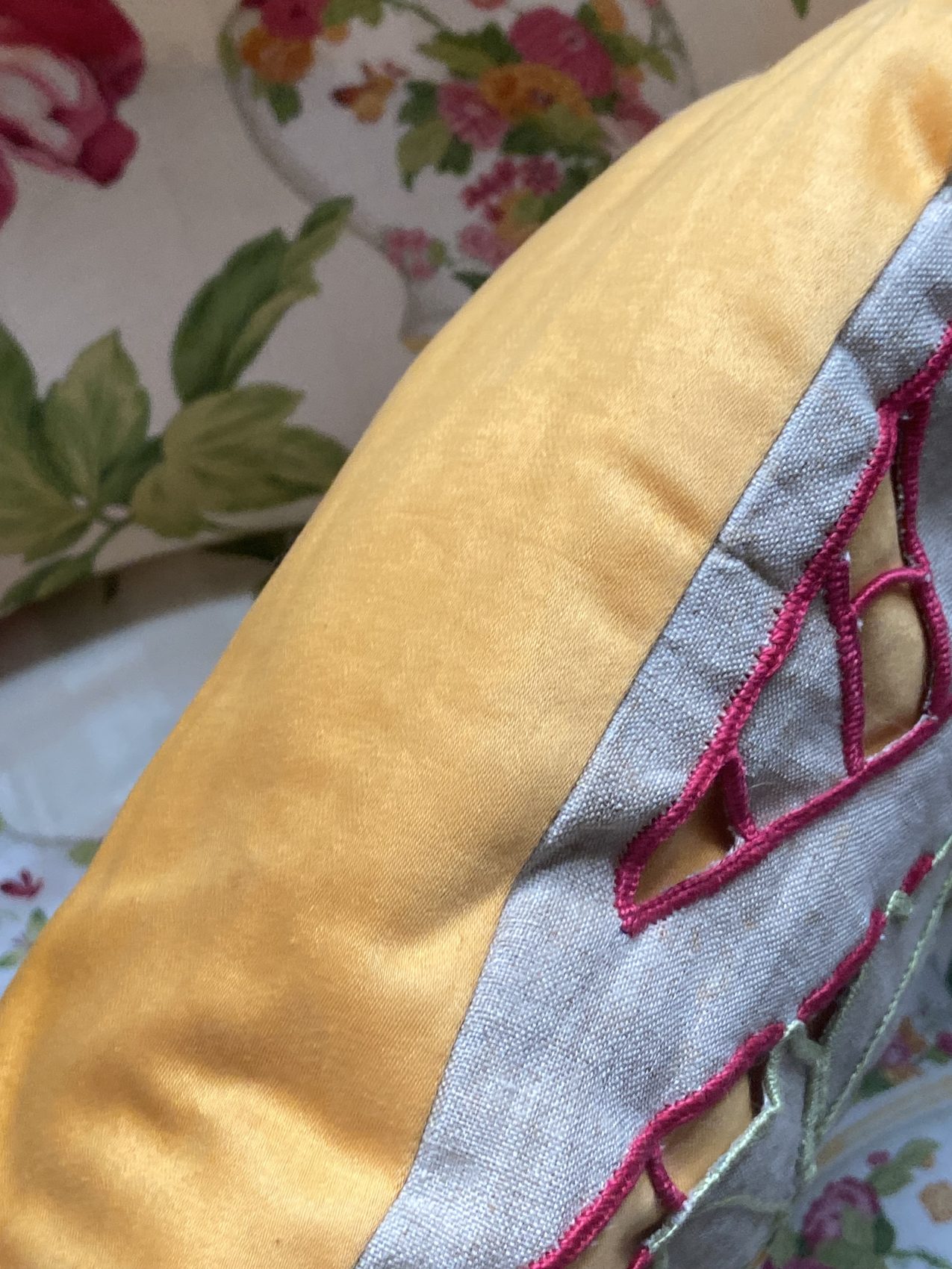 Il s’agit d’un coussin ancien, rénové (nouveau rembourrage), conservant son tissu et son charme d’origine.