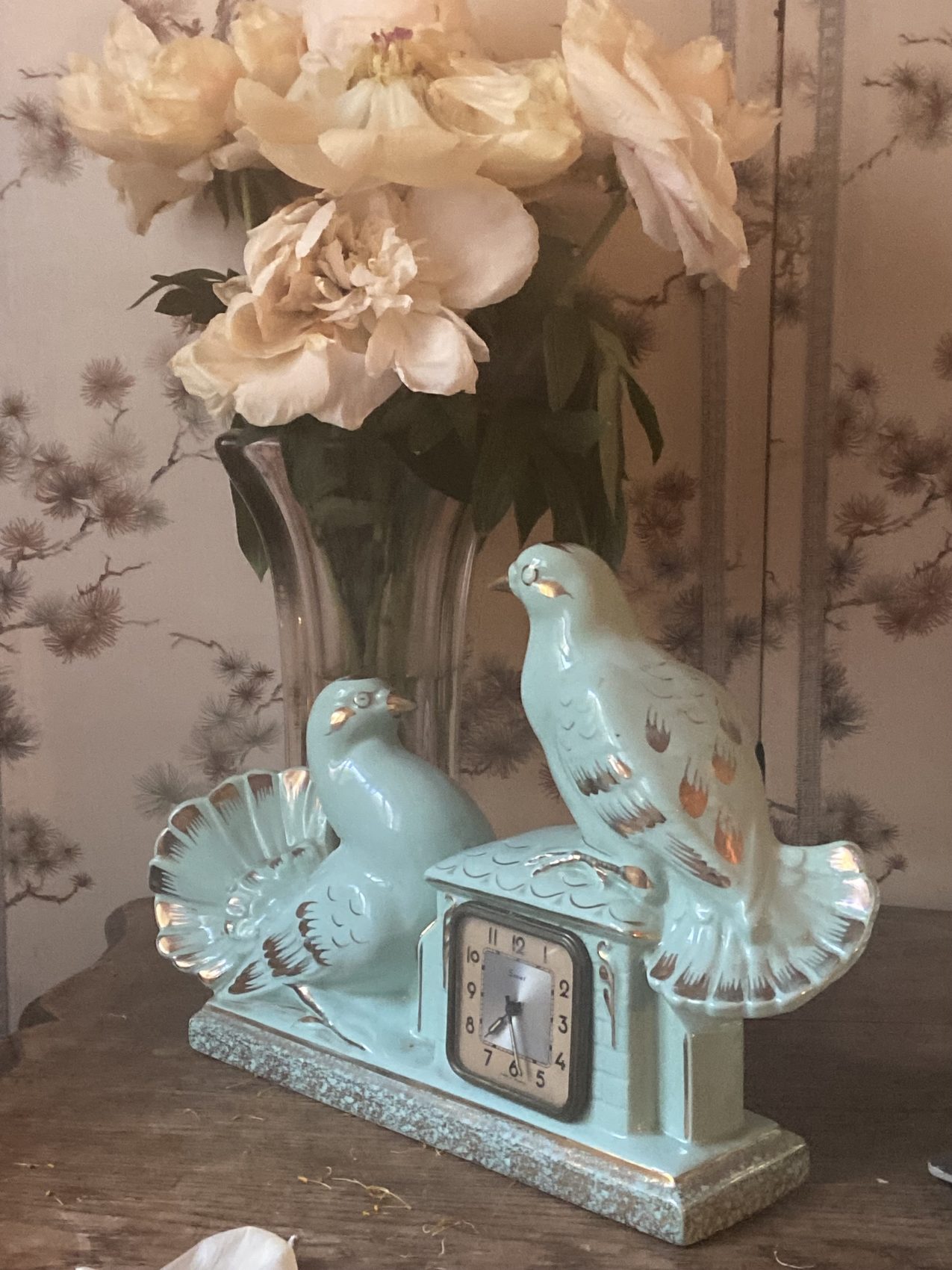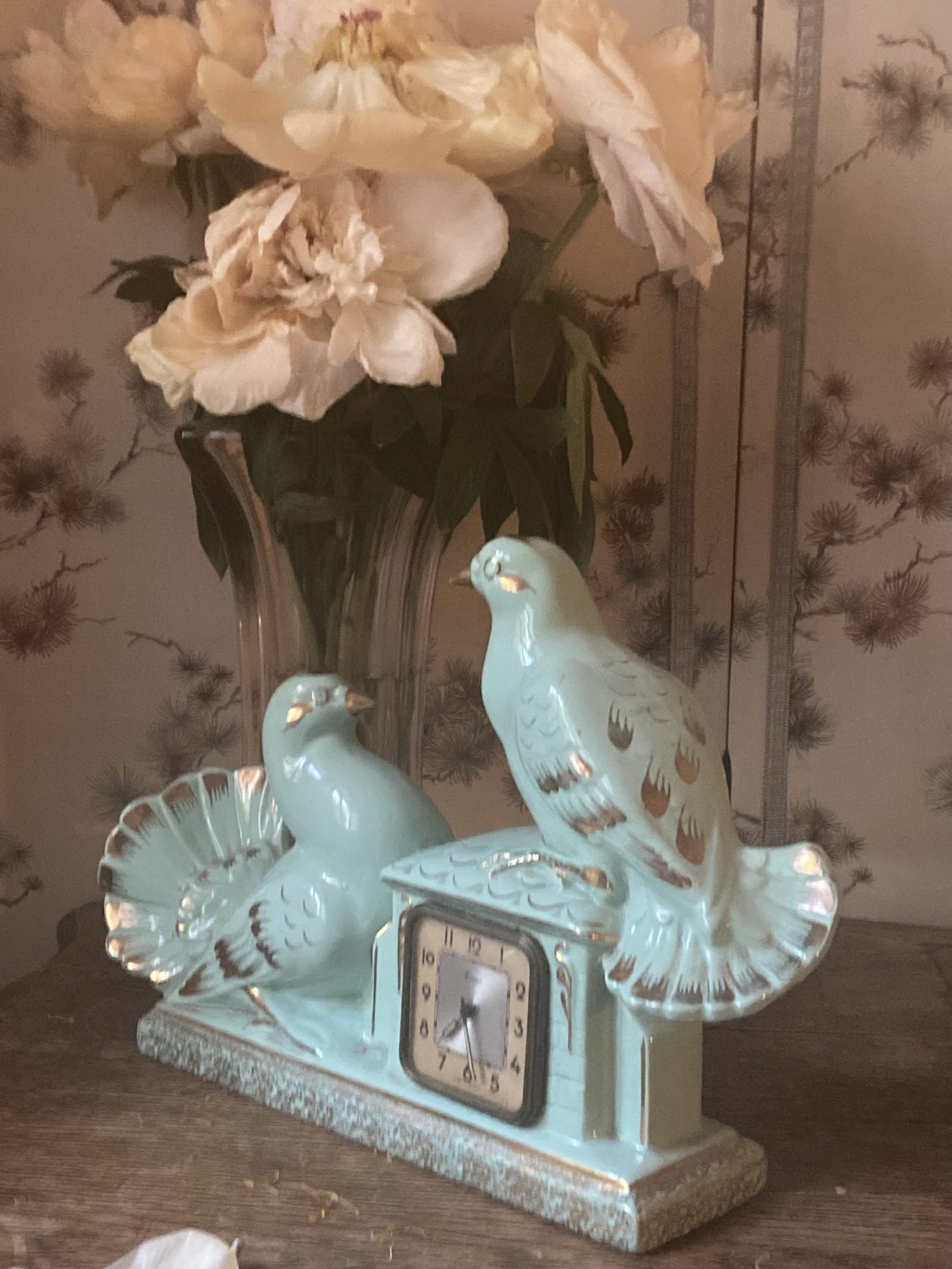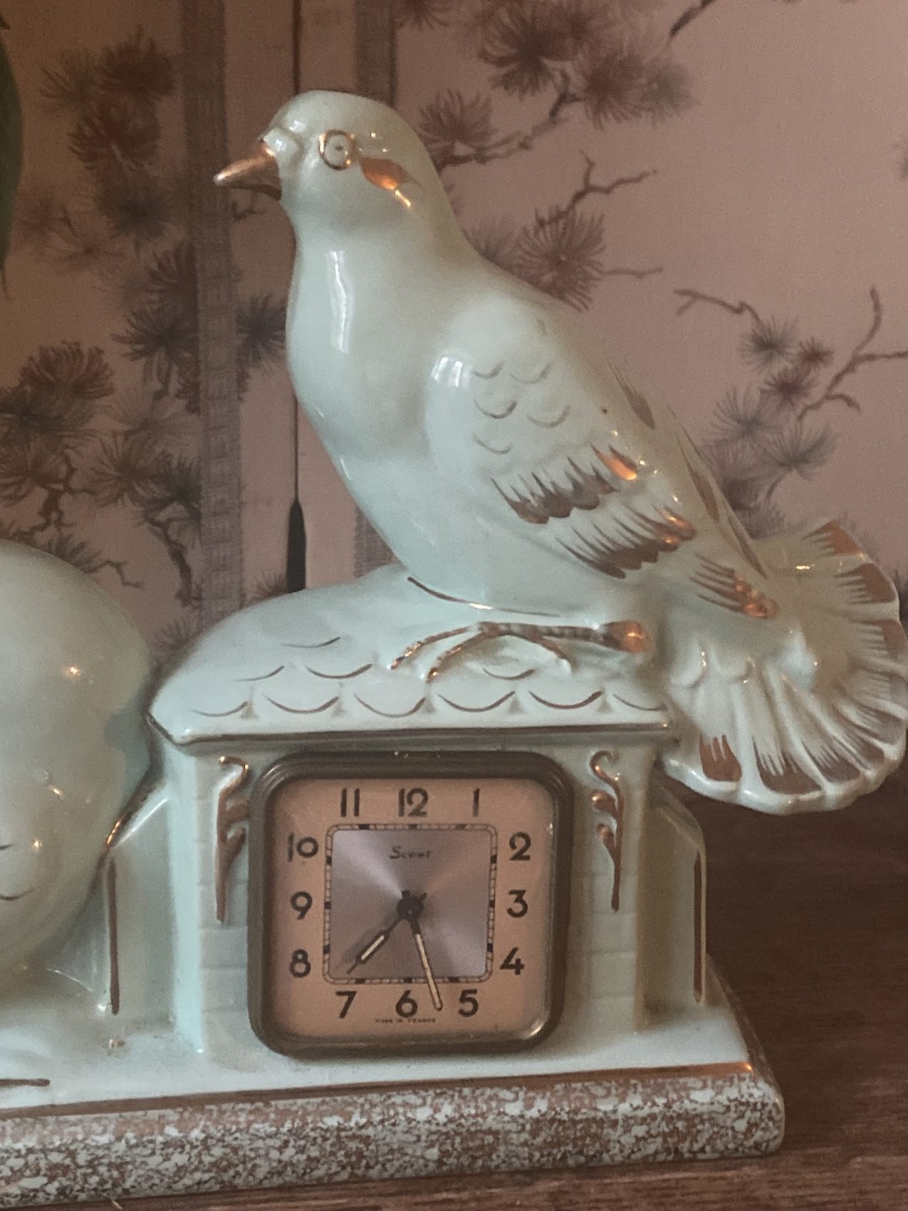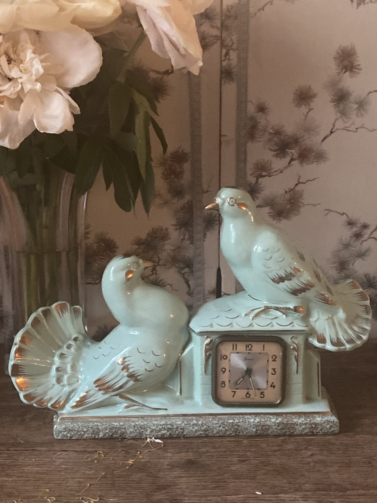 À la fois décorative et sentimentale, cette pièce des années 30 incarne le raffinement rétro d’une époque où l’élégance flirtait avec la tendresse. L’horloge fonctionne, et le regard des pigeons semble encore tourné vers l’éternité.