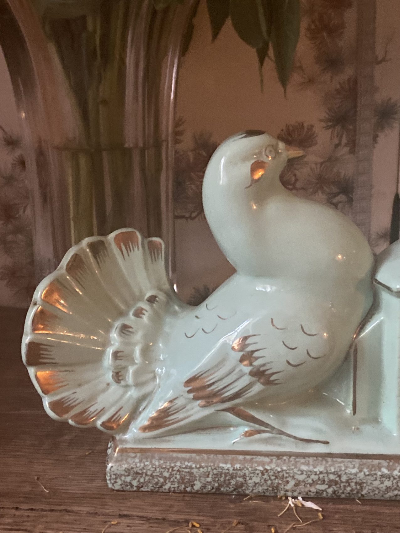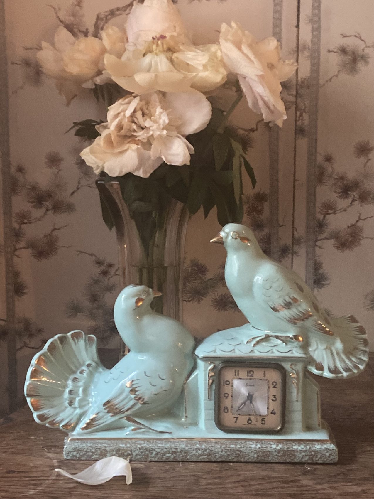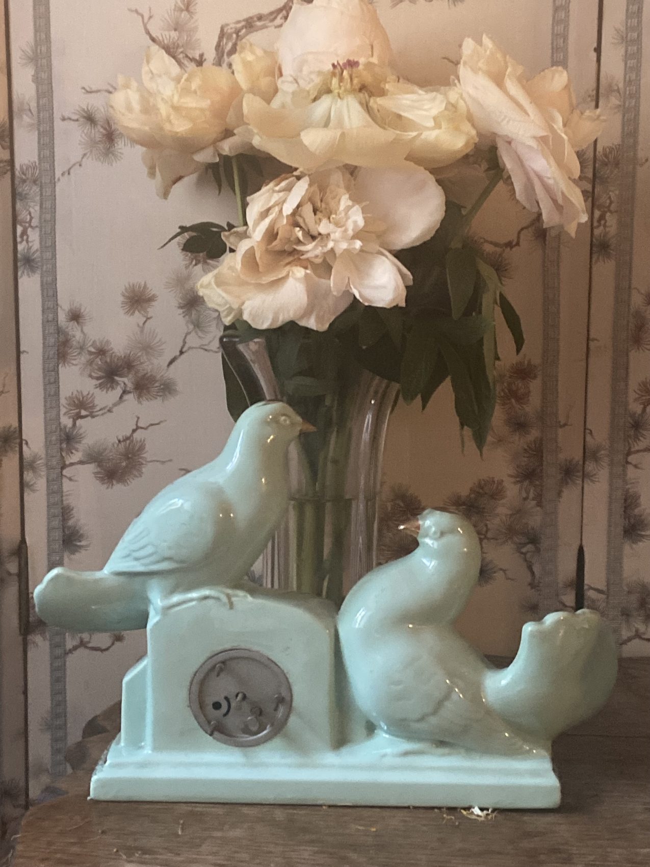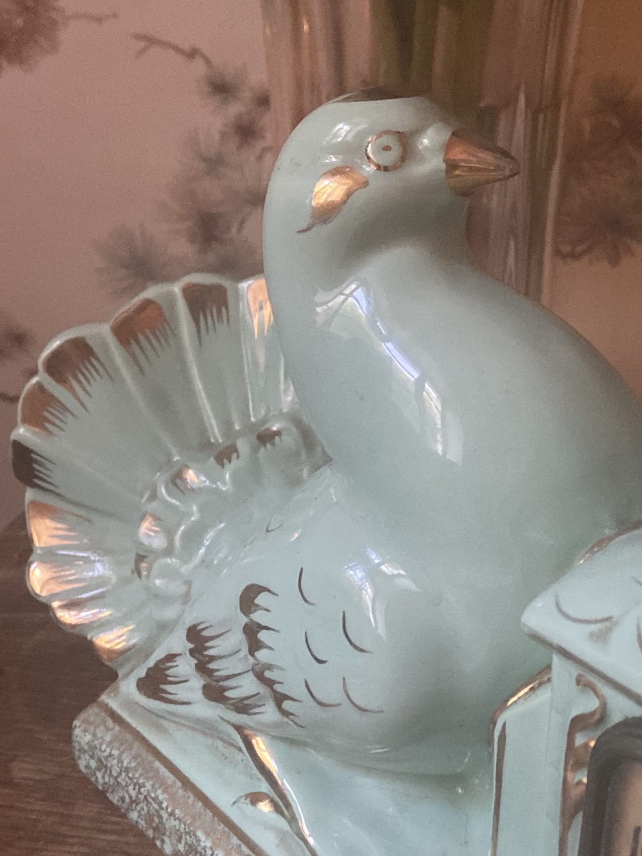 À la fois décorative et sentimentale, cette pièce des années 30 incarne le raffinement rétro d’une époque où l’élégance flirtait avec la tendresse. L’horloge fonctionne, et le regard des pigeons semble encore tourné vers l’éternité.