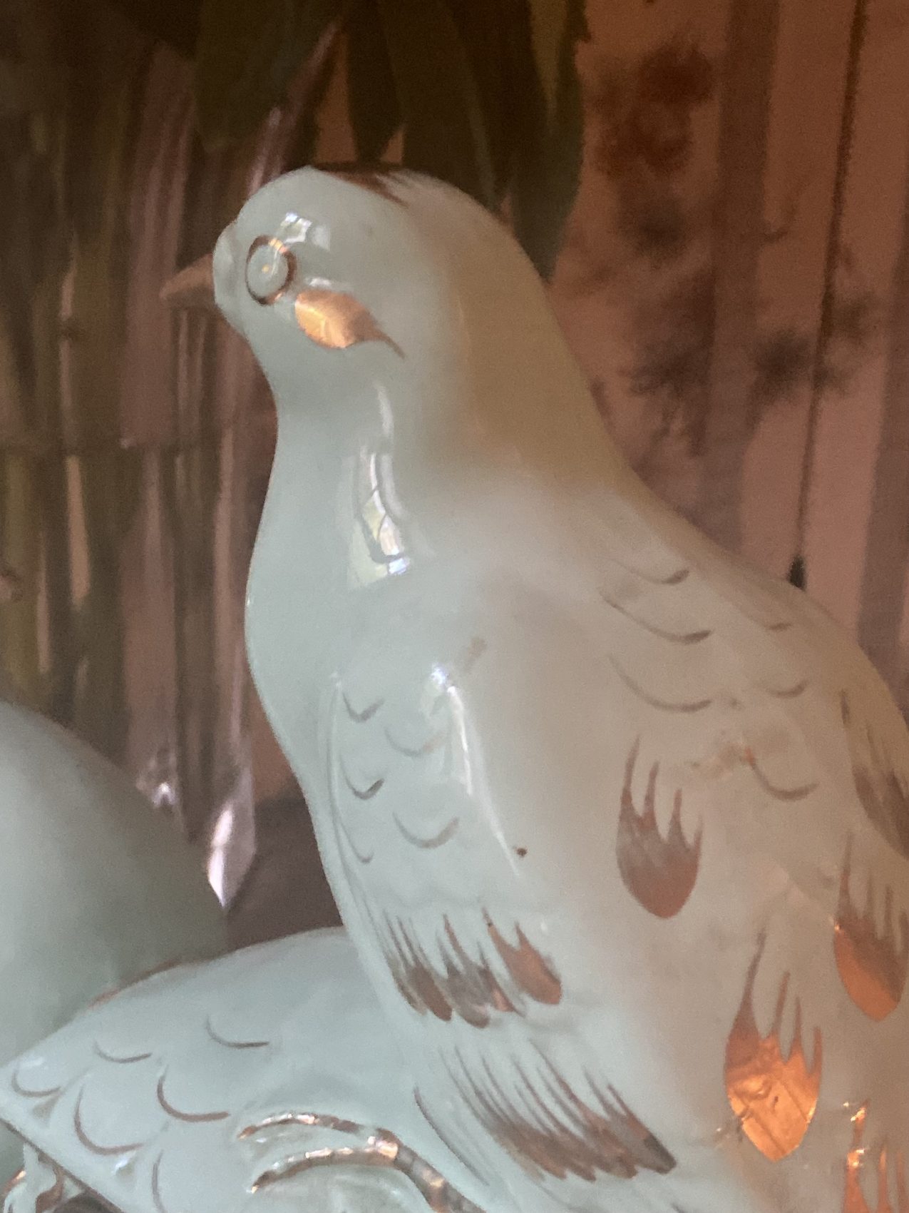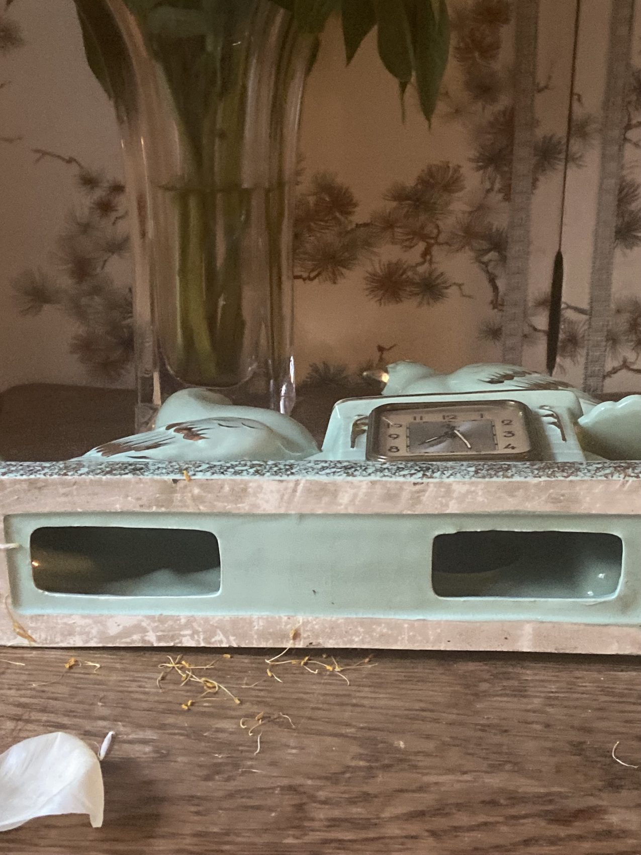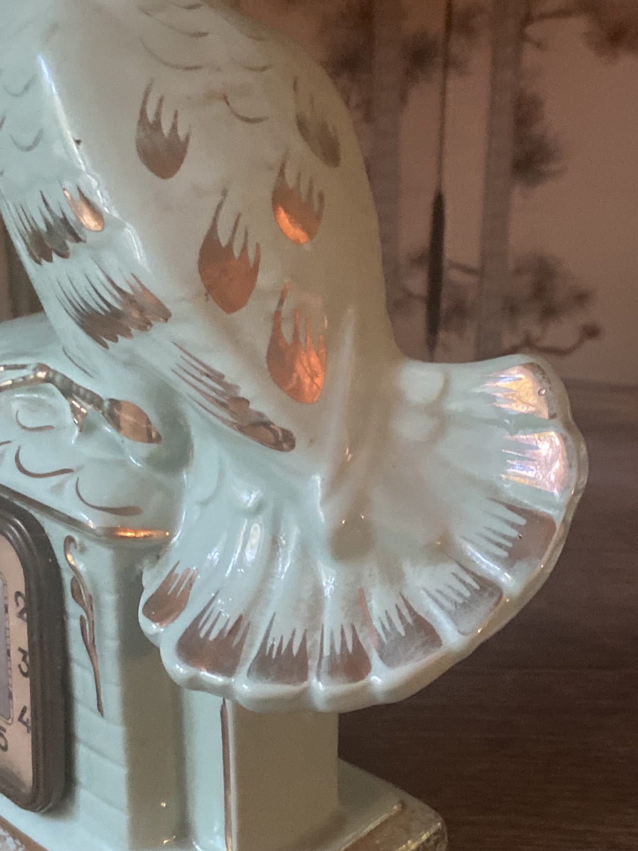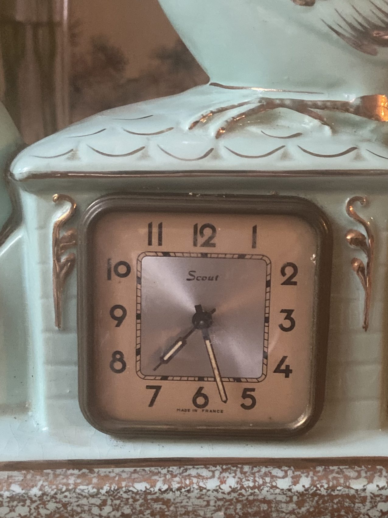 À la fois décorative et sentimentale, cette pièce des années 30 incarne le raffinement rétro d’une époque où l’élégance flirtait avec la tendresse. L’horloge fonctionne, et le regard des pigeons semble encore tourné vers l’éternité.