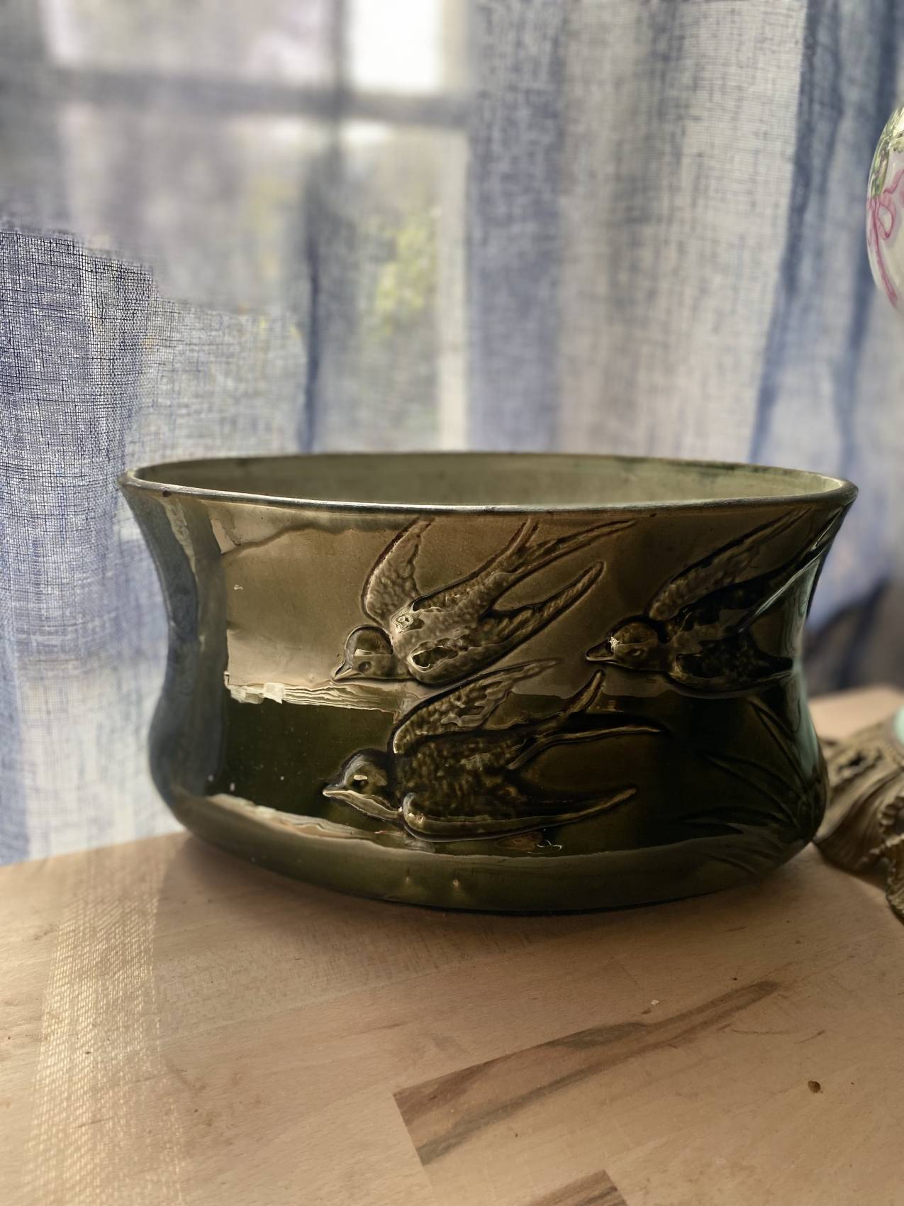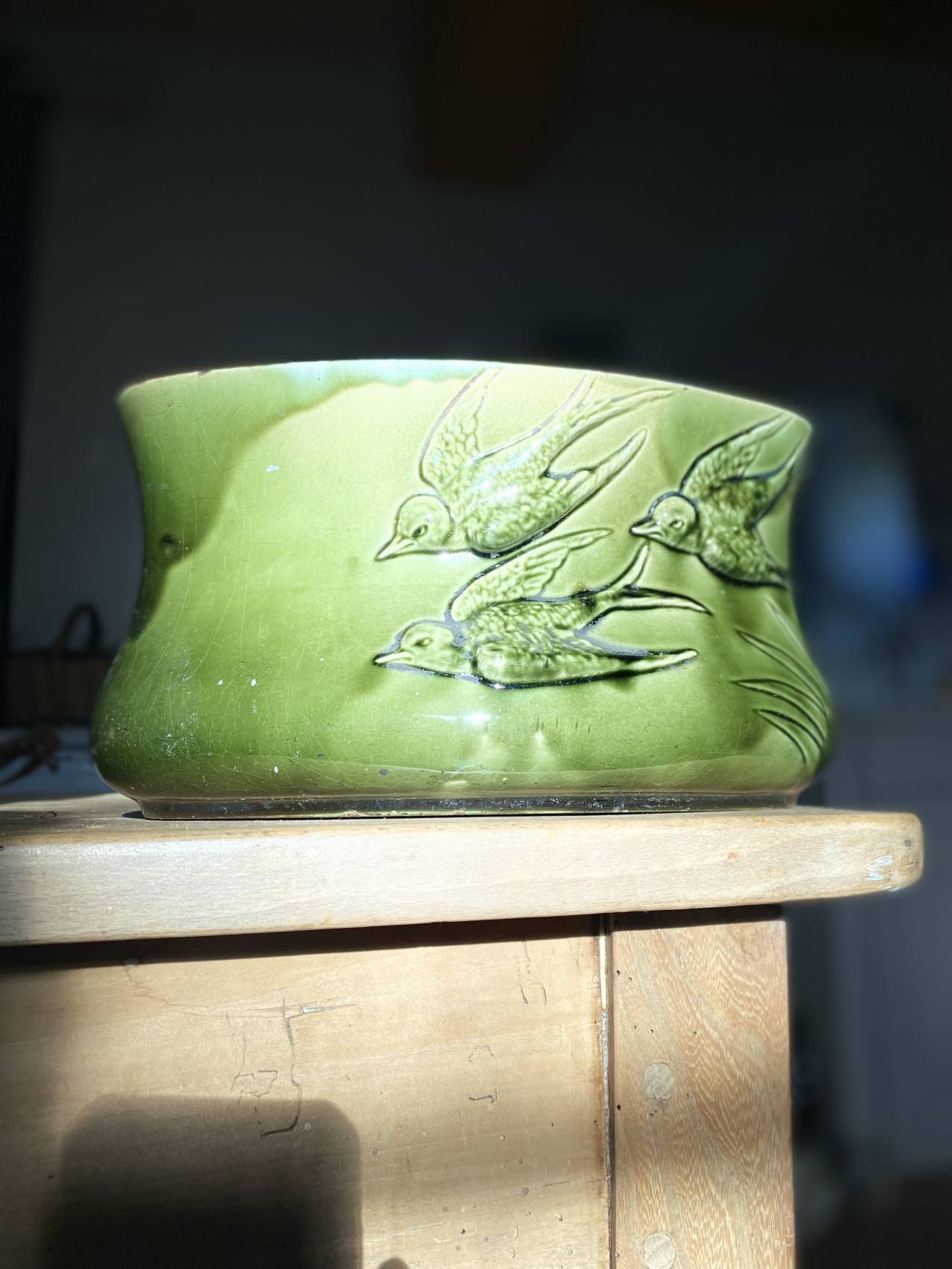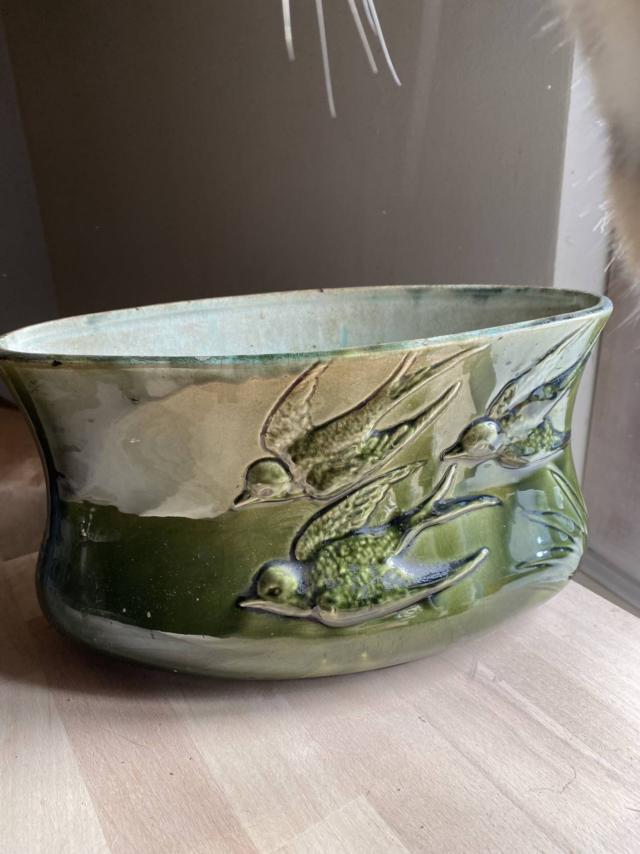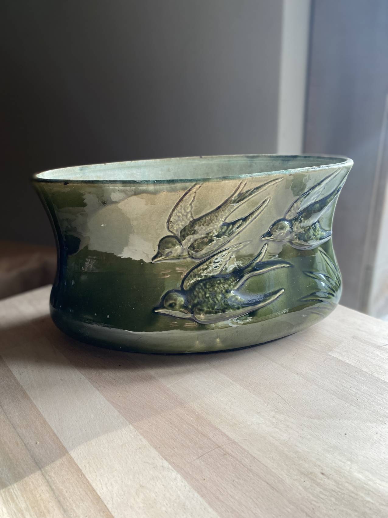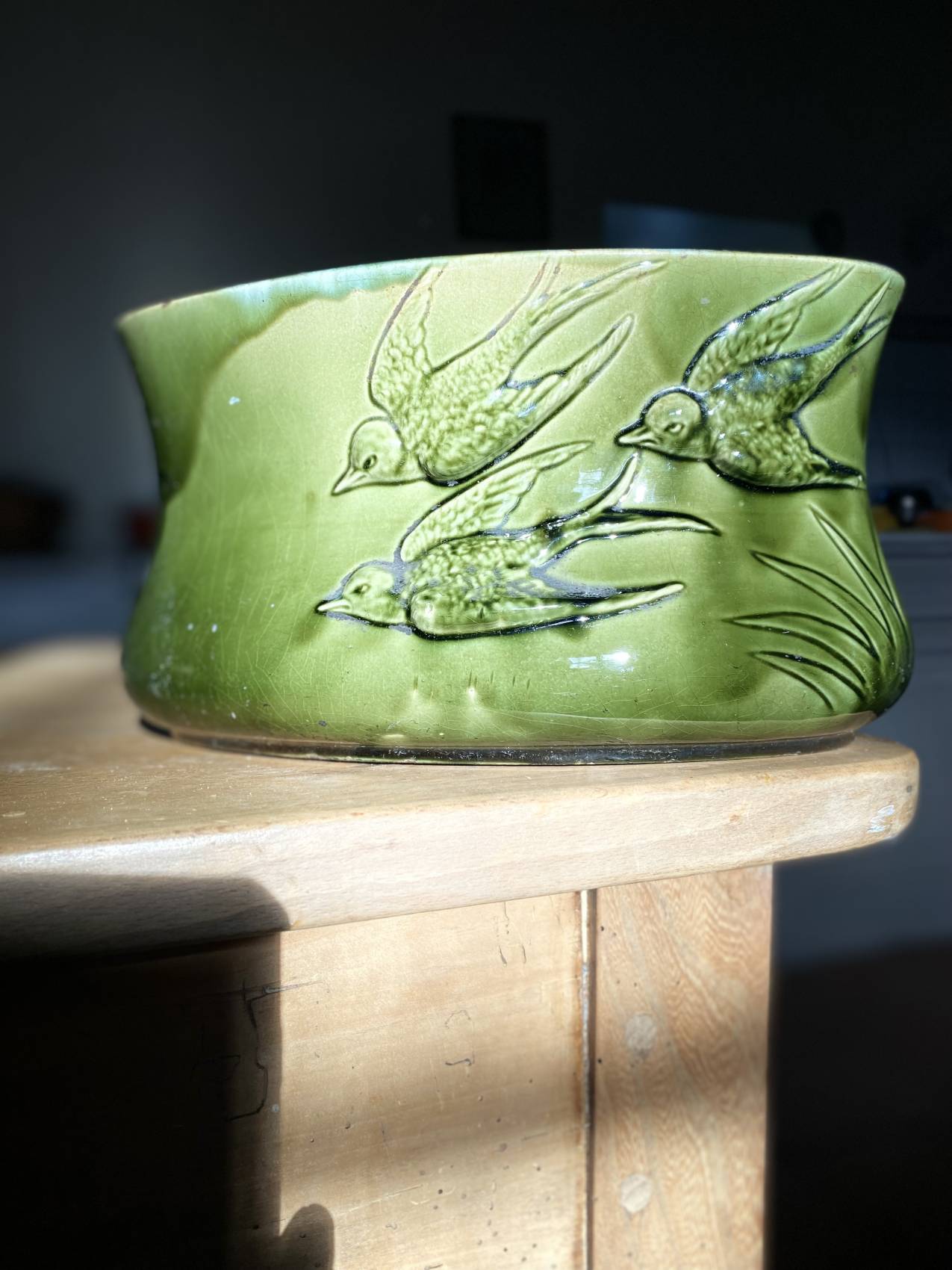 Découvrez cette jardinière en faïence barbotine époque 1900 ,motifs d’hirondelles en faïence barbotine verte en superbe état d’origine exempte de fêlure et manque, ce qui devient une rareté pour des pieces fragiles de plus d’un siècle.