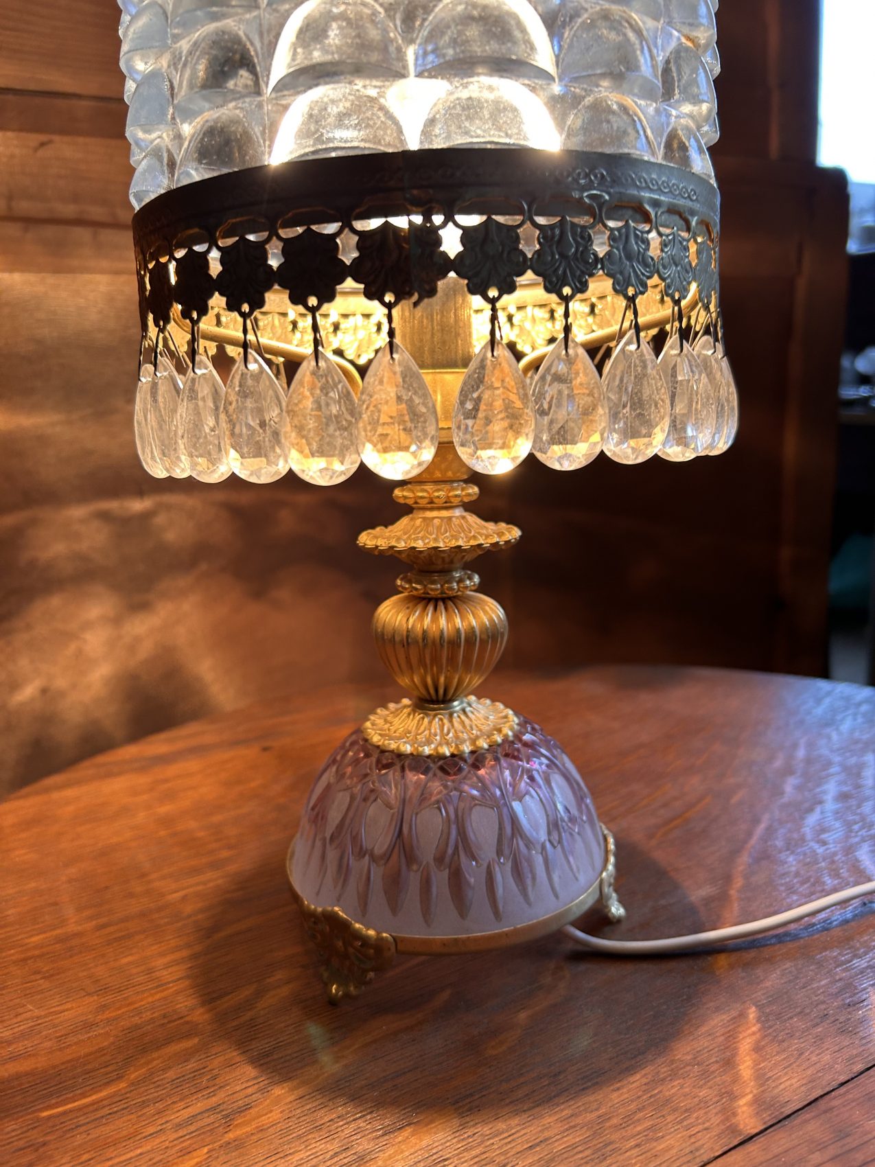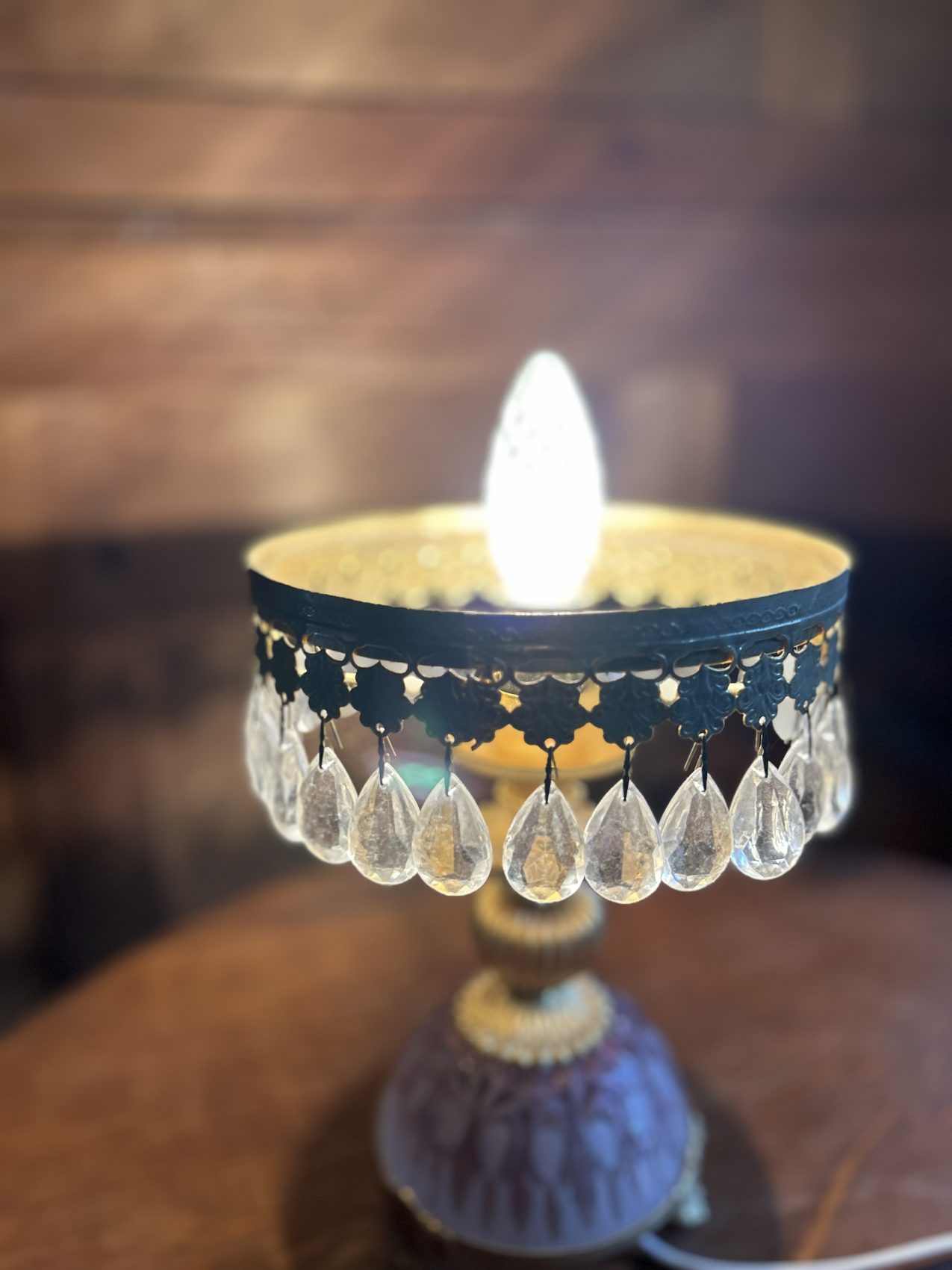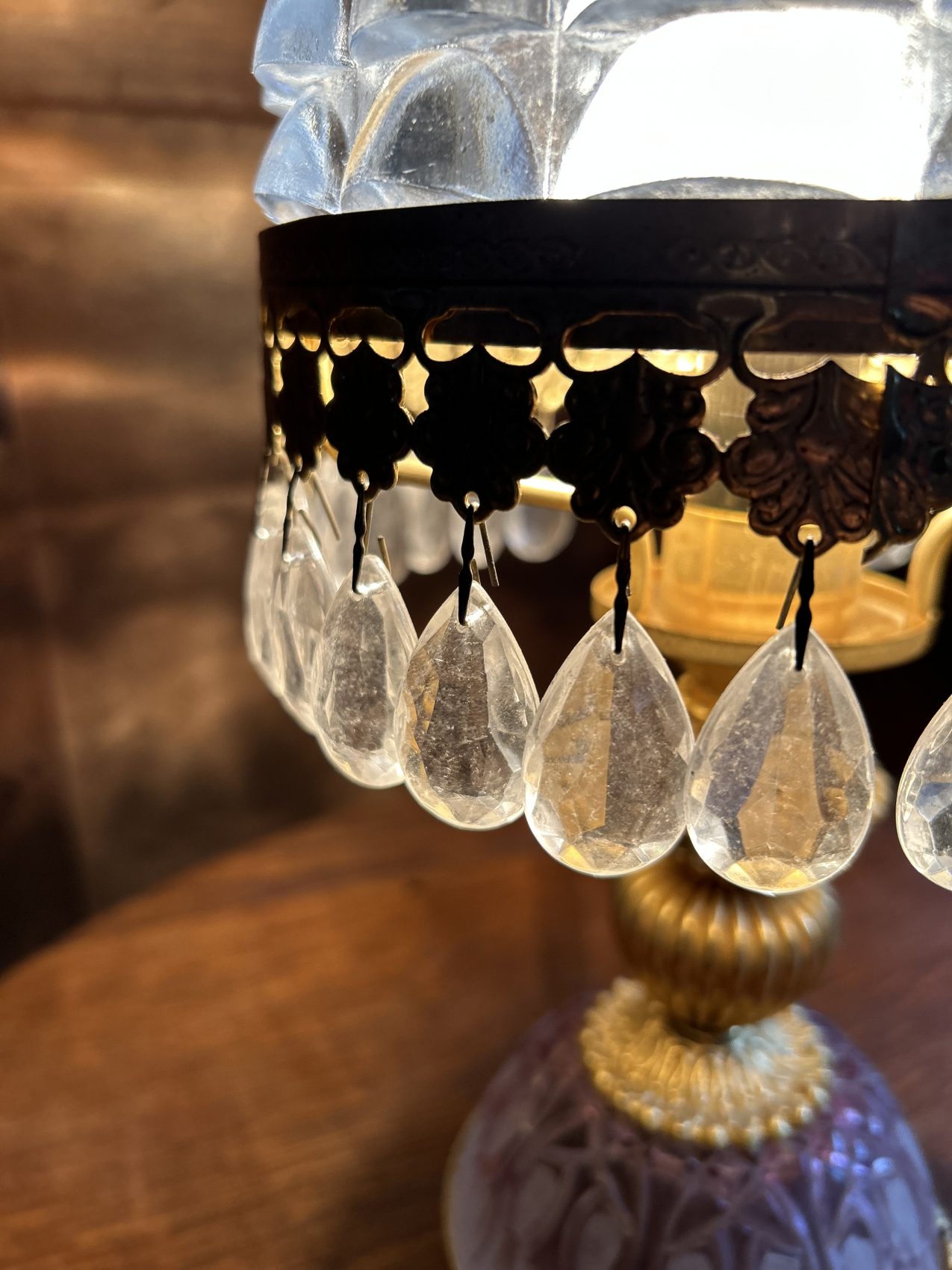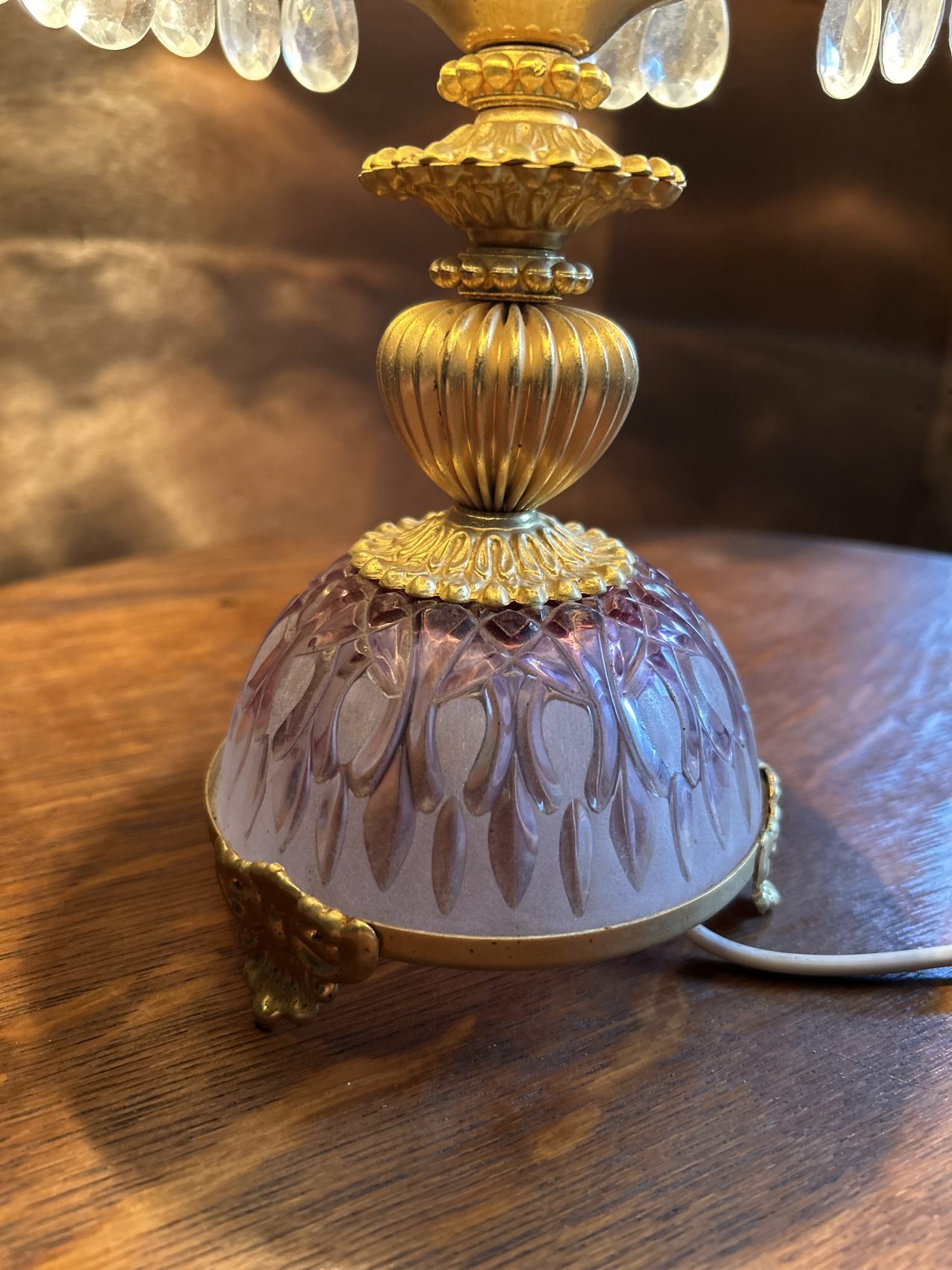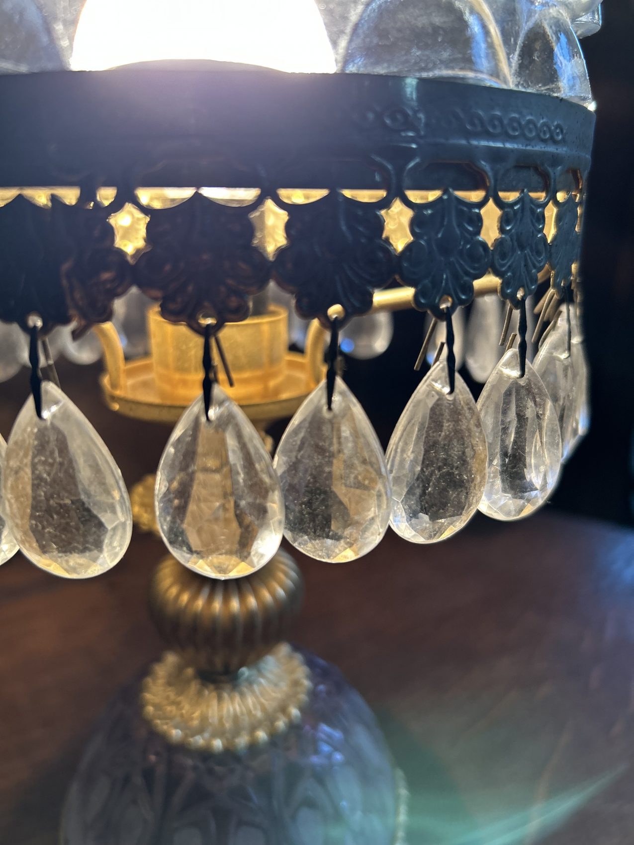Ou II s’agit d’une lampe ancienne vintage chinée, avec une patine d’origine et des traces du temps normales à savoir 4 pampilles sont manquantes.