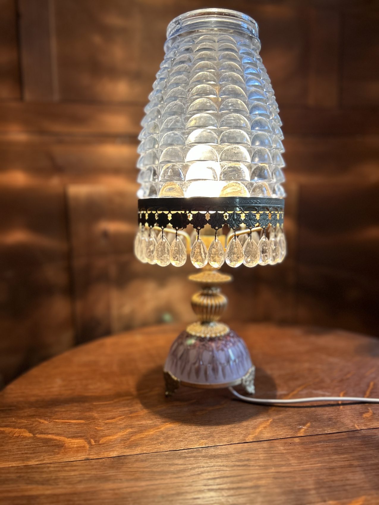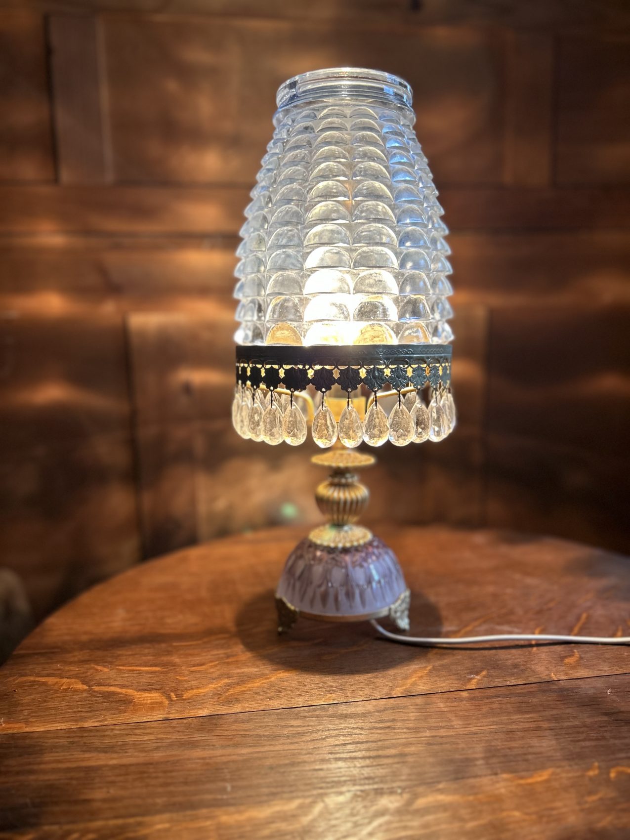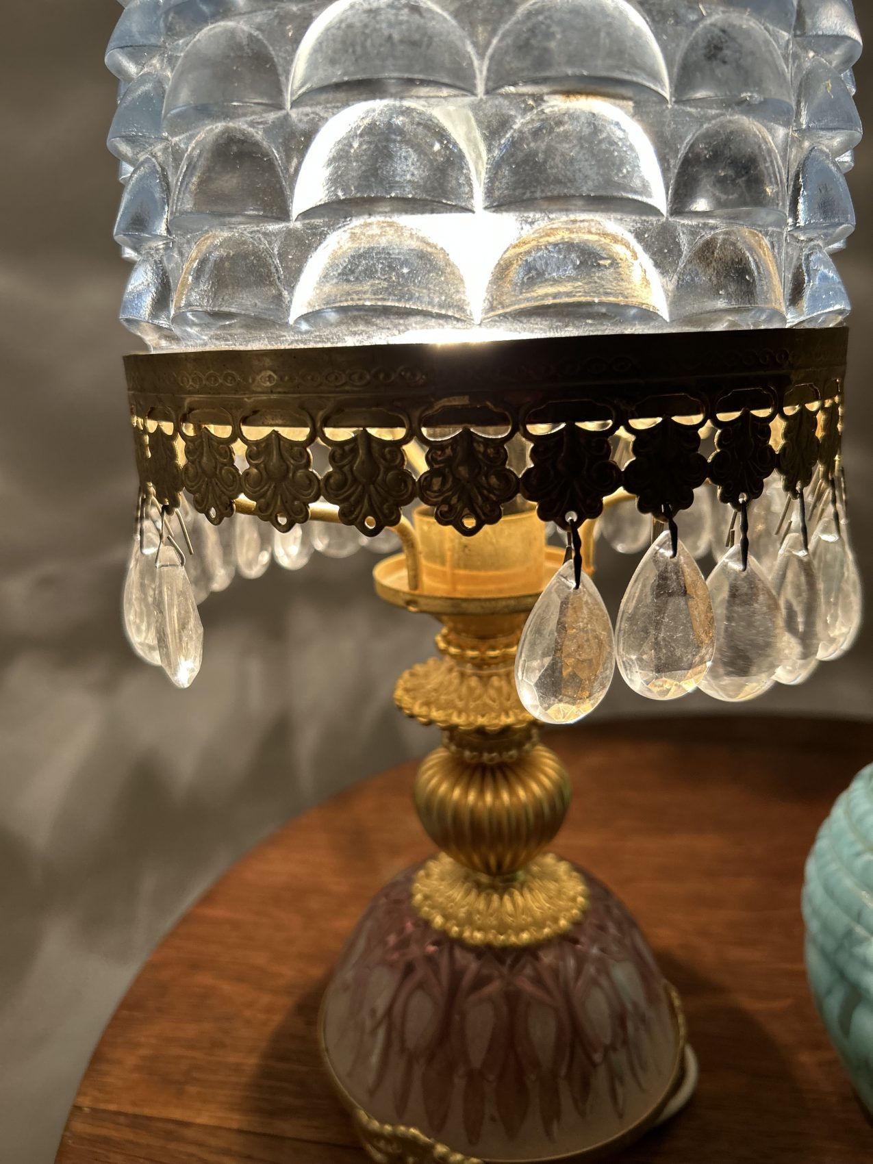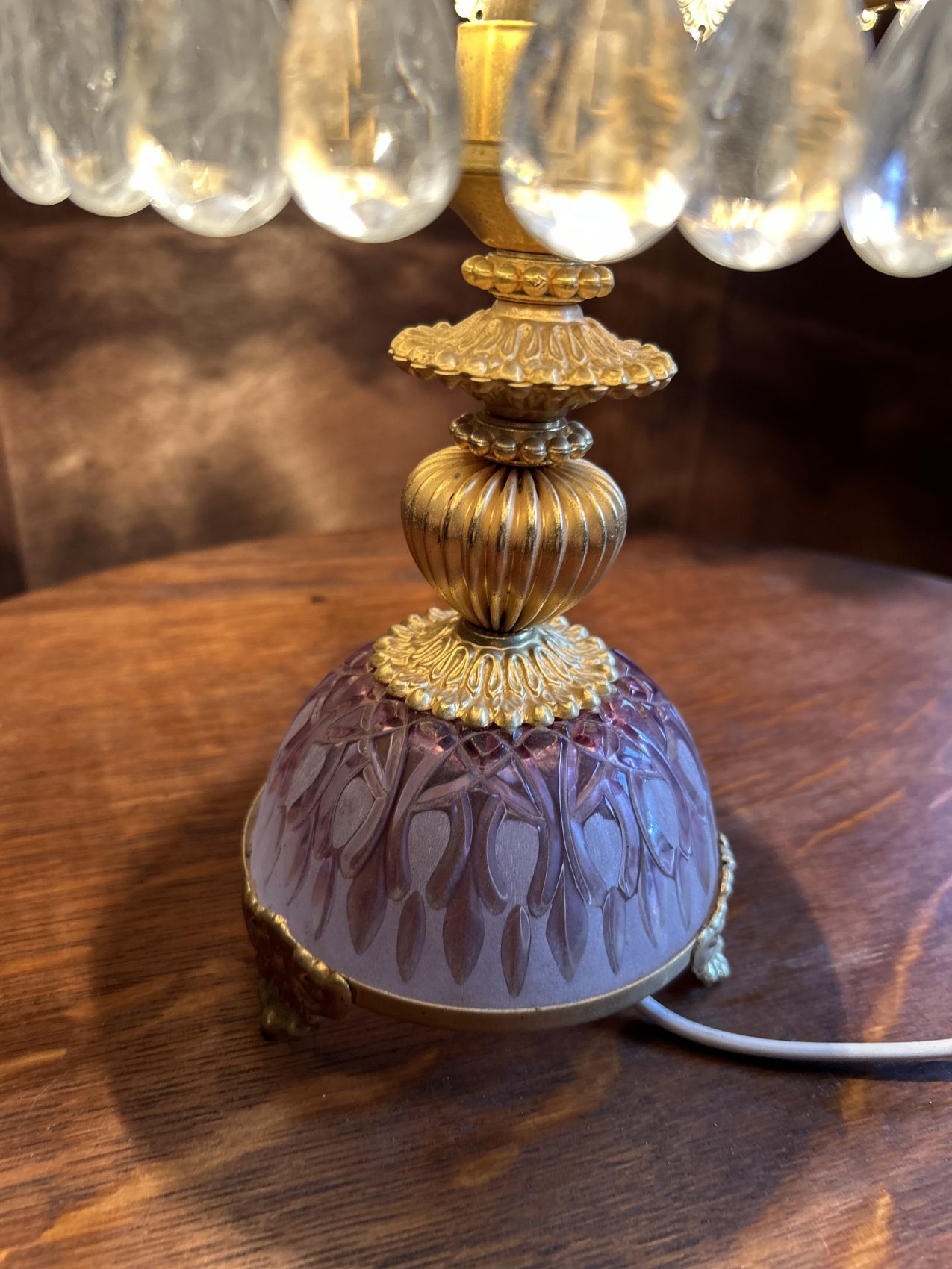 Ou II s’agit d’une lampe ancienne vintage chinée, avec une patine d’origine et des traces du temps normales à savoir 4 pampilles sont manquantes.