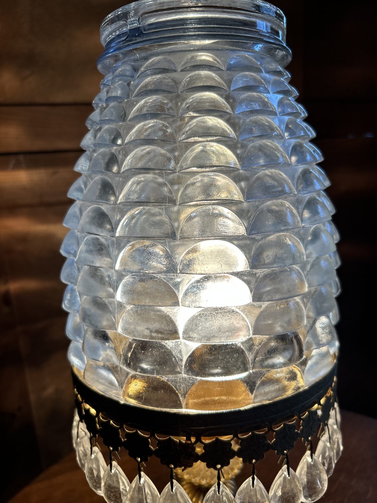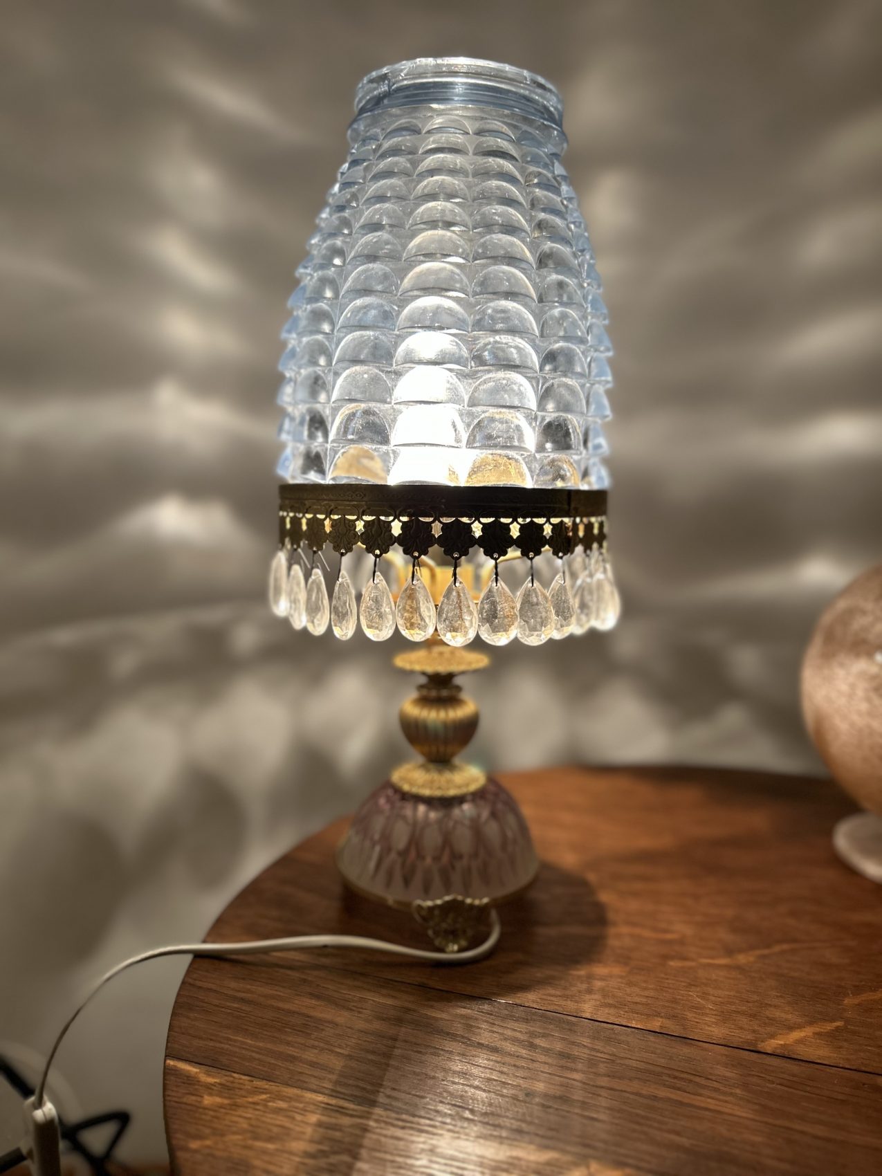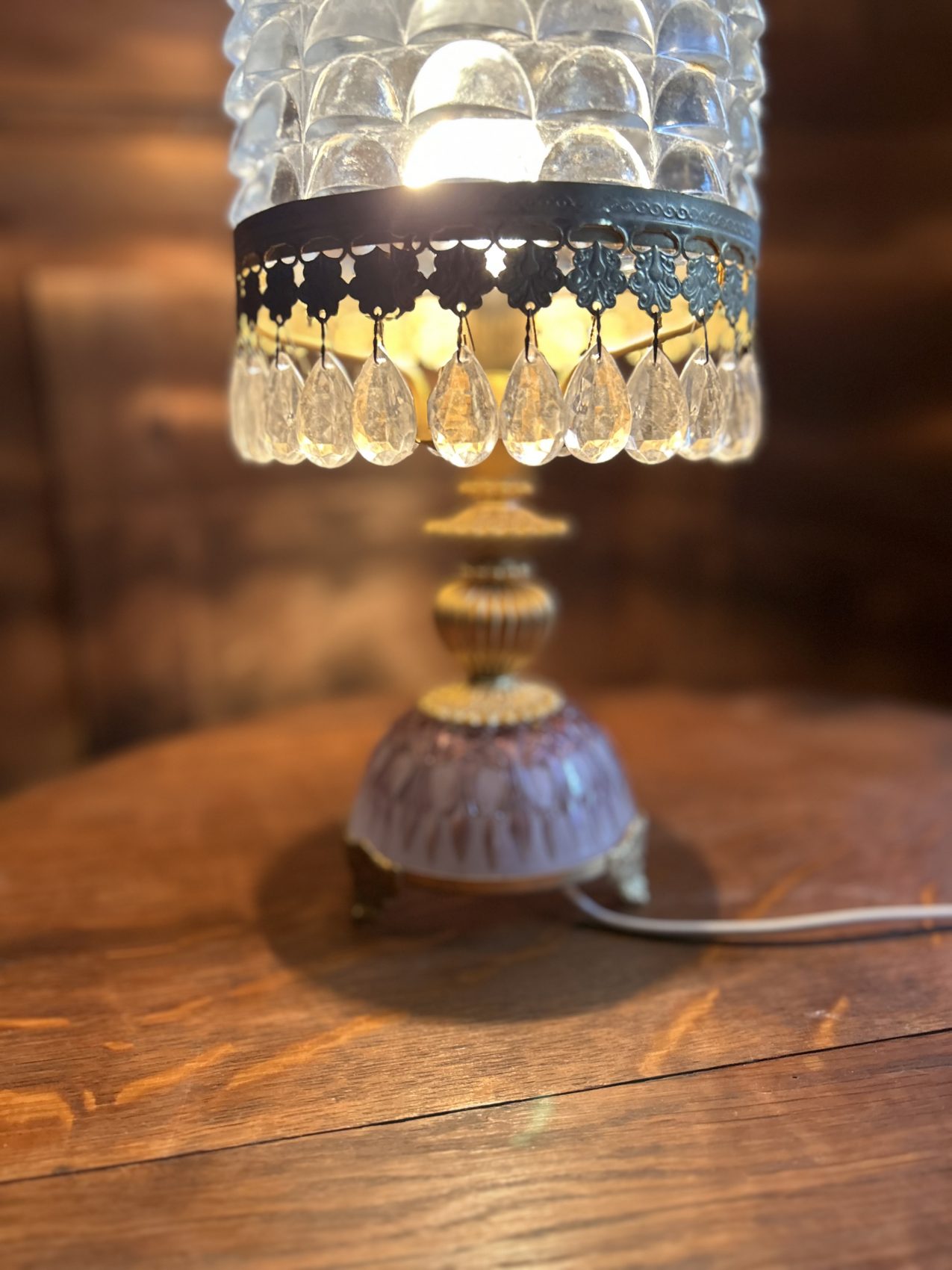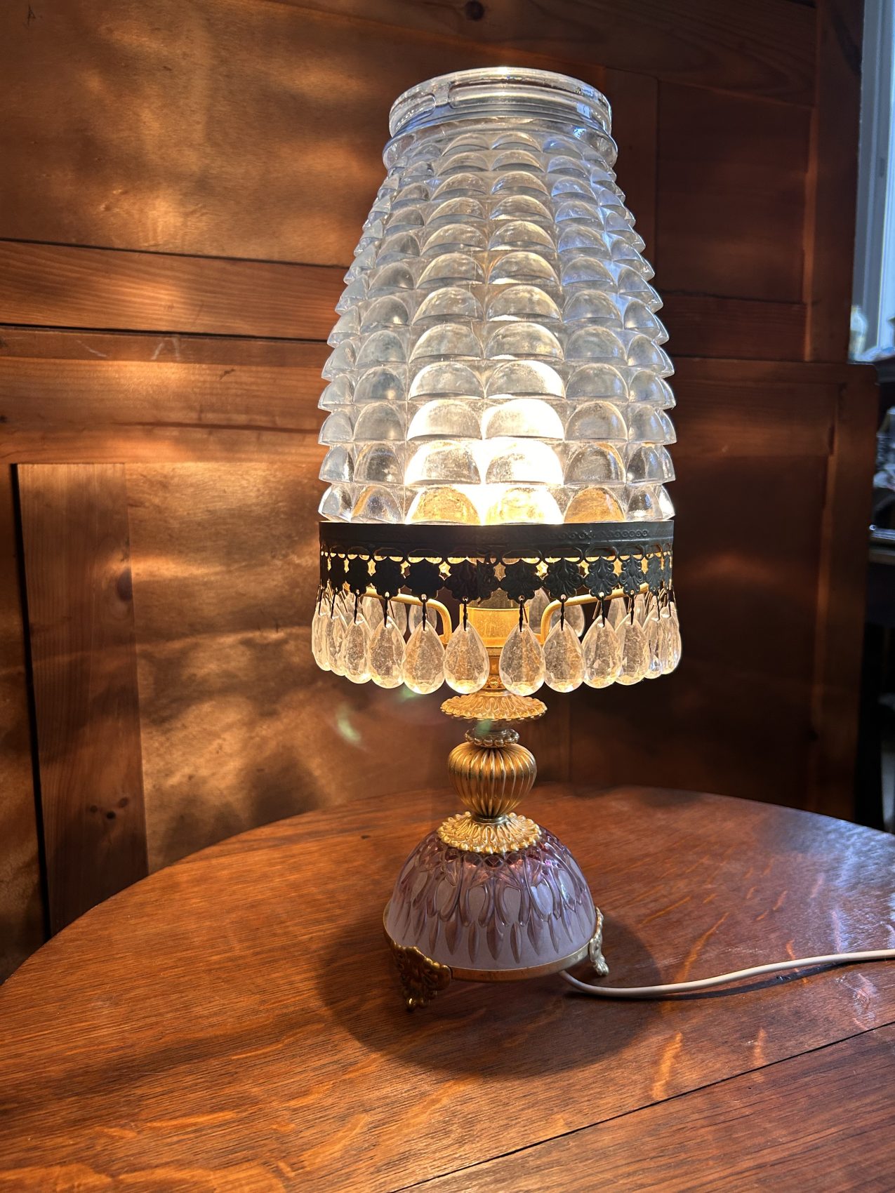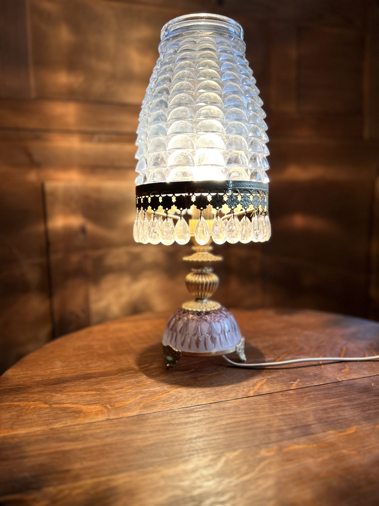 Ou II s’agit d’une lampe ancienne vintage chinée, avec une patine d’origine et des traces du temps normales à savoir 4 pampilles sont manquantes.