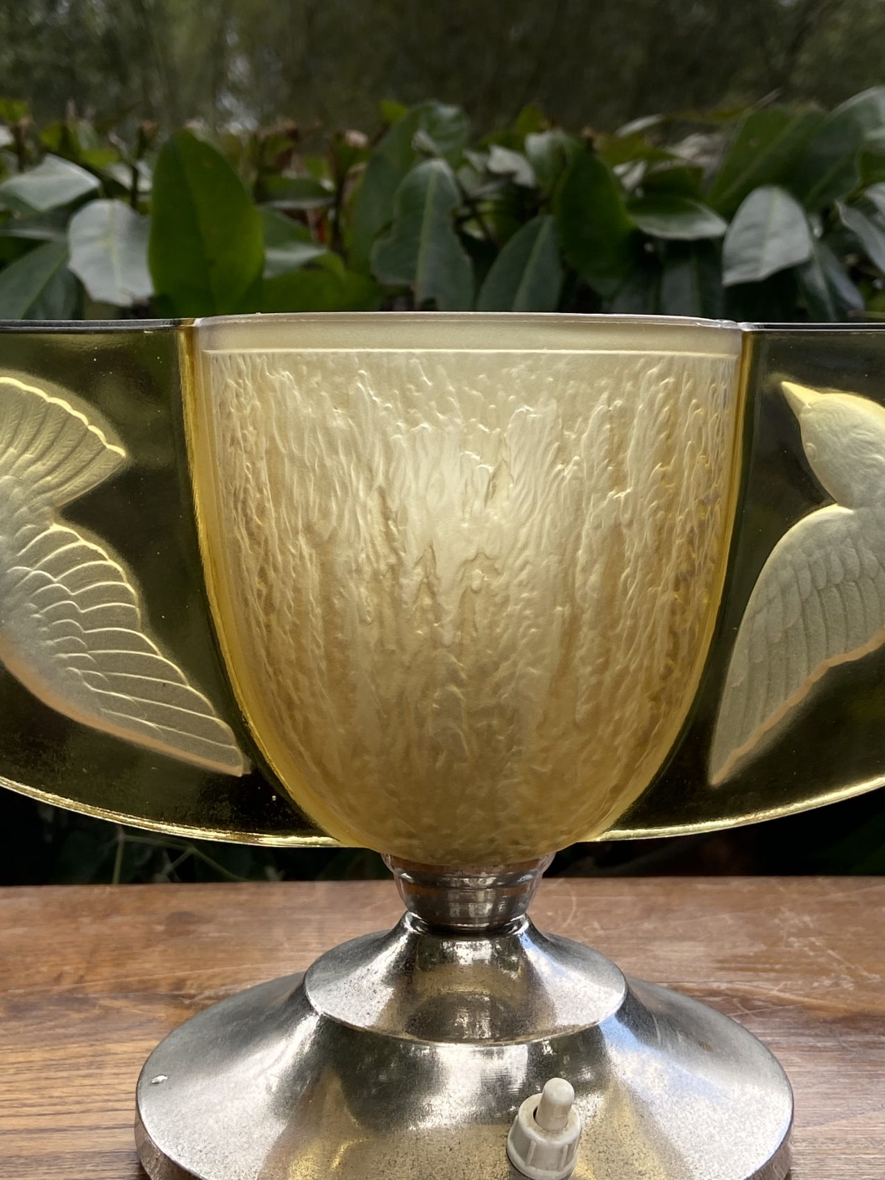 J’aime beaucoup cette lampe pour son motif atypique : les oiseaux Art Déco, c’est déjà rare, mais dans cette teinte dorée, c’est encore plus recherché.