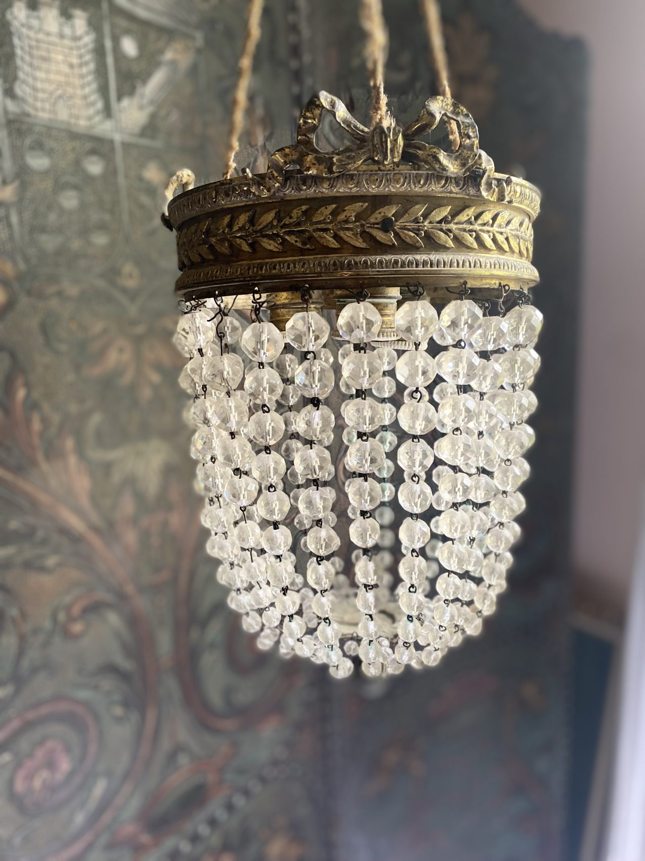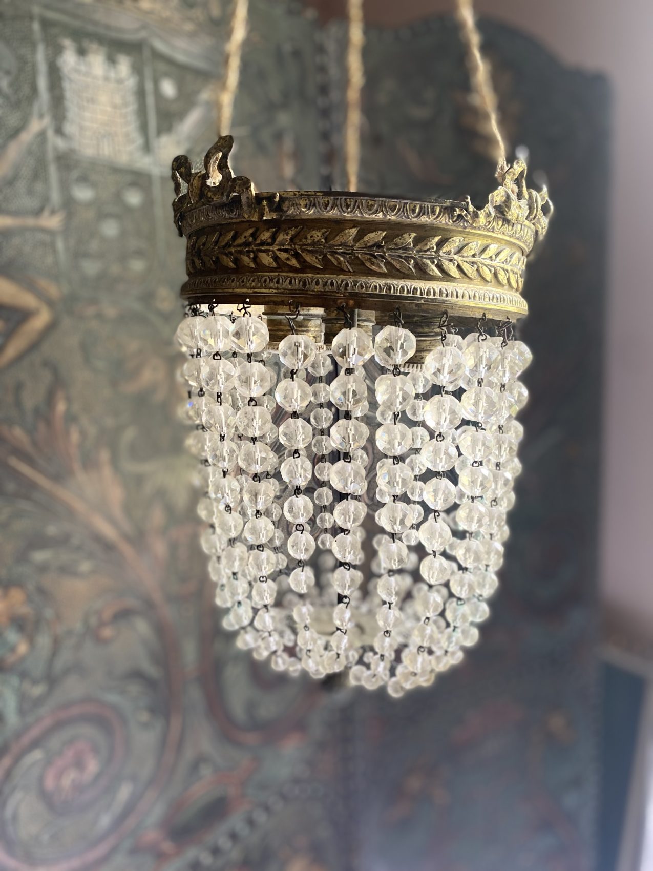 Son style Louis XVI affirmé, ses pampilles délicatement facettées et sa monture finement travaillée offrent un charme intemporel, un peu comme un air de noblesse suspendu dans l’air.
