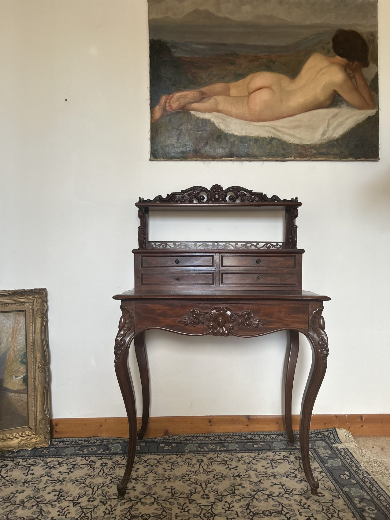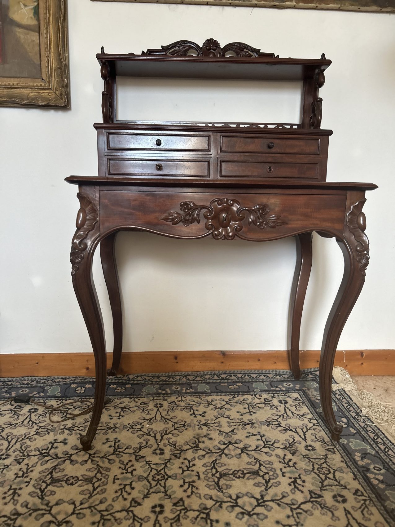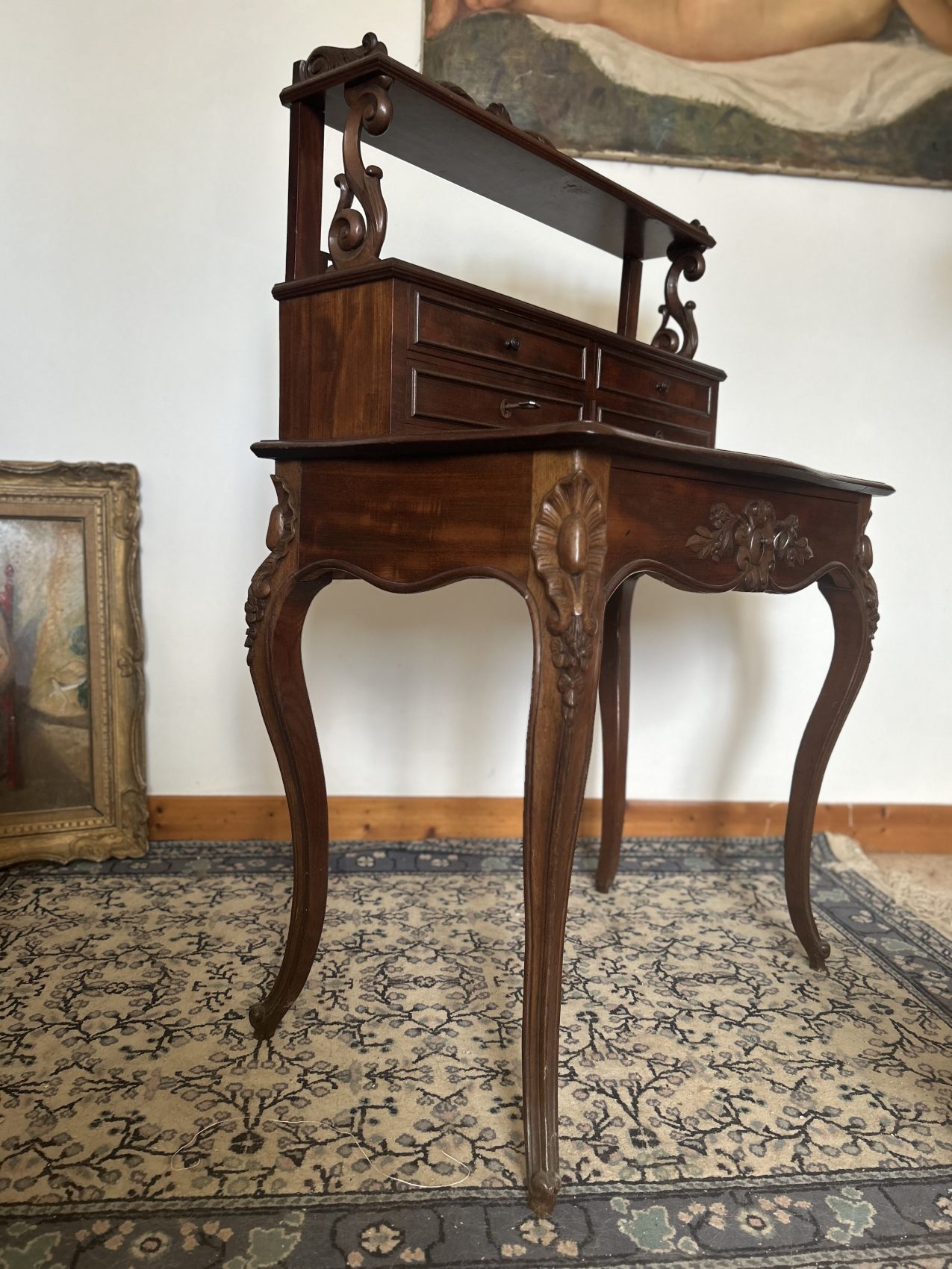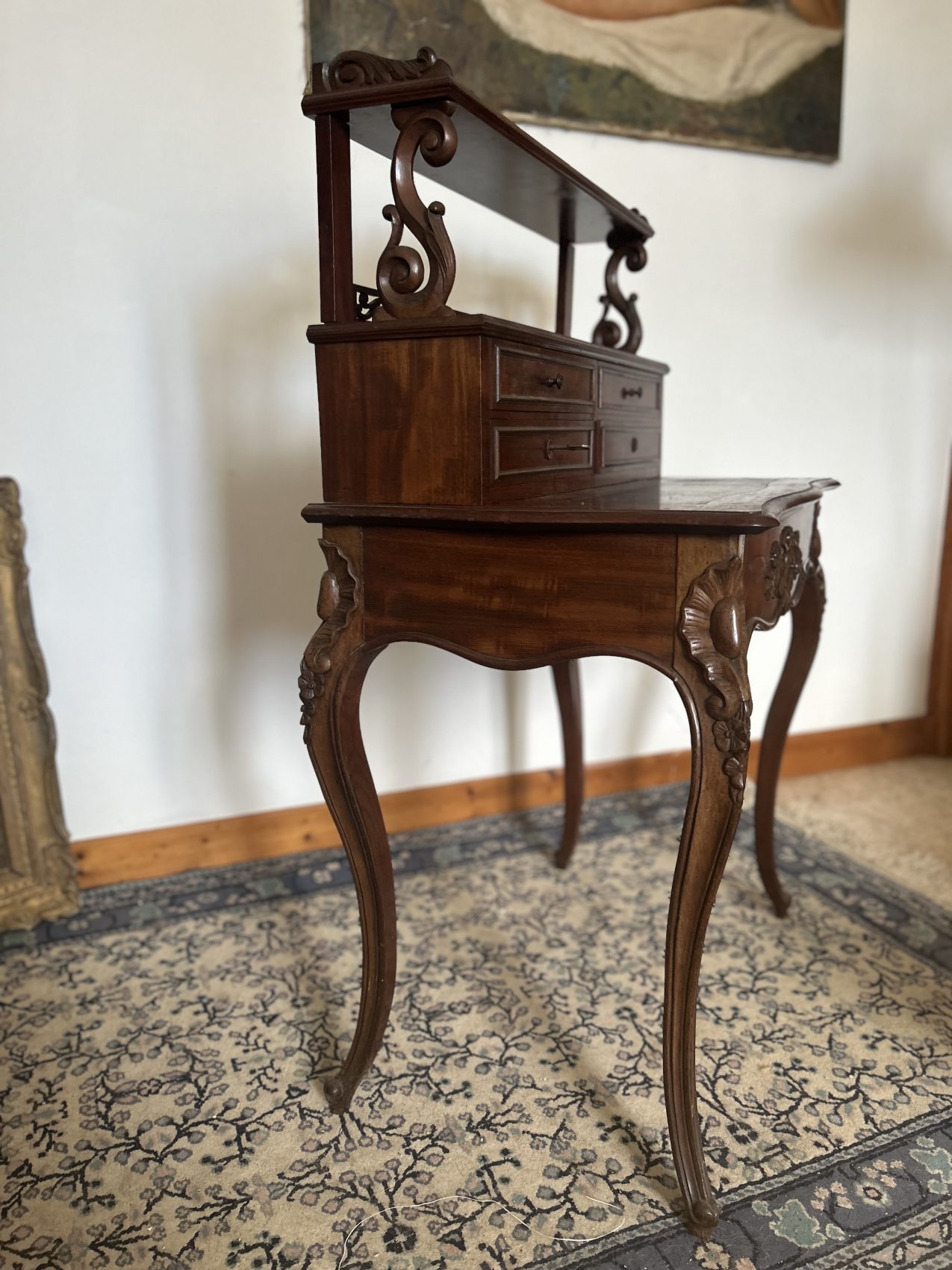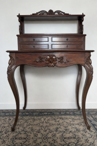 Un bonheur du jour ancien en acajou flammé, époque Napoléon III, style Louis XV vous l’aurez compris est un meuble rare et précieux, il est prêt à poursuivre une nouvelle histoire chez vous.