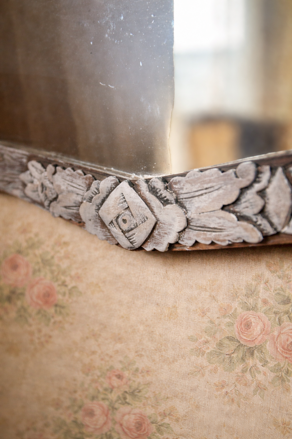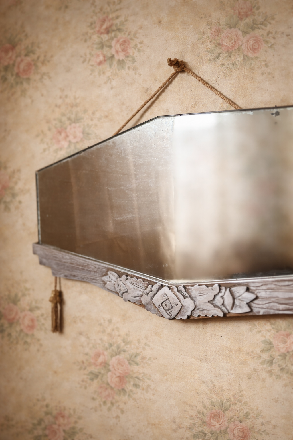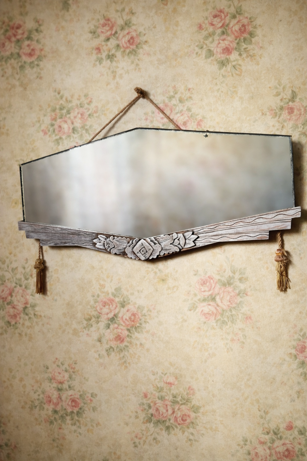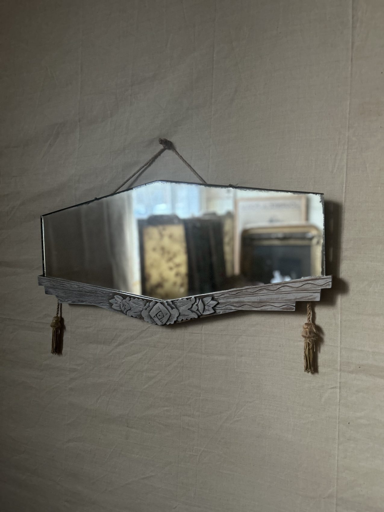 Miroir ancien époque Art déco en bois patiné crème atypique et plein de charme
