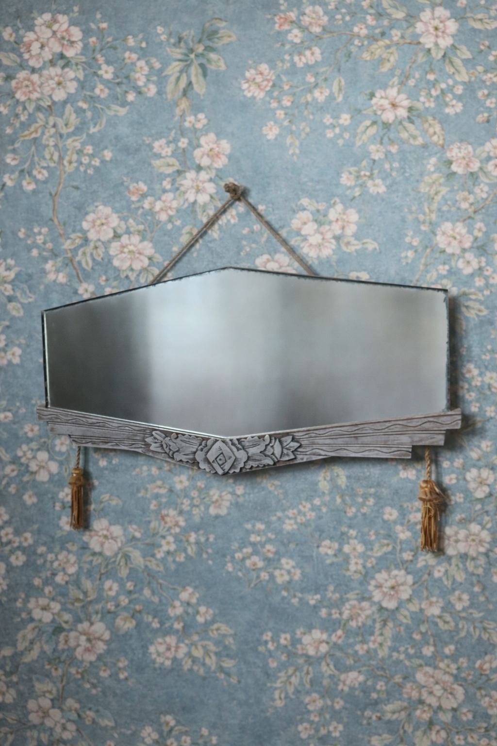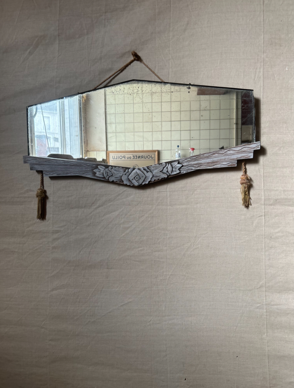 Le miroir est légèrement piqué, juste ce qu’il faut pour raconter le temps qui passe. les pompons sont d’origine le fil de suspension aussi. Si vous cherchez un miroir parfait, lisse, sans âme… passez votre chemin une réédition Art déco, ça n’existe pas ici, c’est du vrai du vécu du charmant.