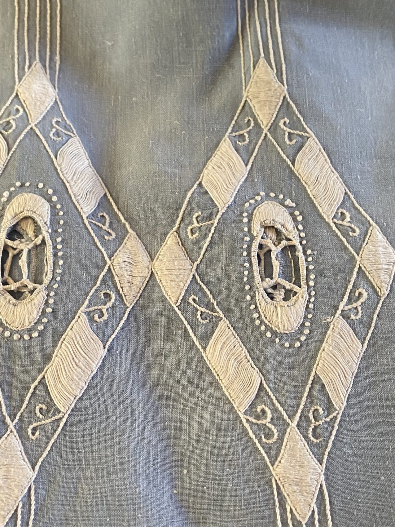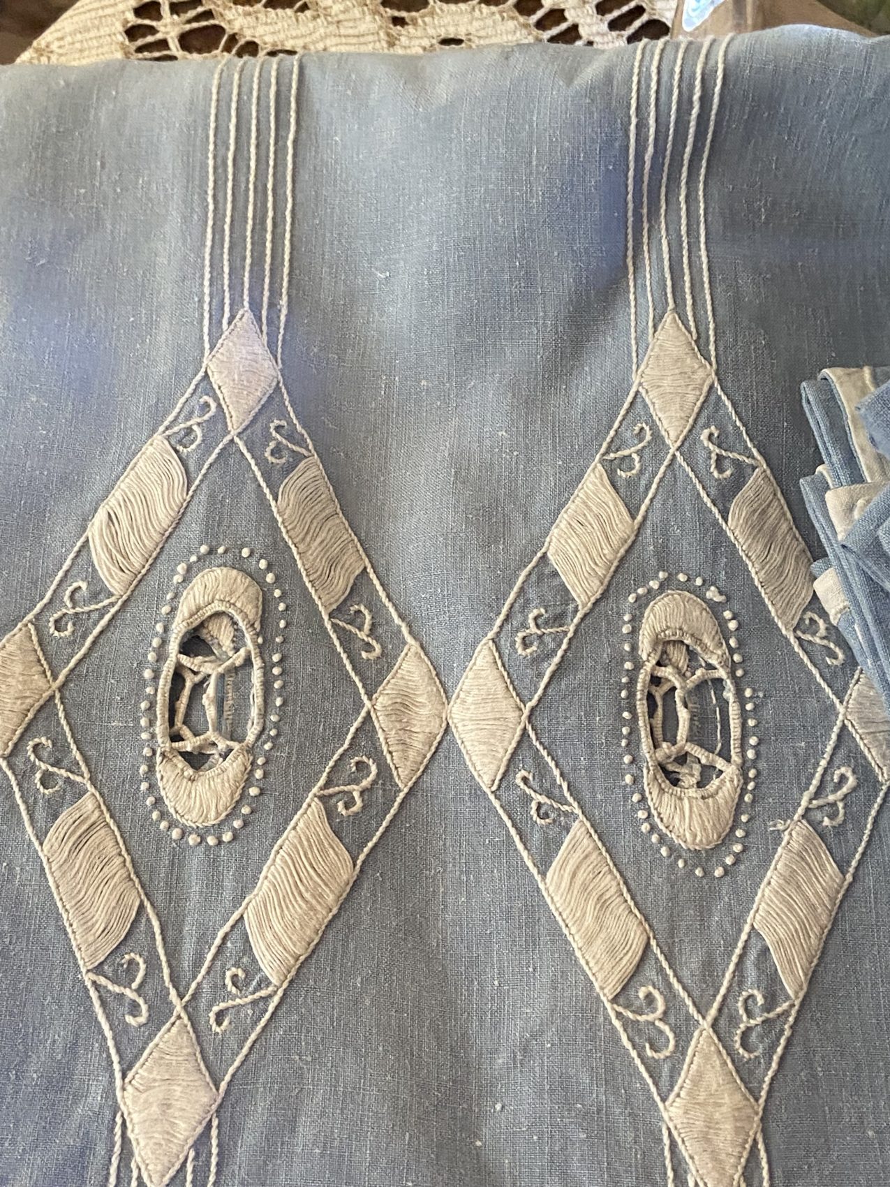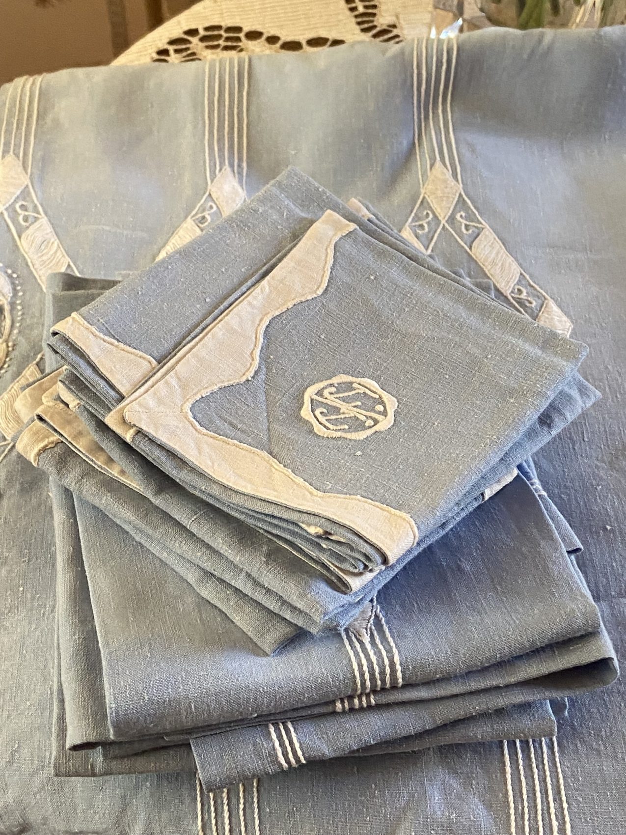 Un trésor de linge ancien, brodé main, pour les grandes tablées poétiques.