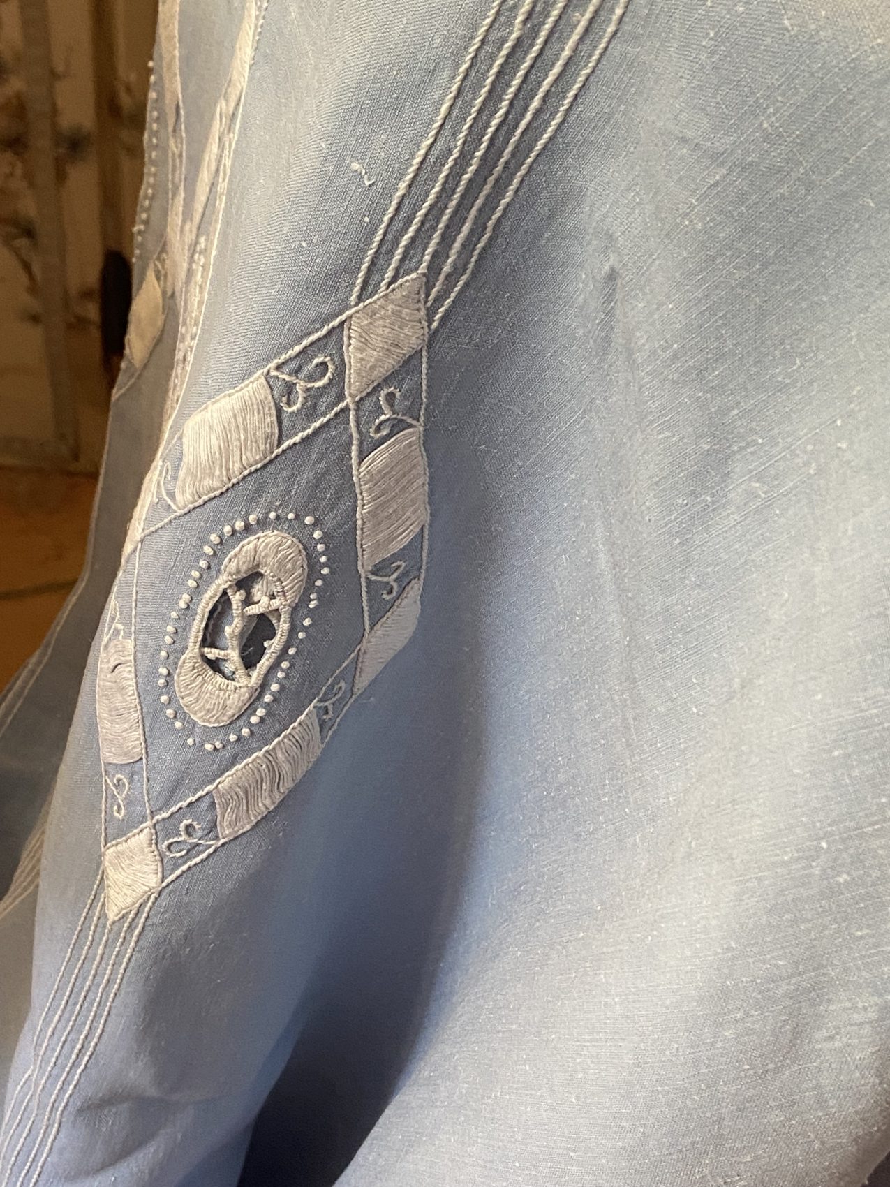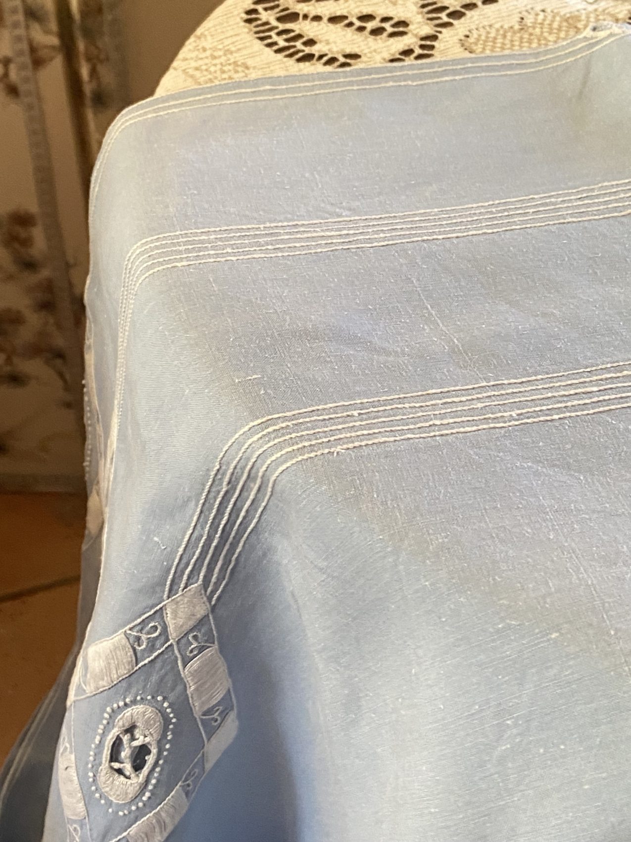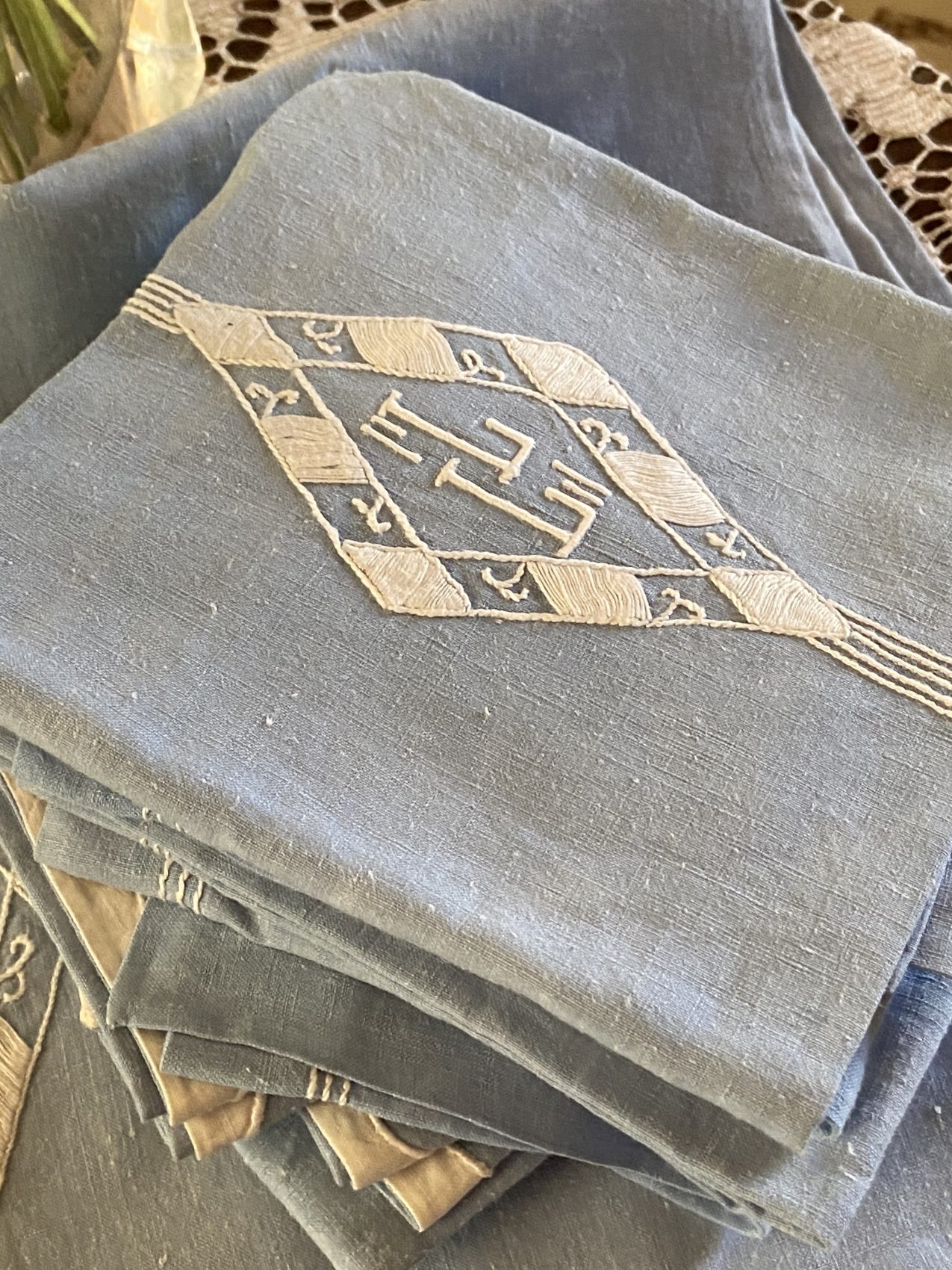 C’est le genre de pièce que je chine avec une vraie émotion. On imagine la patience qu’il a fallu pour broder à la main chaque lettre, chaque arabesque. Et ce bleu… si doux, si lumineux ! Le linge de maison comme celui-ci, ça ne court plus les brocantes. Il a ce charme sobre et chic à la fois, parfait pour une maison de famille ou un dîner entre amis où l’on veut du vrai, du beau, du durable. Et puis… le toucher ! Ce mélange lin/coton a cette densité souple, légèrement texturée, qu’on reconnaît les yeux fermés.