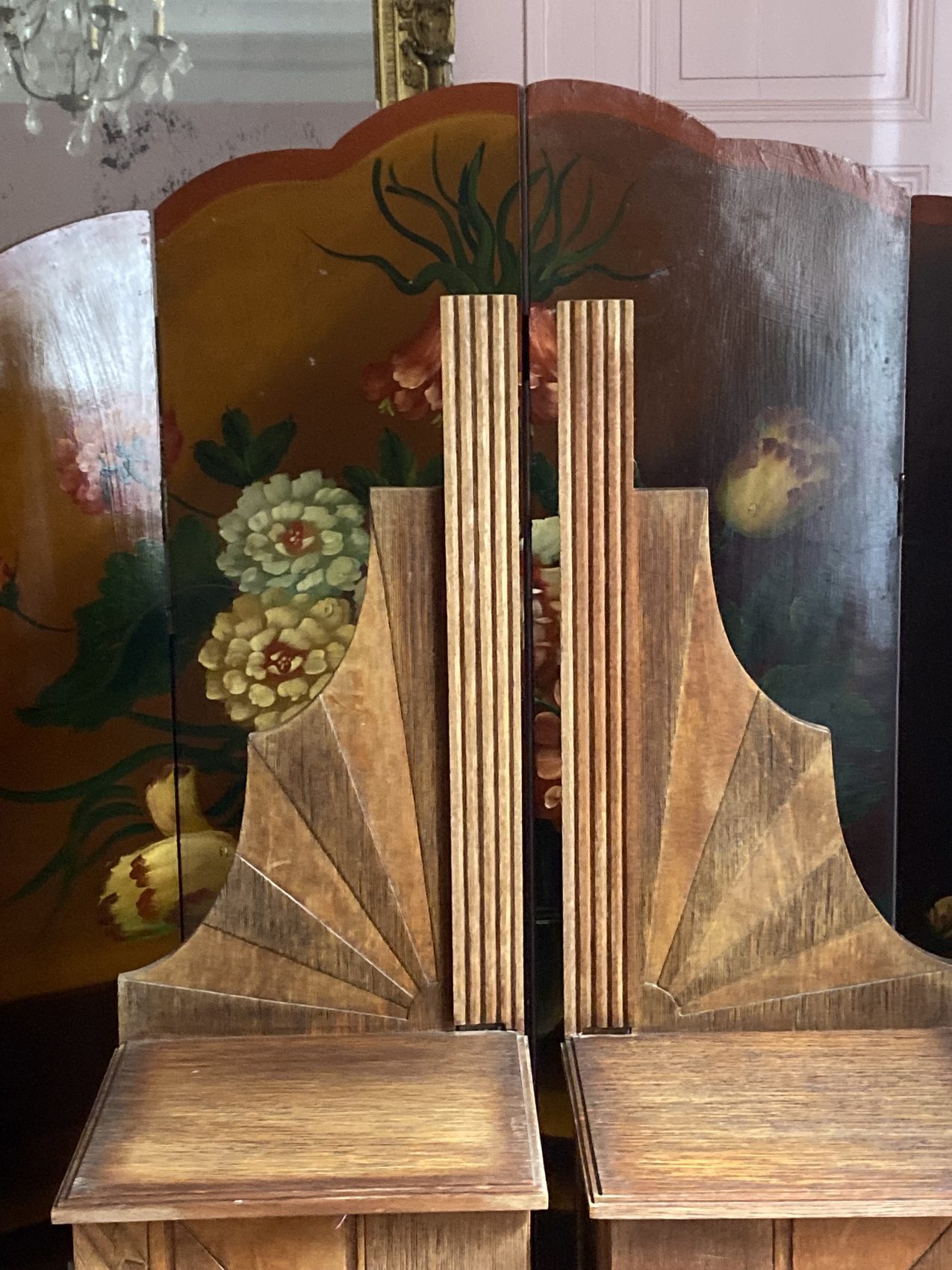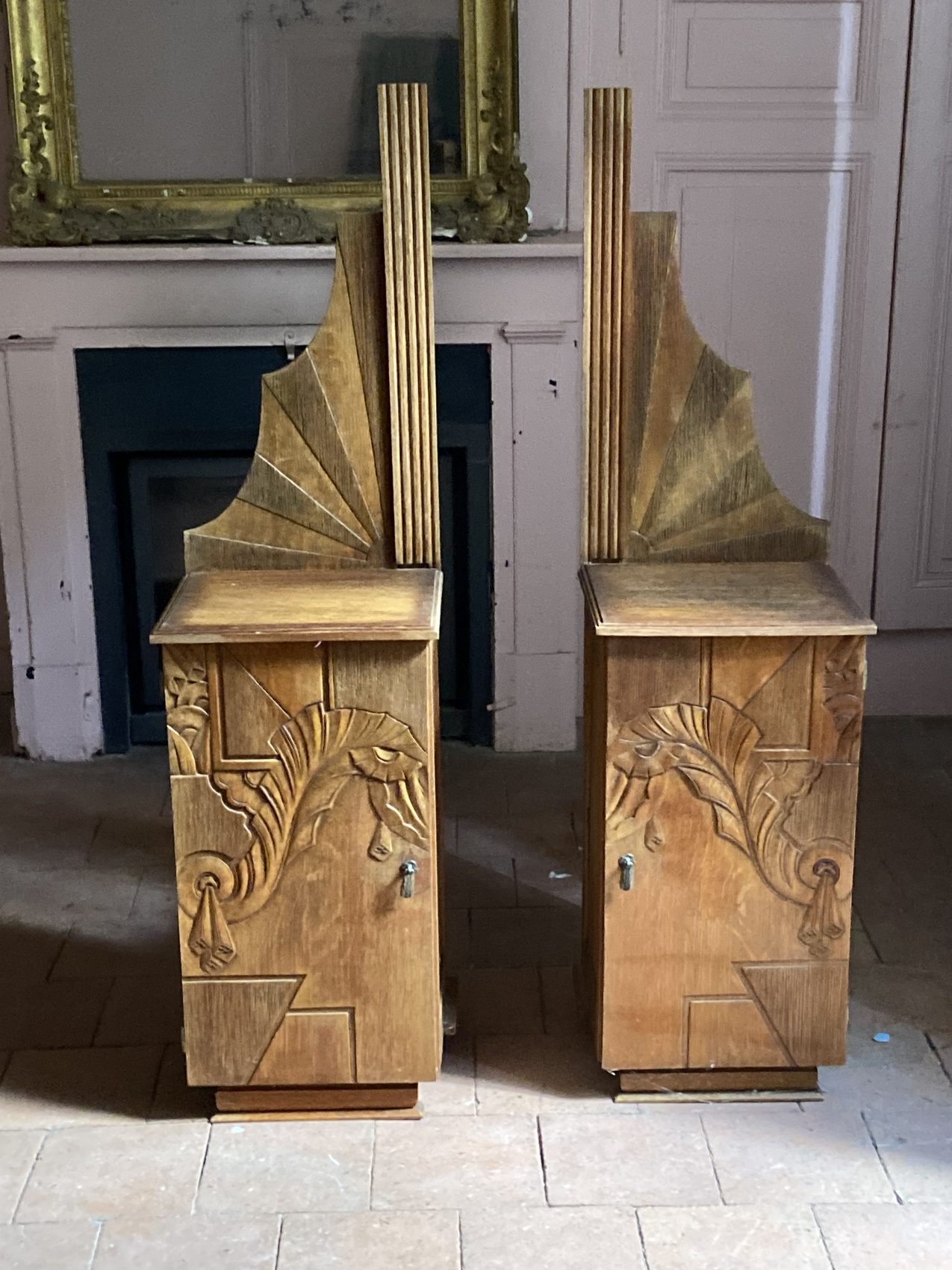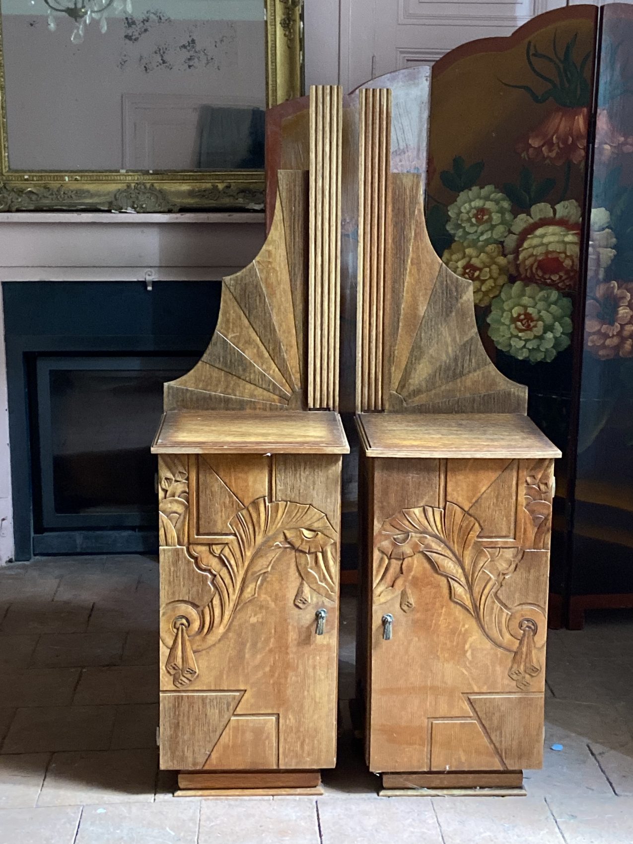 Réalisés en hêtre massif, ces chevets sont typiques des années 30 : reliefs sculptés en façade, motifs stylisés (feuilles, éventails, filets verticaux) et proportions audacieuses. L’un possède une étagère intérieure, l’autre non.