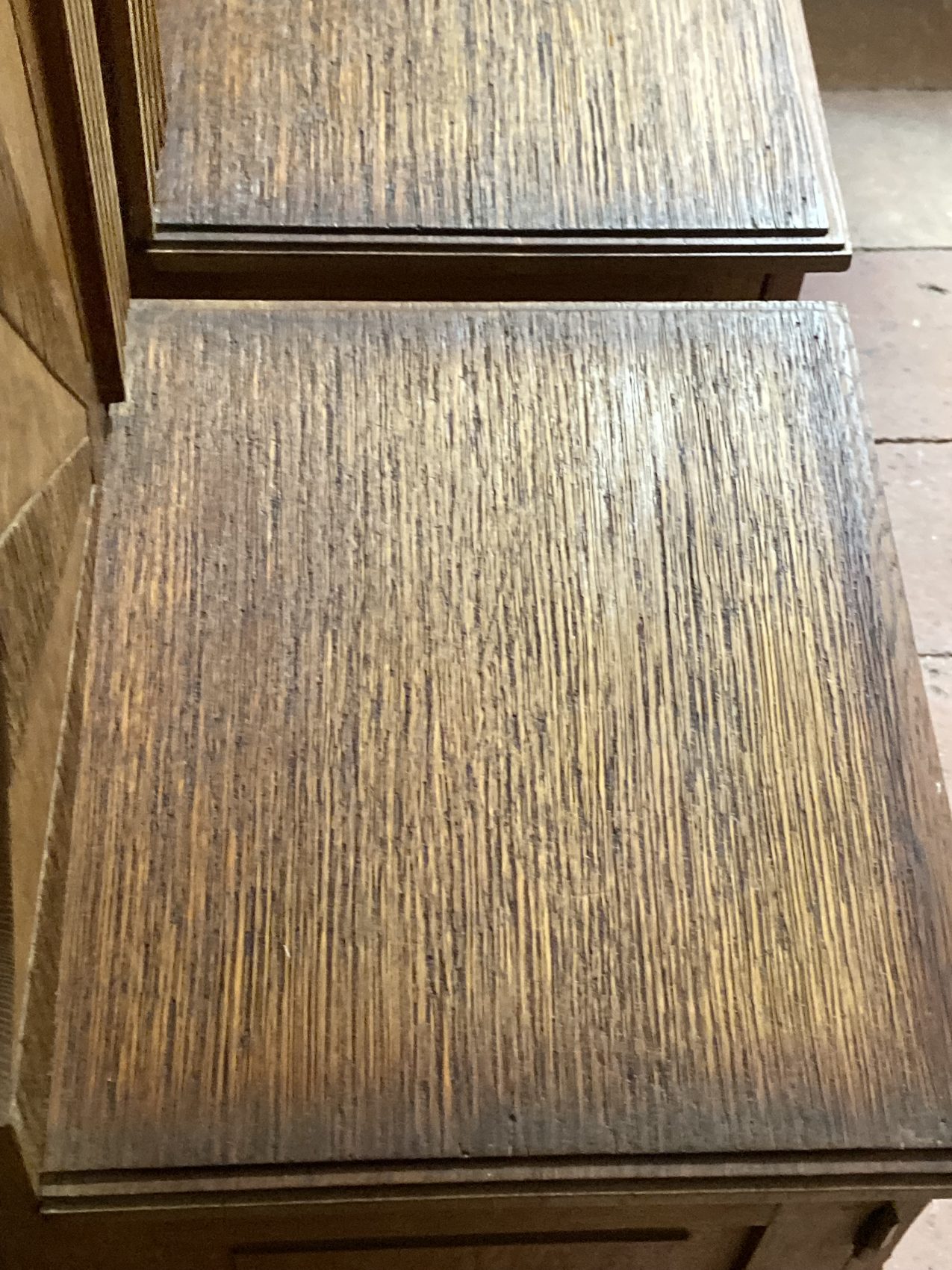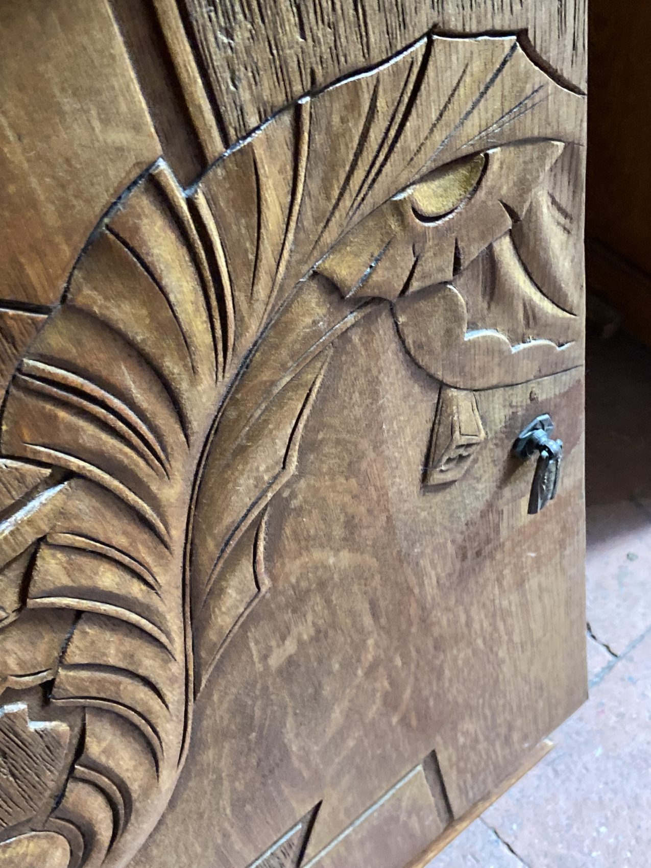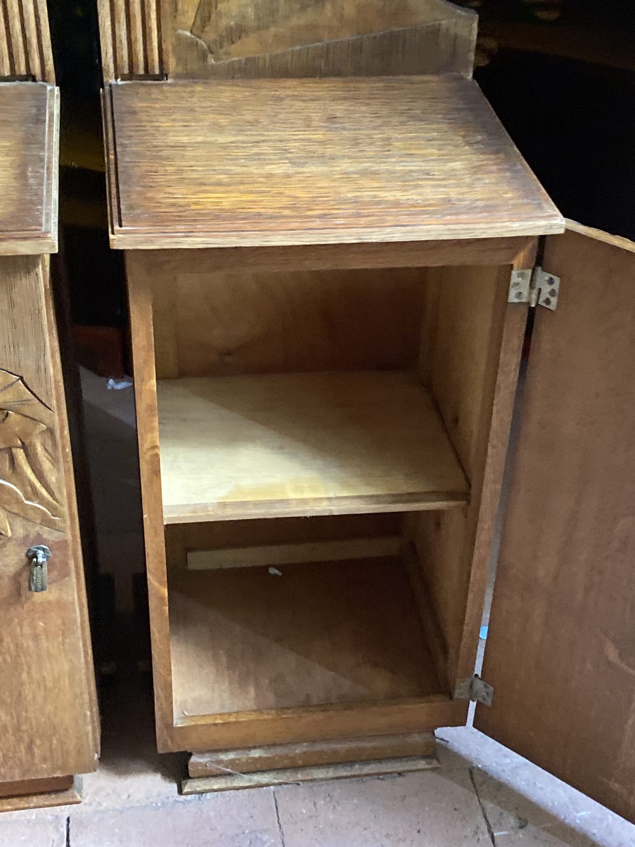 Réalisés en hêtre massif, ces chevets sont typiques des années 30 : reliefs sculptés en façade, motifs stylisés (feuilles, éventails, filets verticaux) et proportions audacieuses. L’un possède une étagère intérieure, l’autre non.