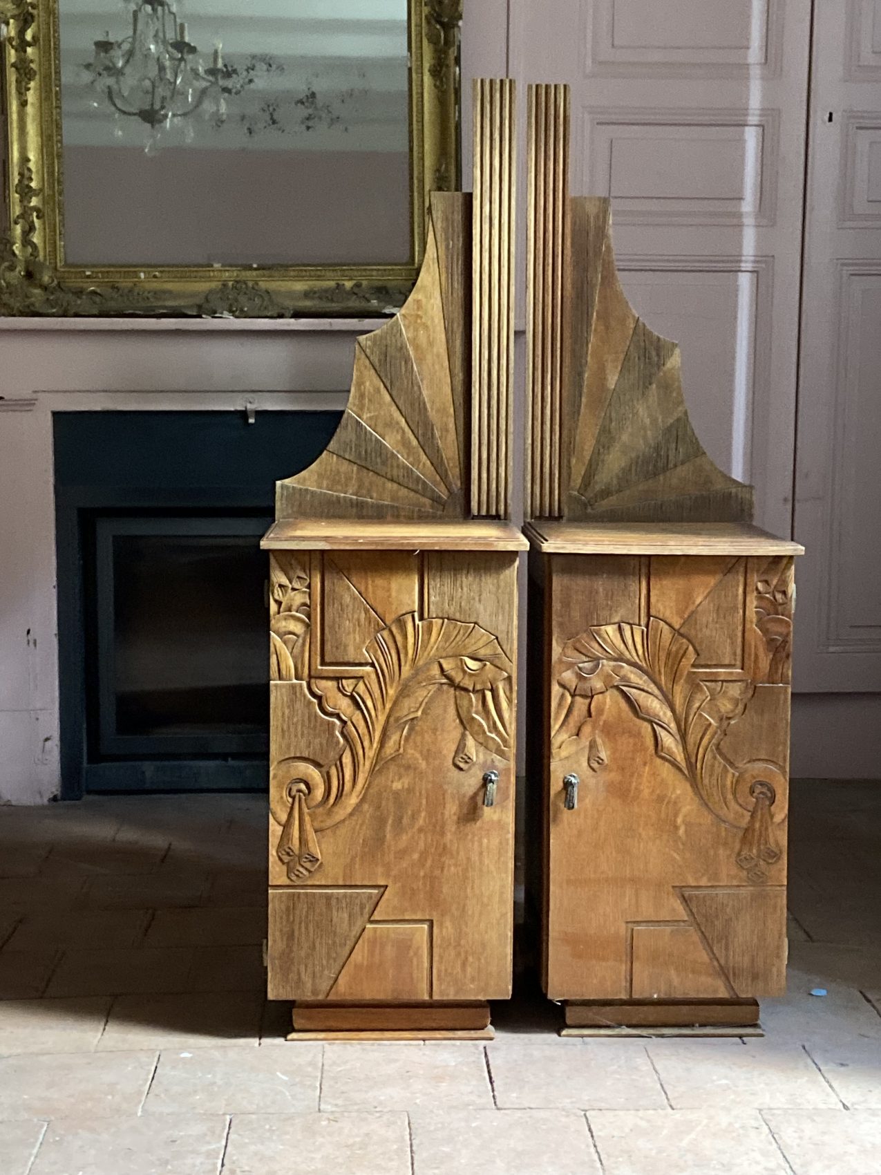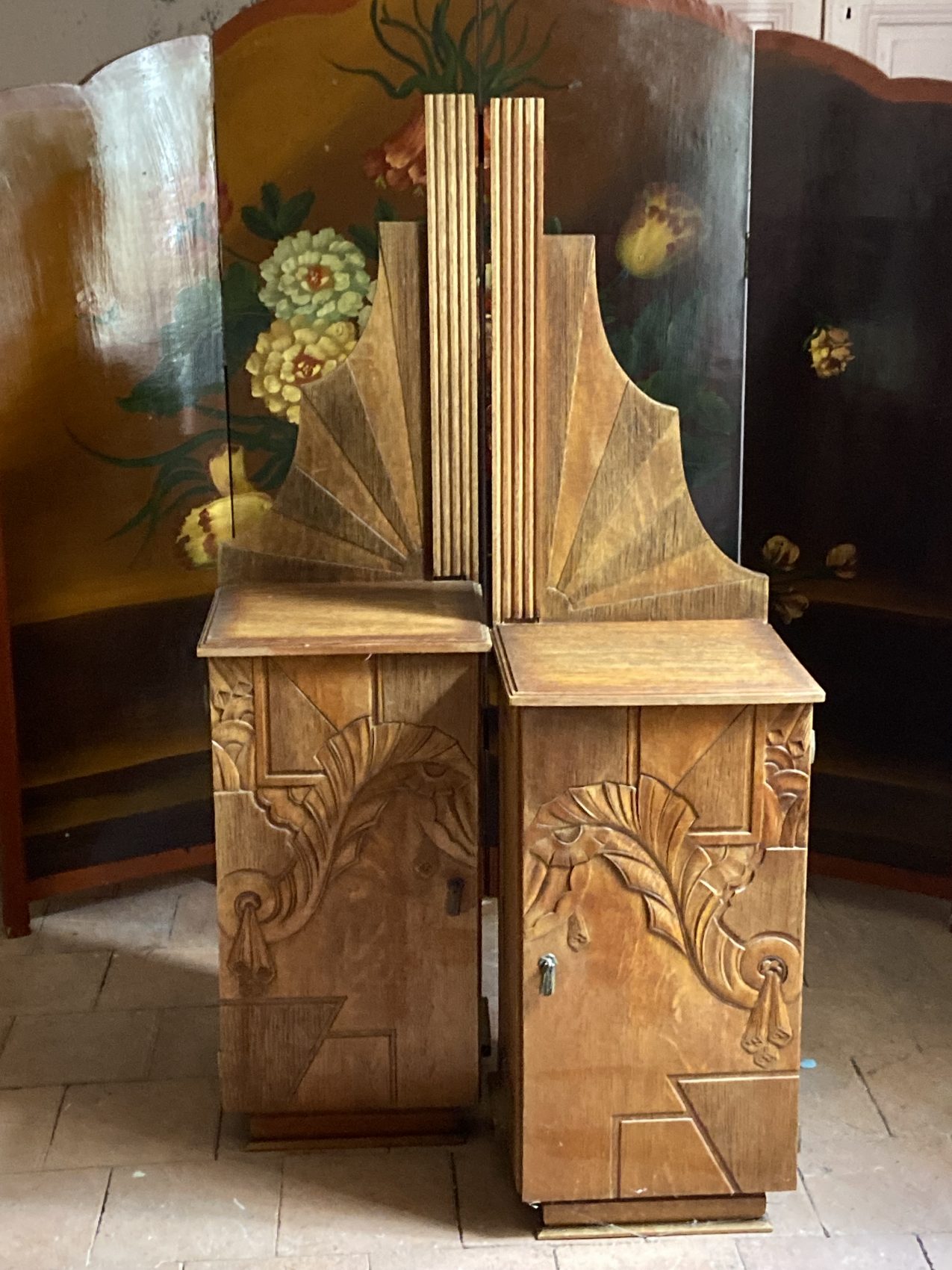 Paire de chevets Art déco sculptés – en hêtre massif une rareté atypique très chic !