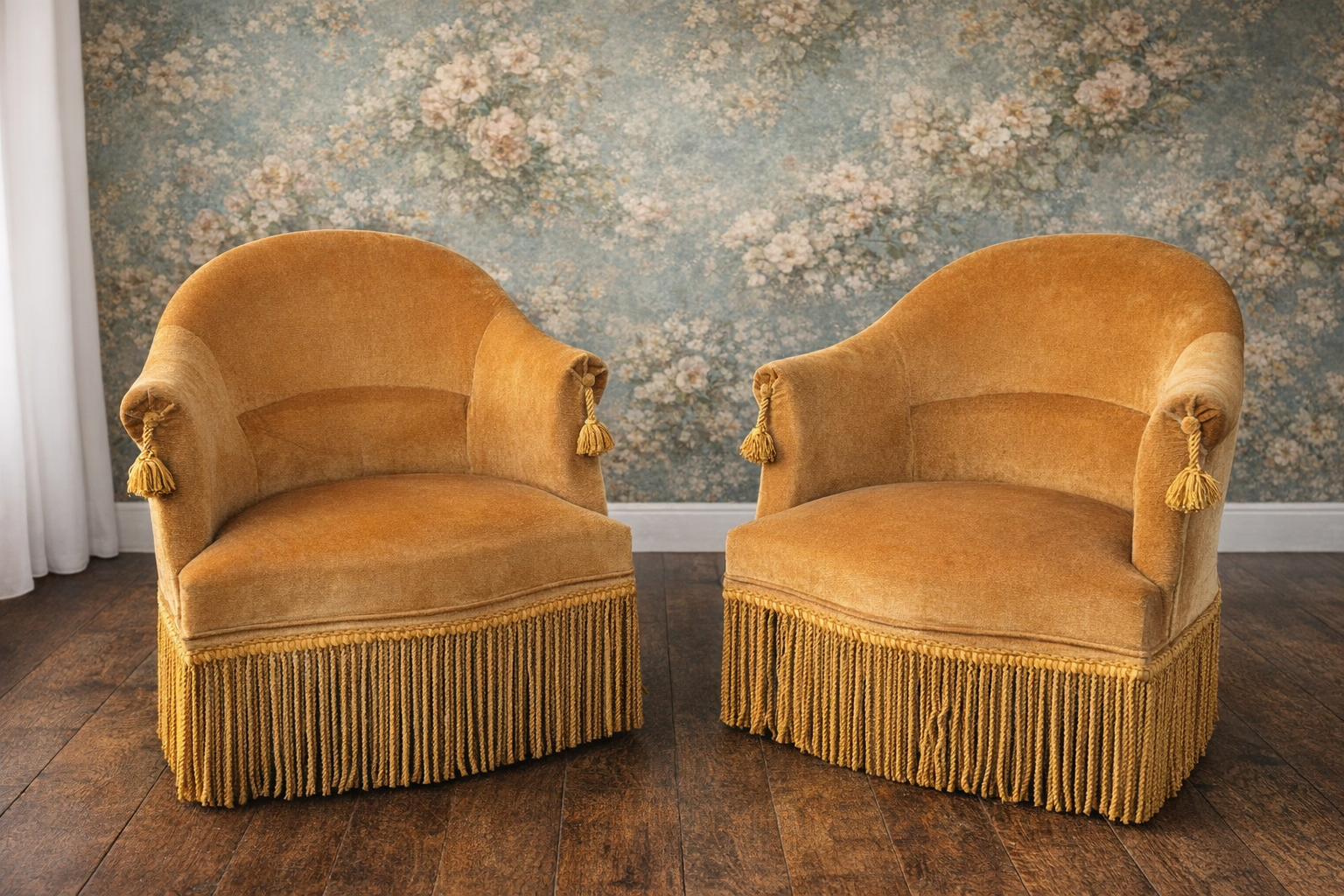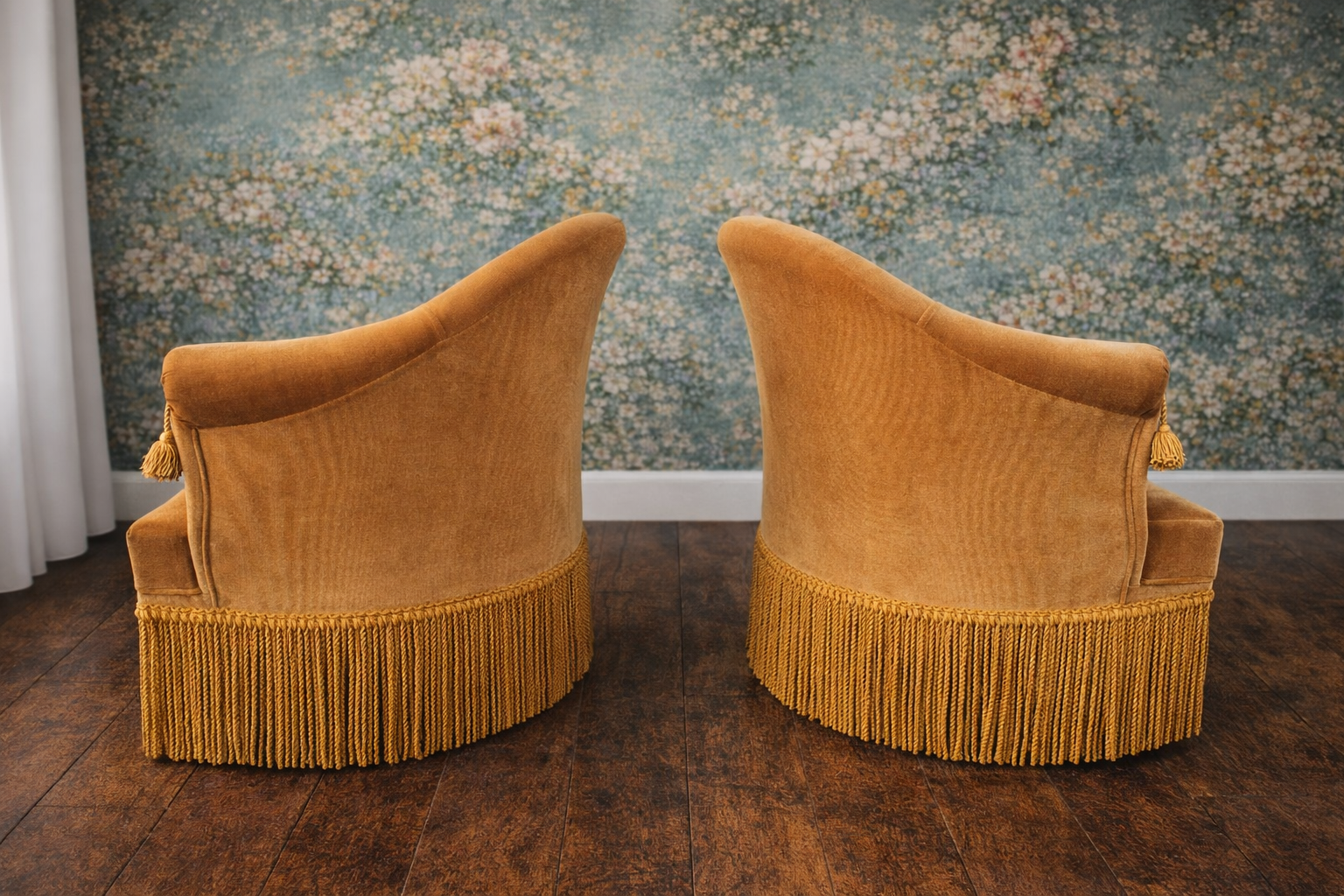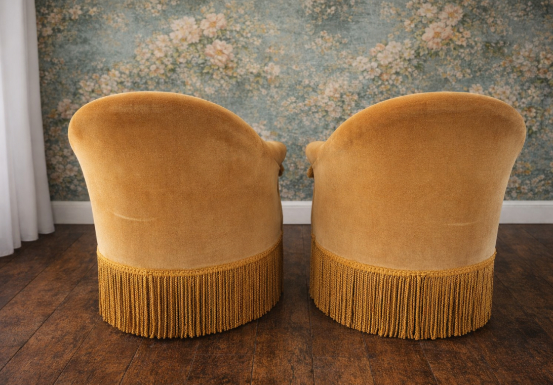 Paire de fauteuils crapauds vintage velours, jaune soleil