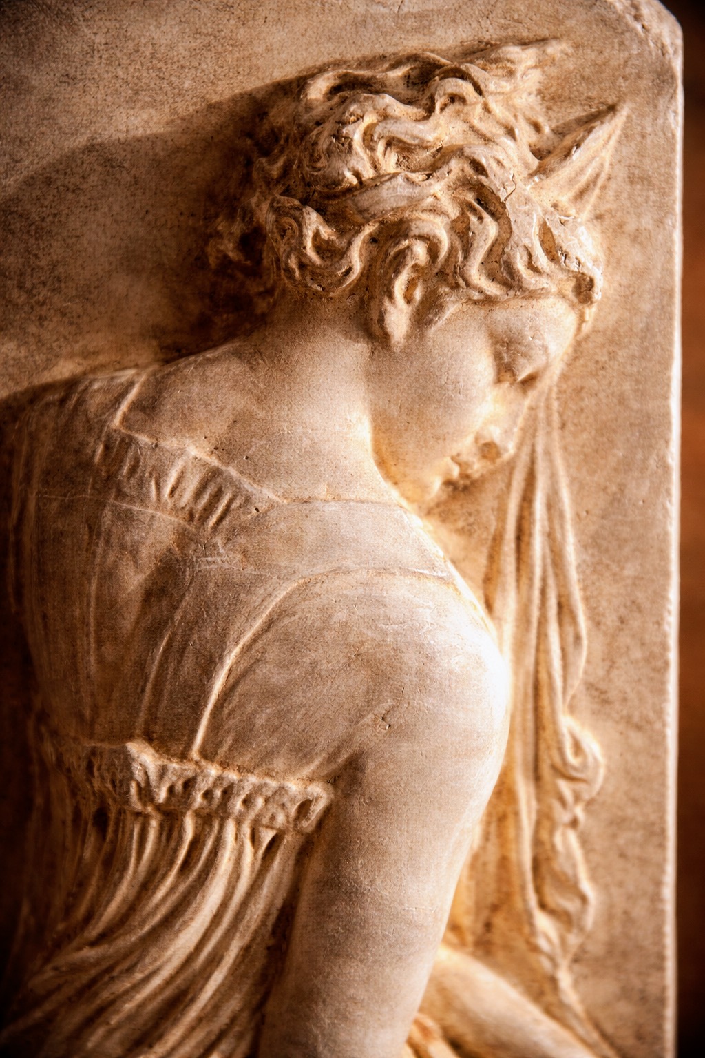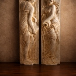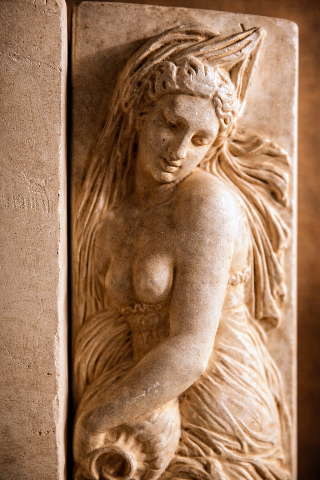 Ces panneaux décoratifs en plâtre mettent en scène deux femmes à l’esthétique antique. Le travail du relief est délicat : les plis des étoffes, la douceur des visages, le mouvement des cheveux… Tout y est.
