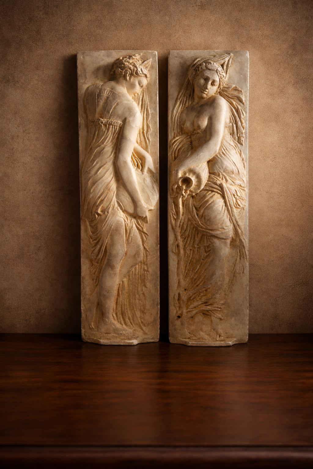 Voici un duo de panneaux muraux en plâtre sculpté à l’antique, représentant deux figures féminines inspirées de l’art classique. Drapés fluides, chevelures ondoyantes, poses gracieuses… On dirait qu’elles sortent tout droit d’une villa italienne.