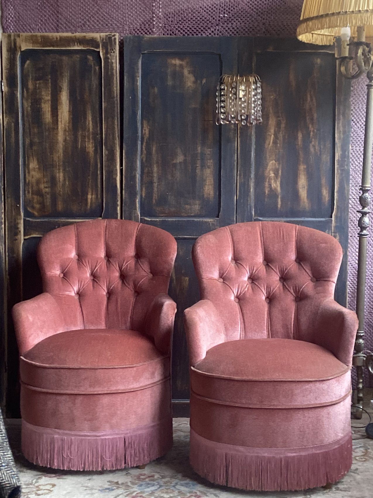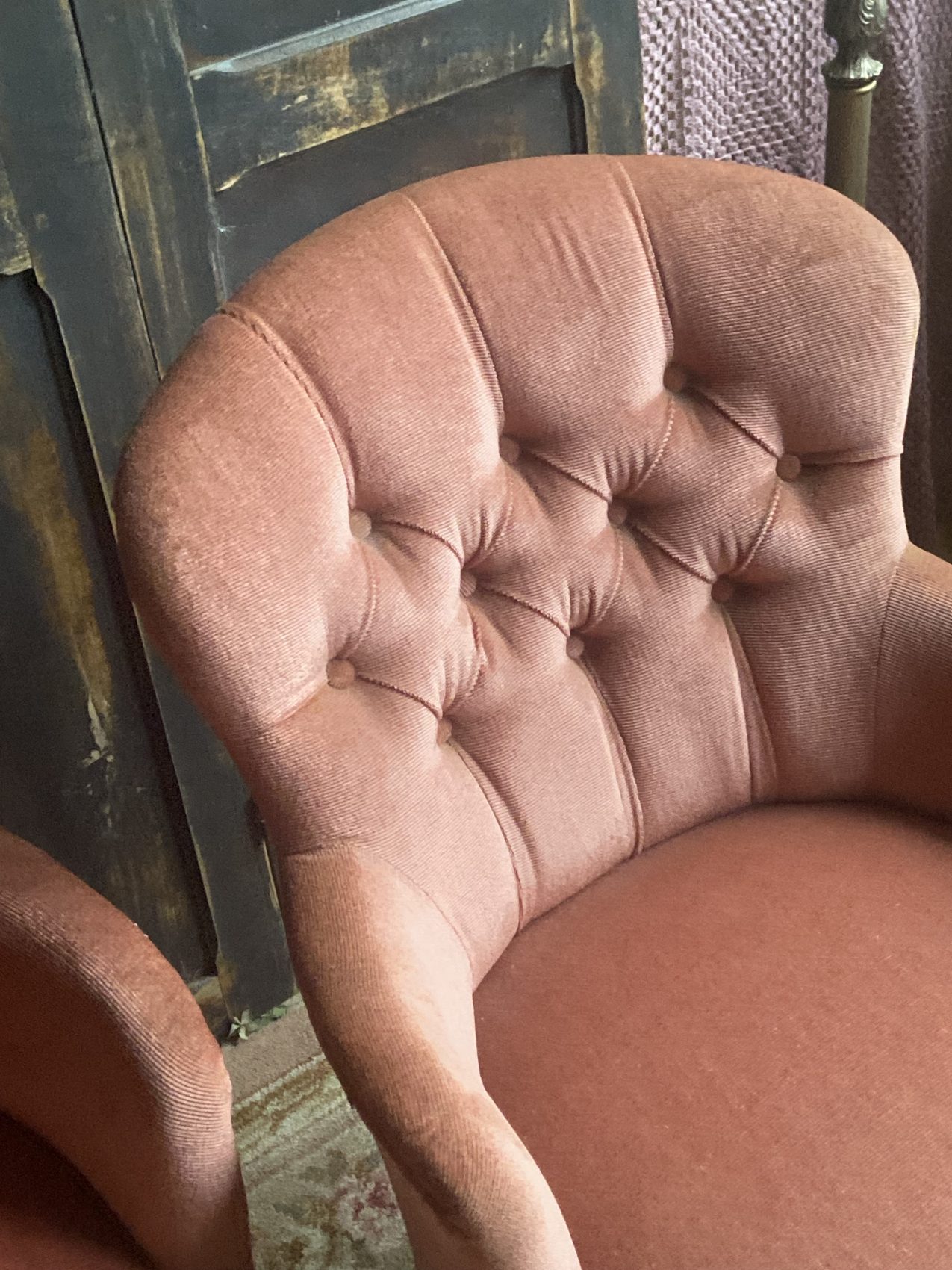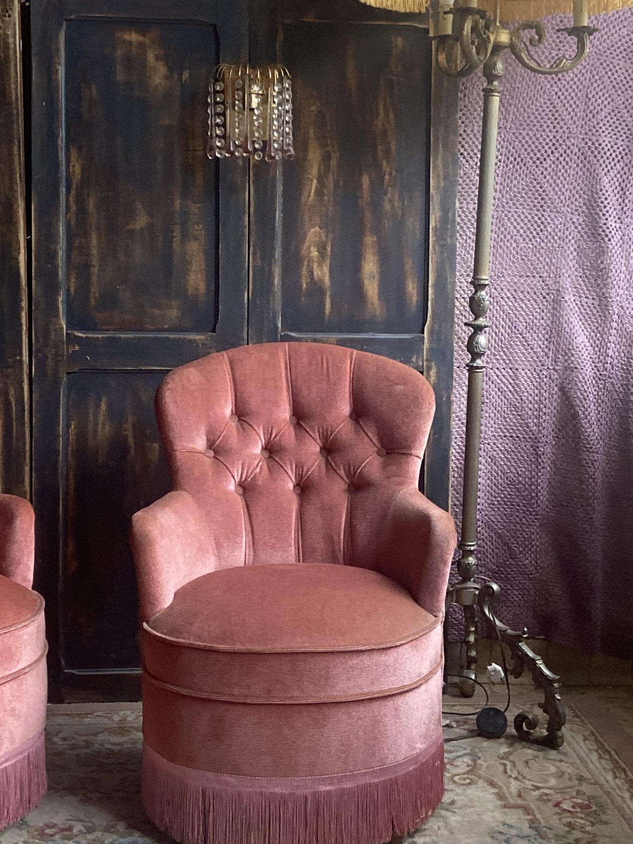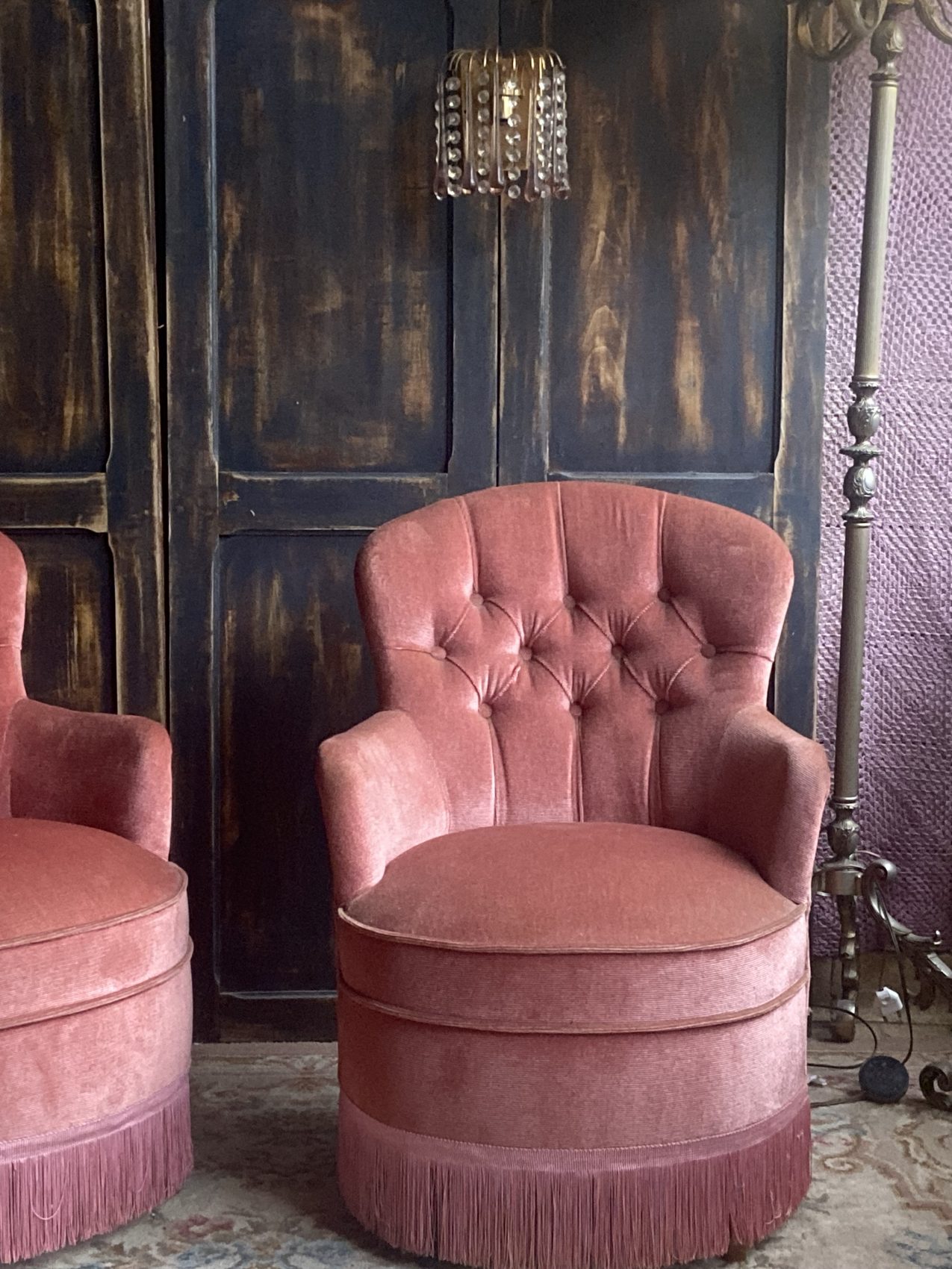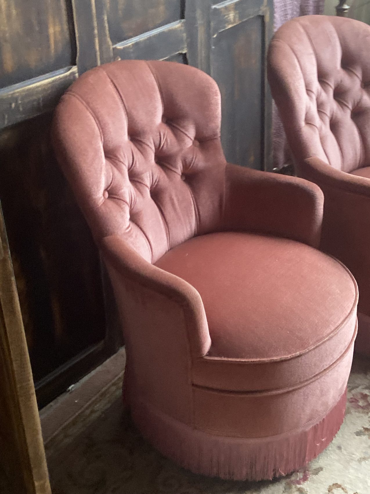 Paire de fauteuils crapauds capitonnés vintage en velours vieux rose – Années 60